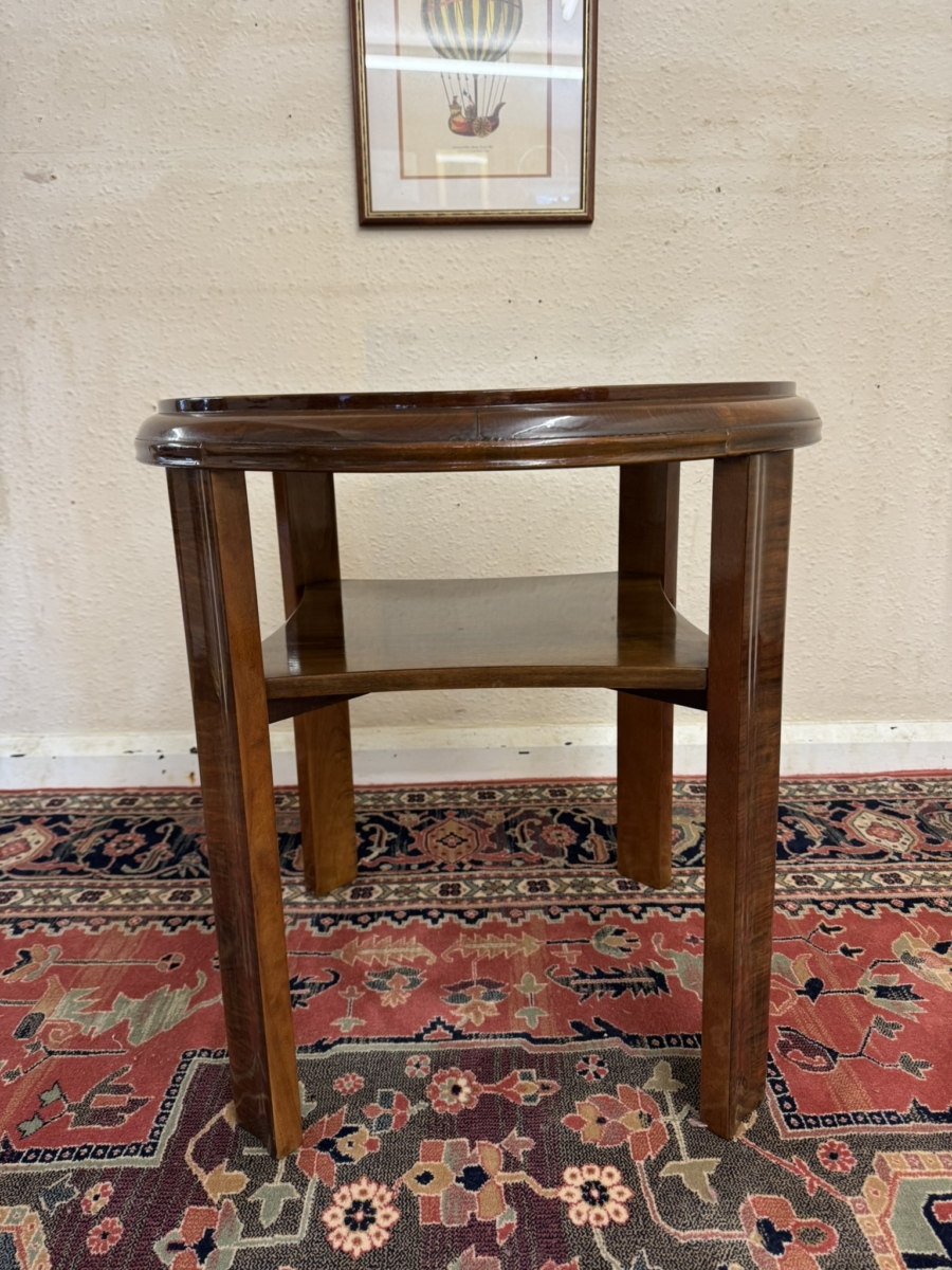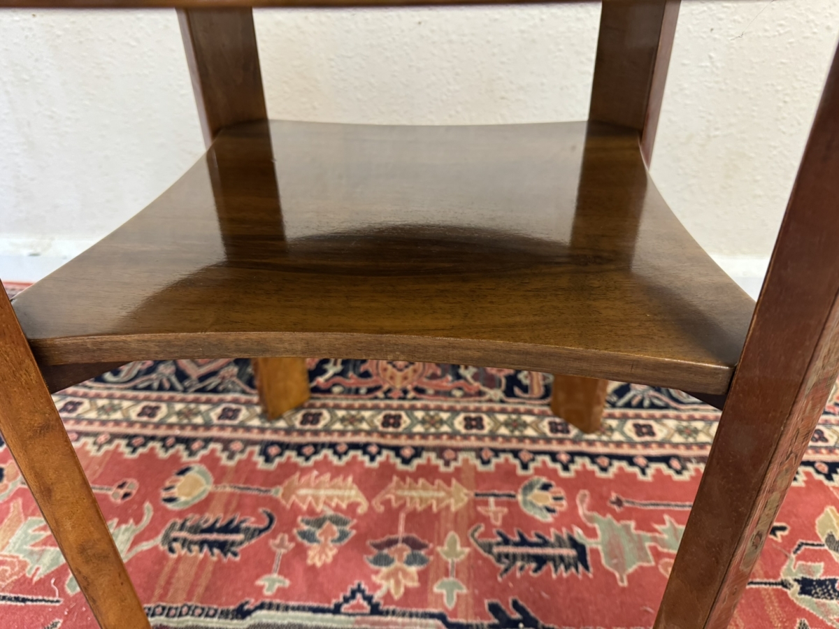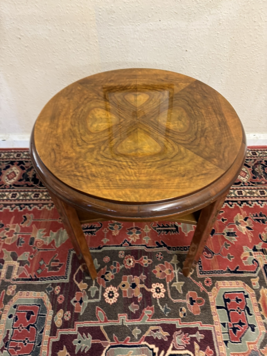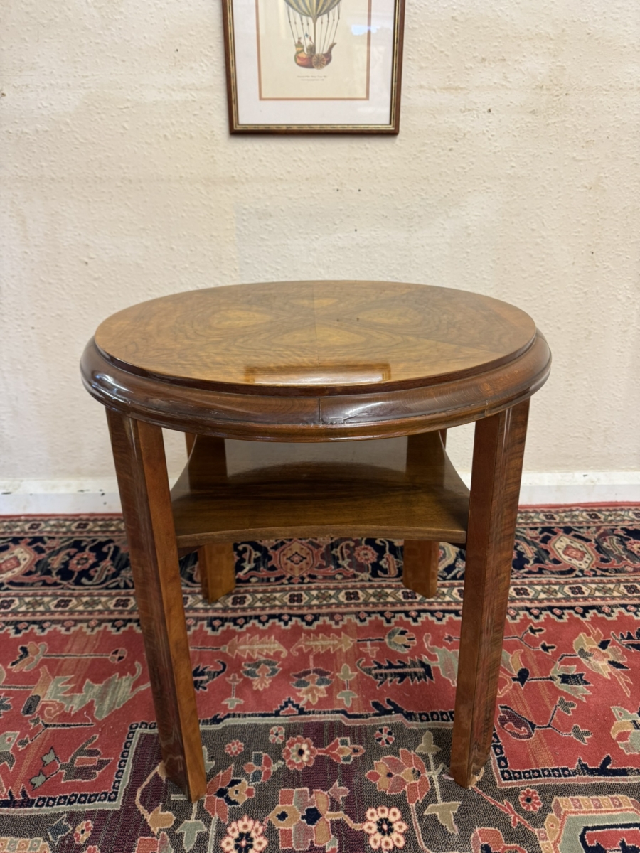 This stylish walnut accent table dates circa 1930. The striking quartered walnut top has a shelf below and stands on four slightly curved legs.