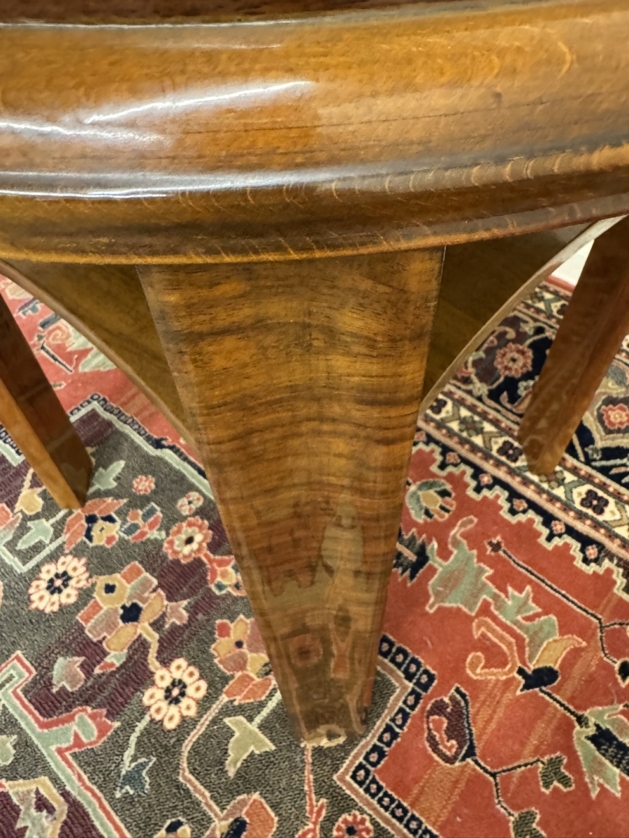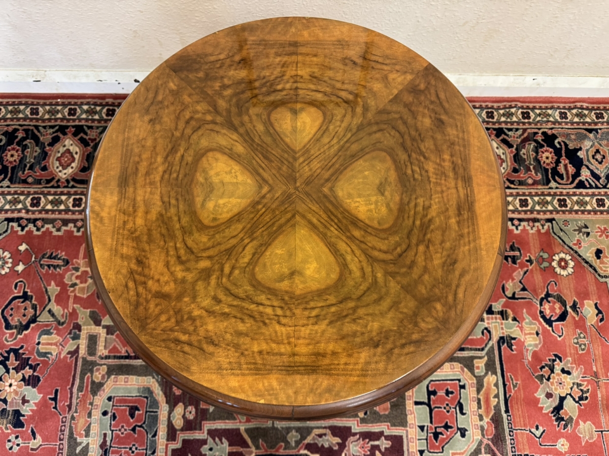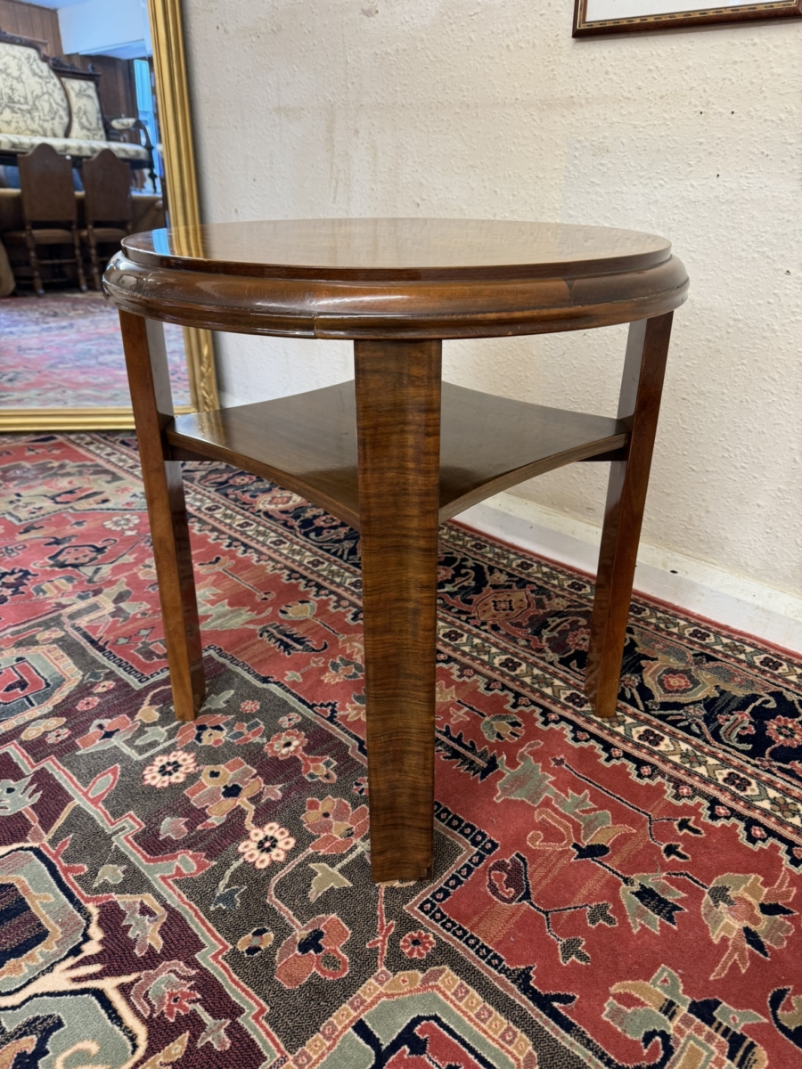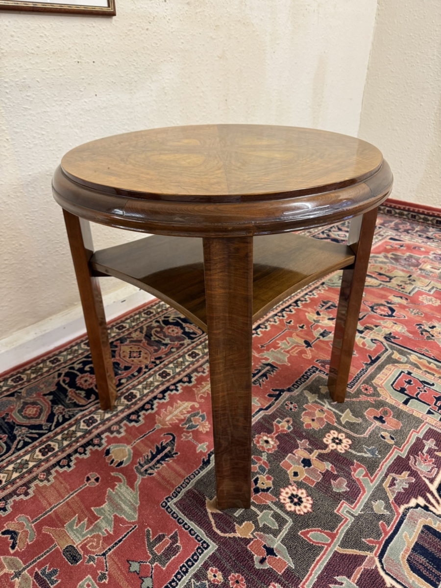 This stylish walnut accent table dates circa 1930. The striking quartered walnut top has a shelf below and stands on four slightly curved legs.