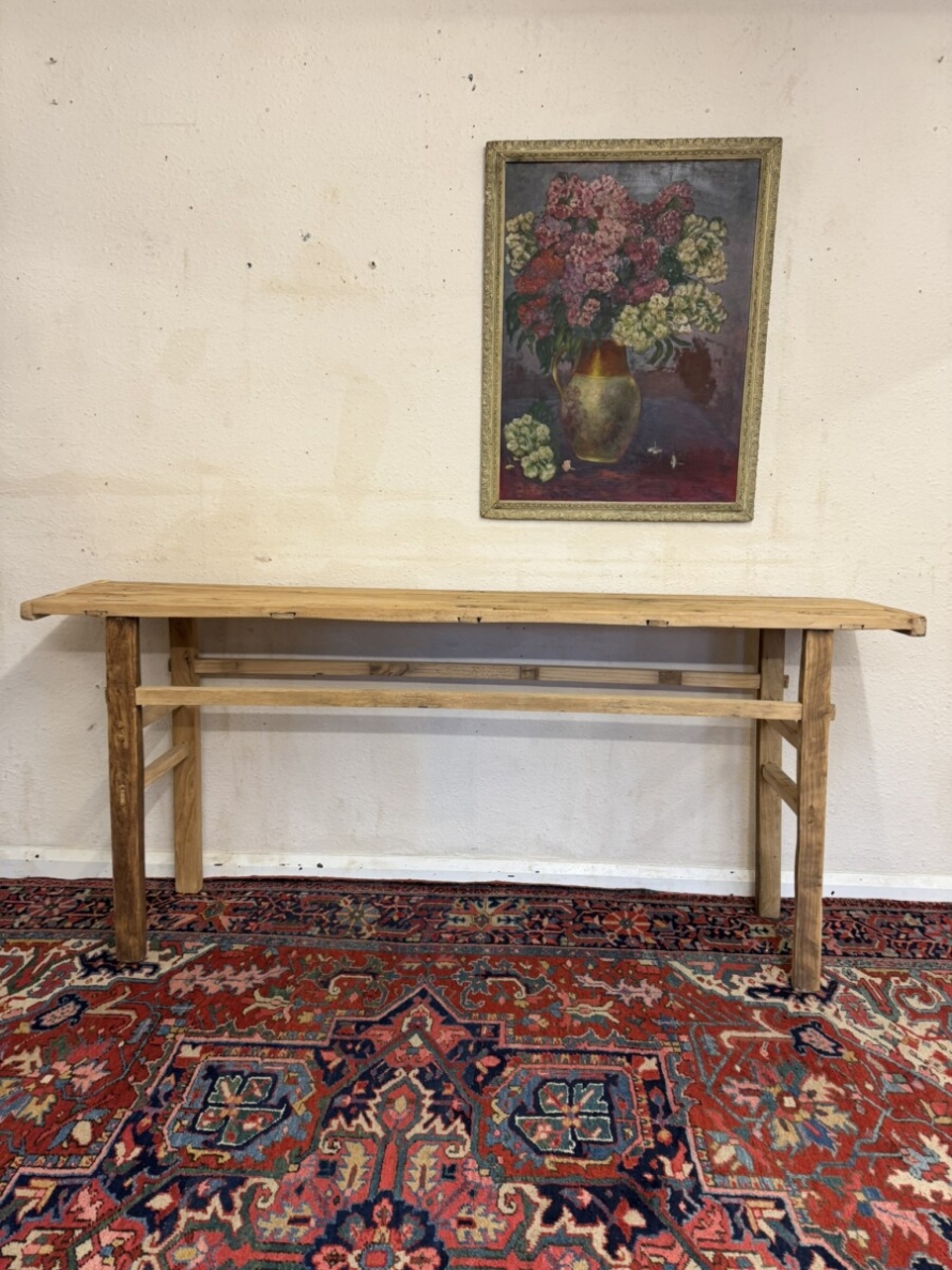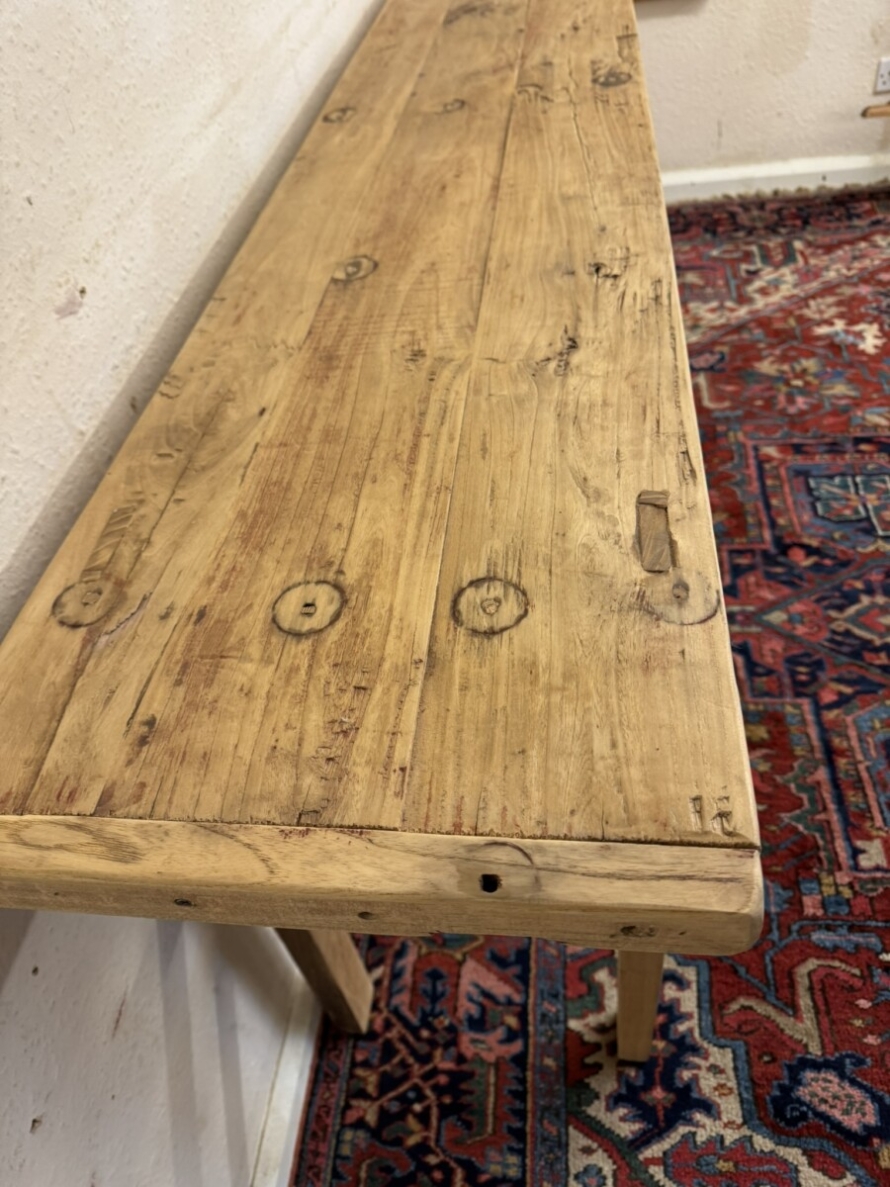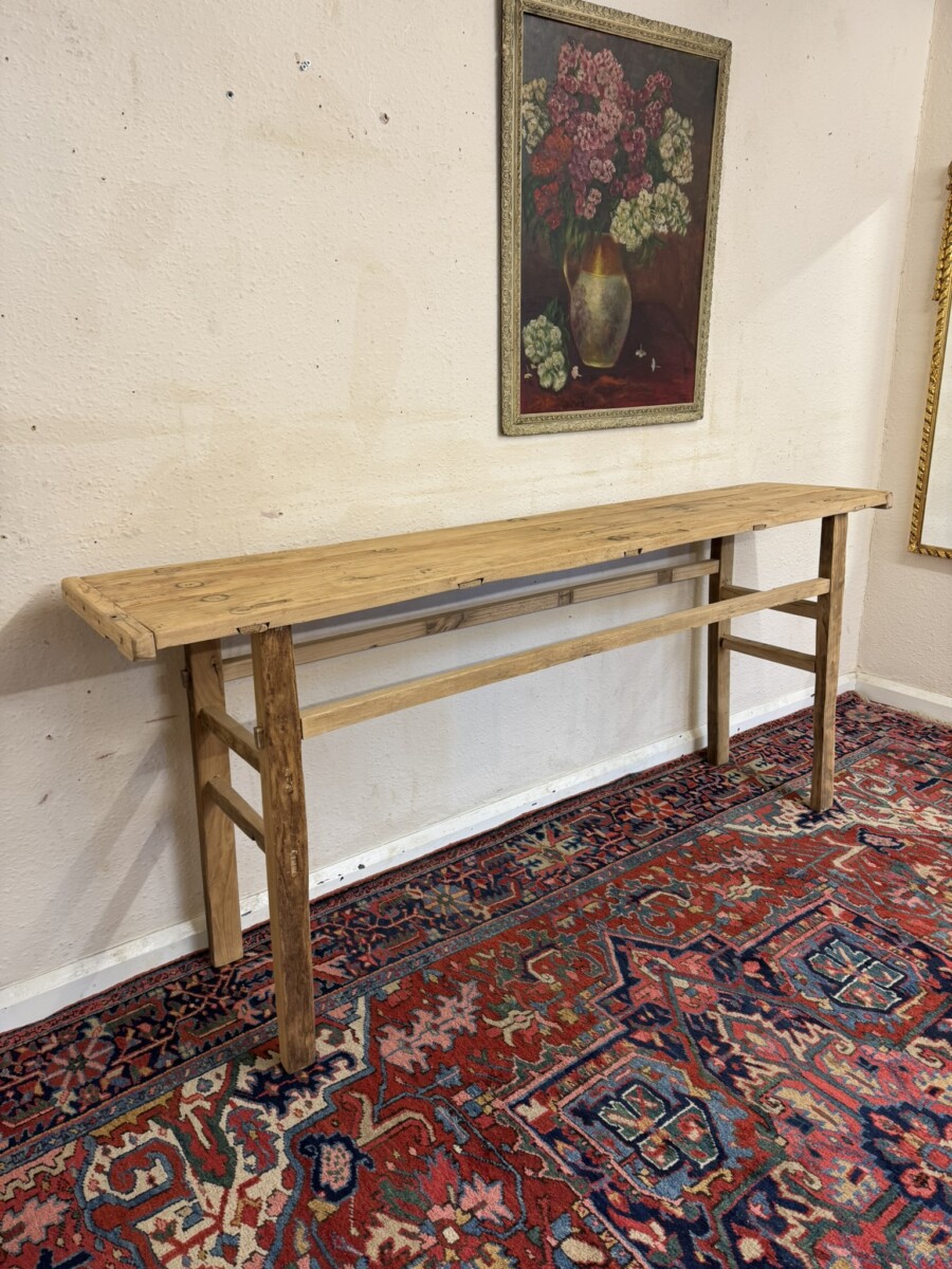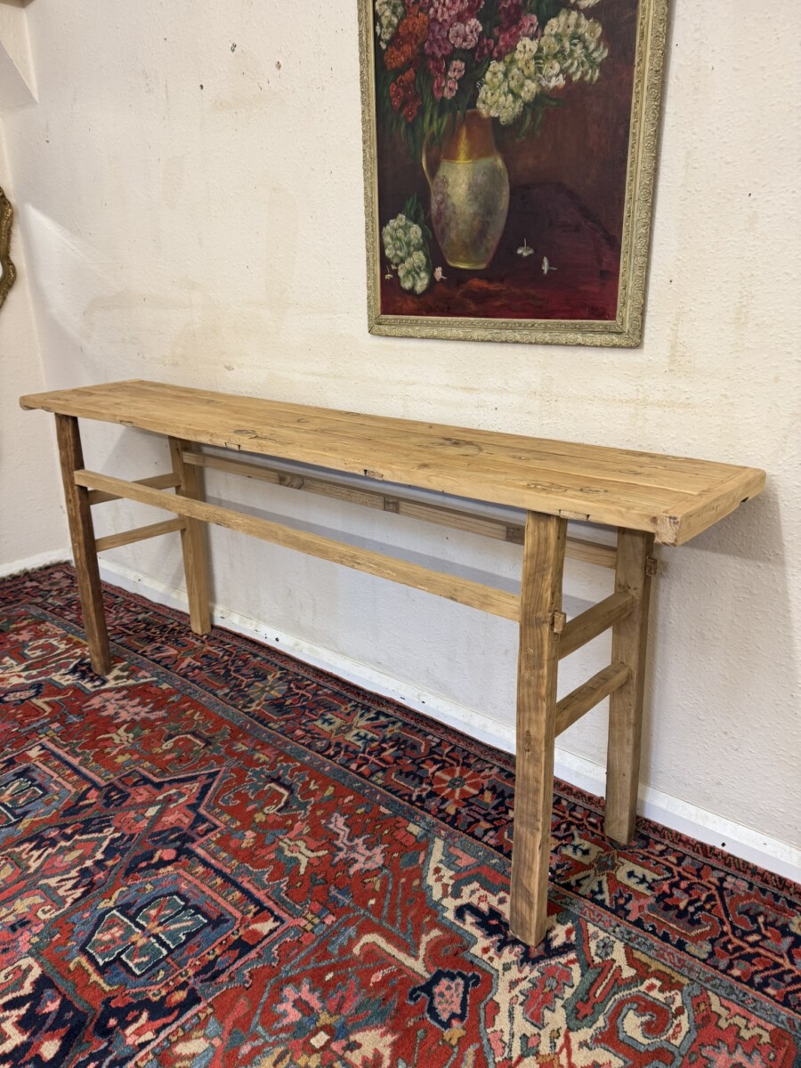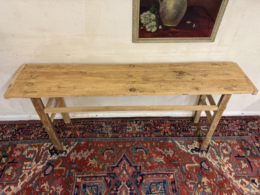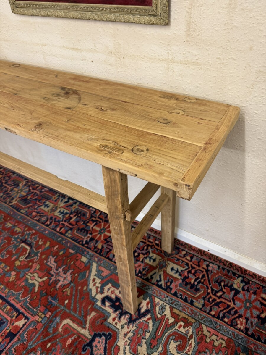 This beautiful elm console has a three plank top four legs with stretcher supports. The natural elm gives a soft neutral palette.