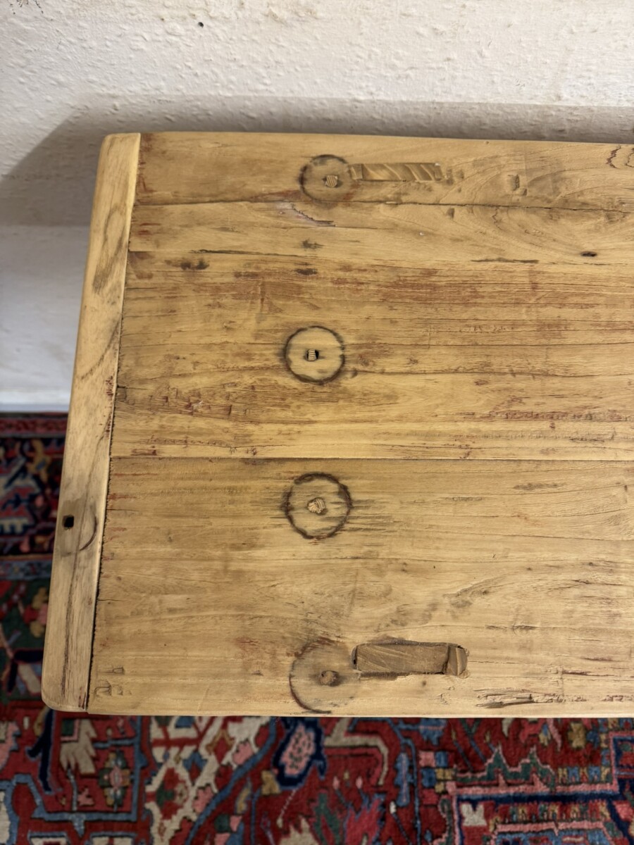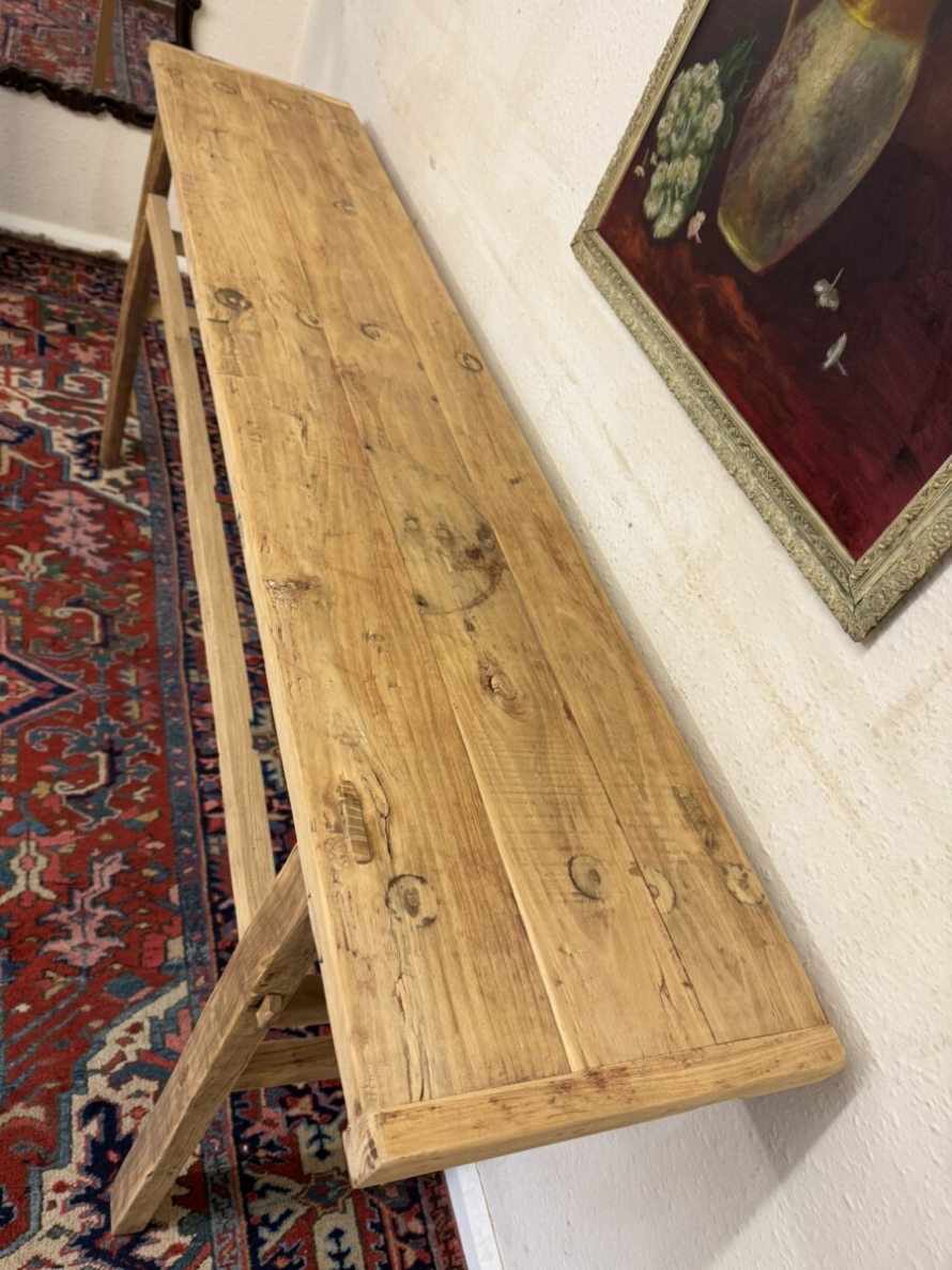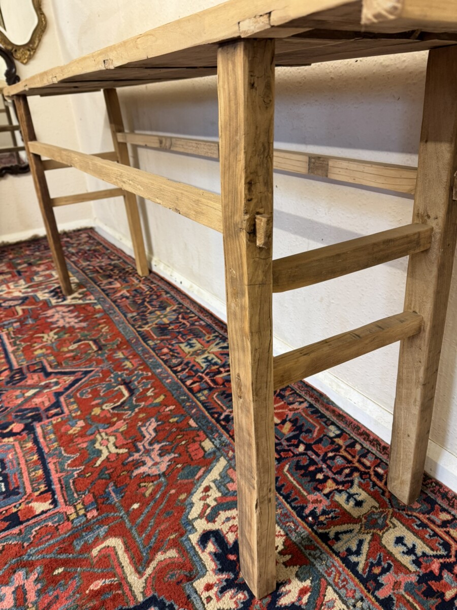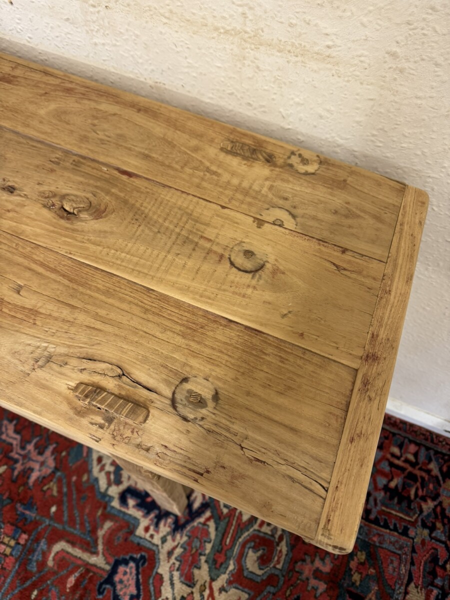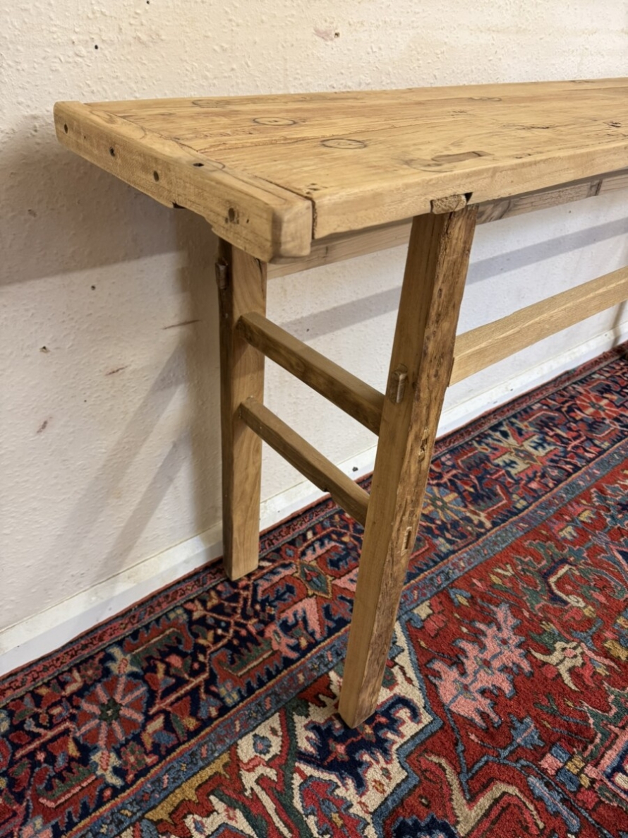 This beautiful elm console has a three plank top four legs with stretcher supports. The natural elm gives a soft neutral palette.