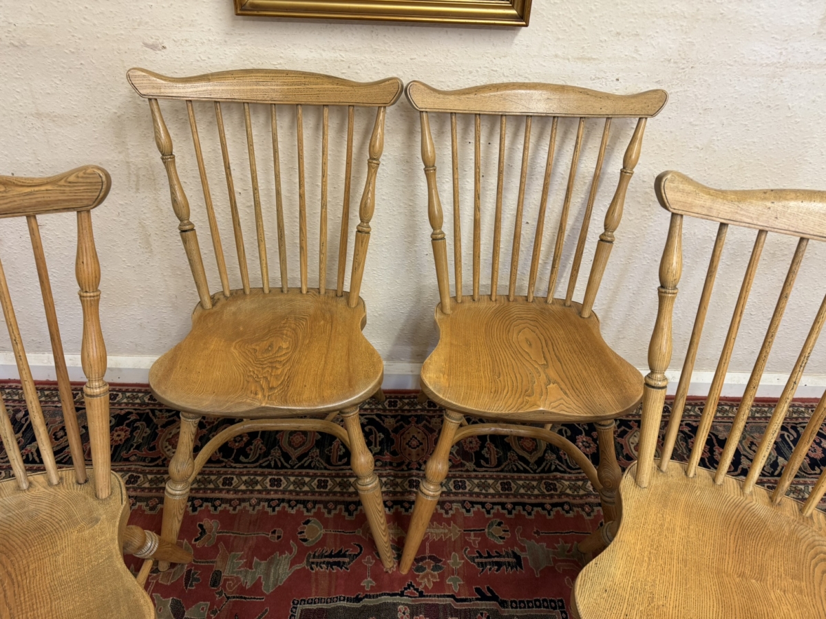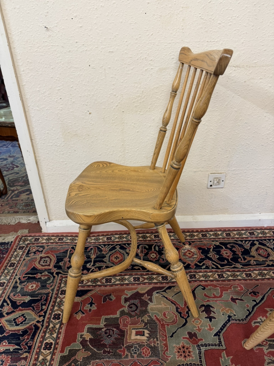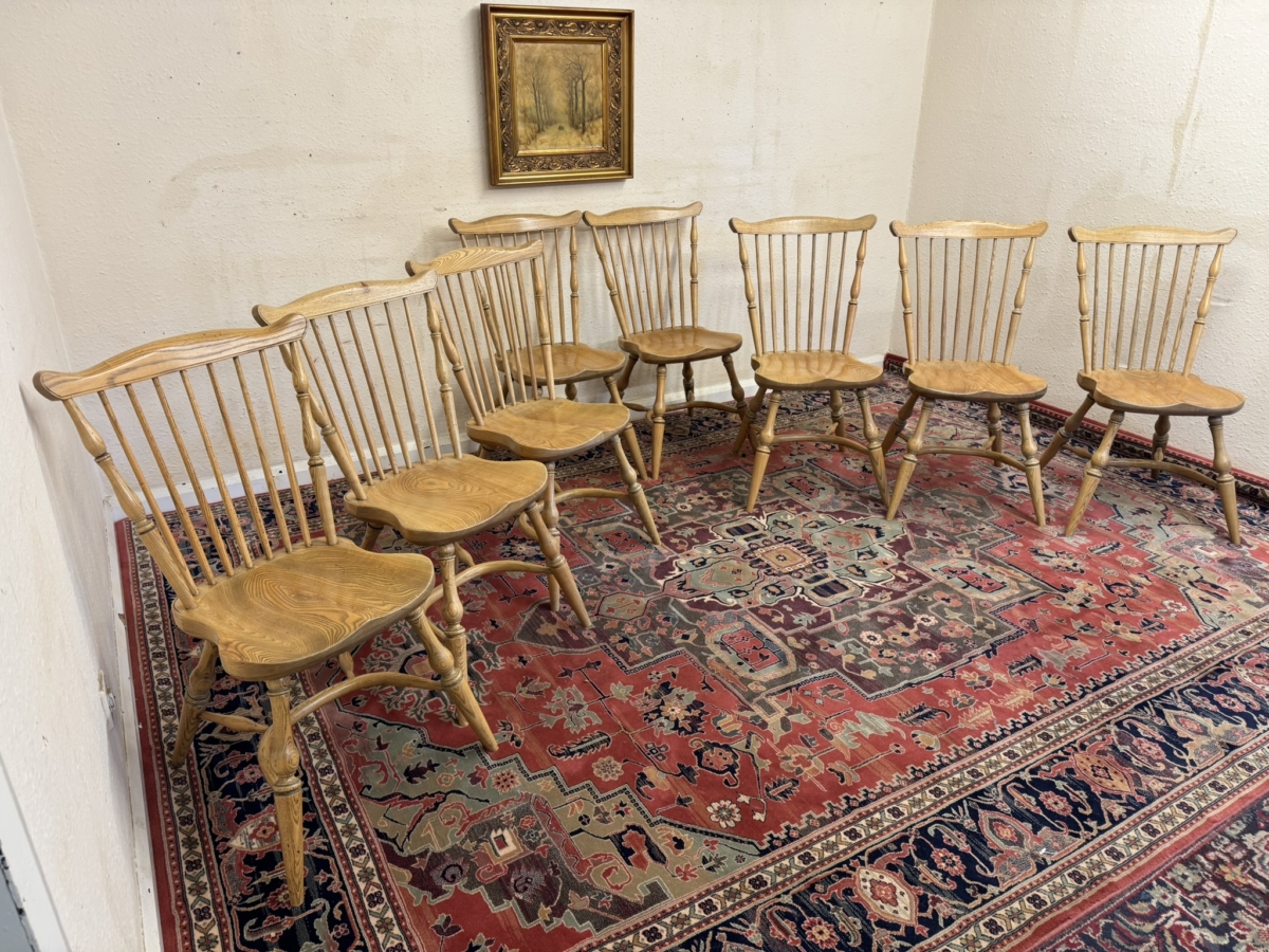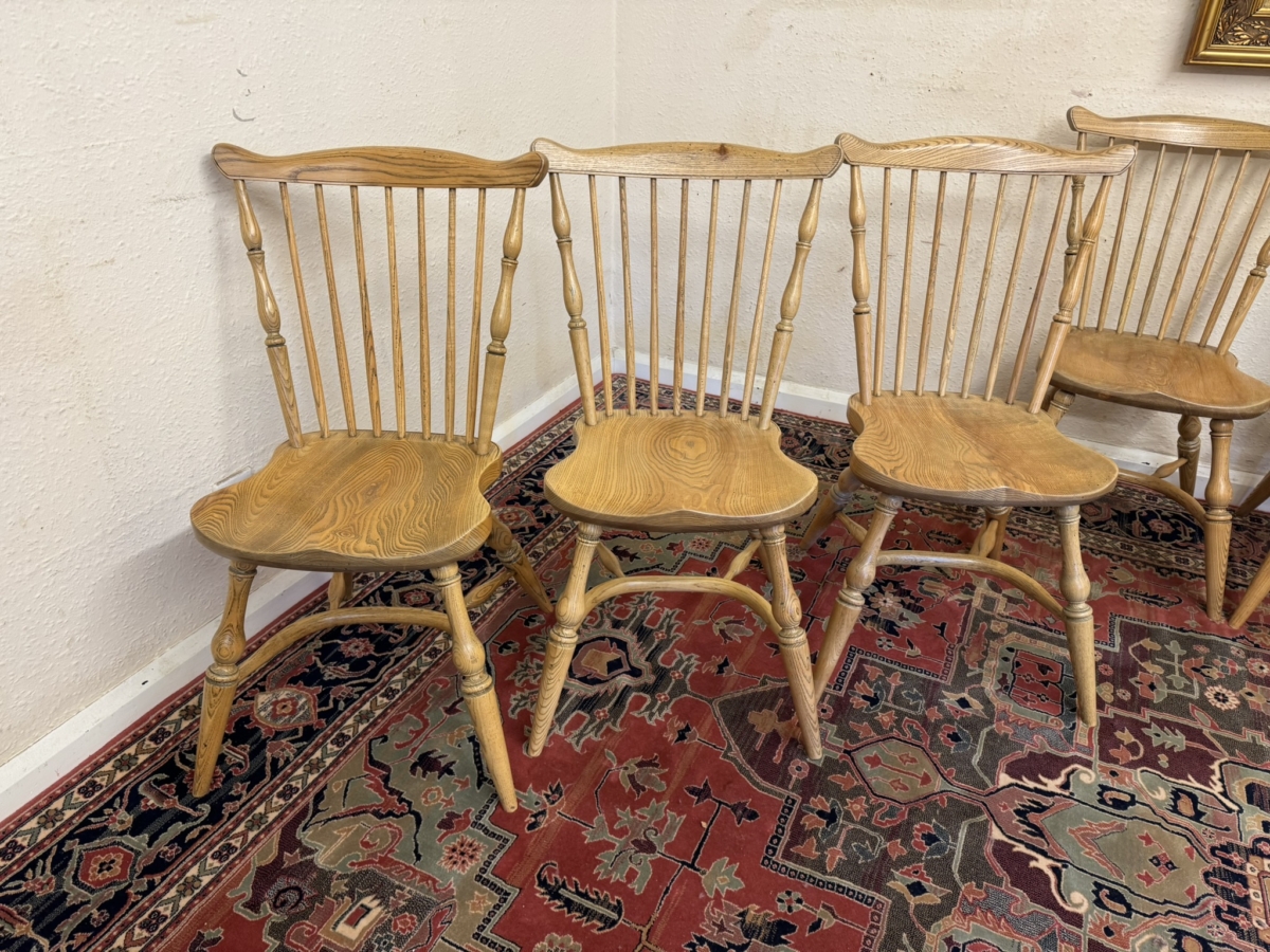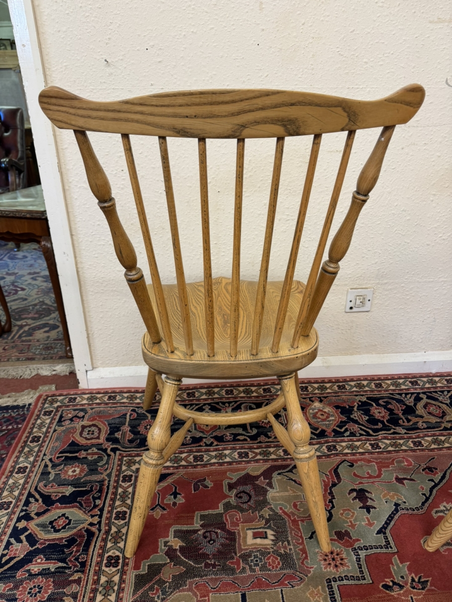Great set of eight Windsor chairs which are made from ash. Each chair has a spindle fan back, moulded saddle seat, four elegant turned legs with crinoline stretcher supports.