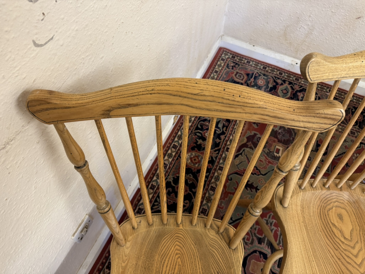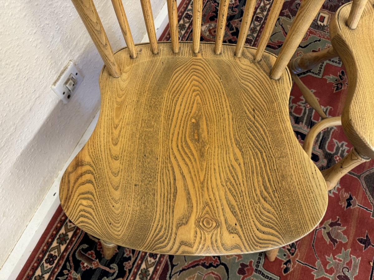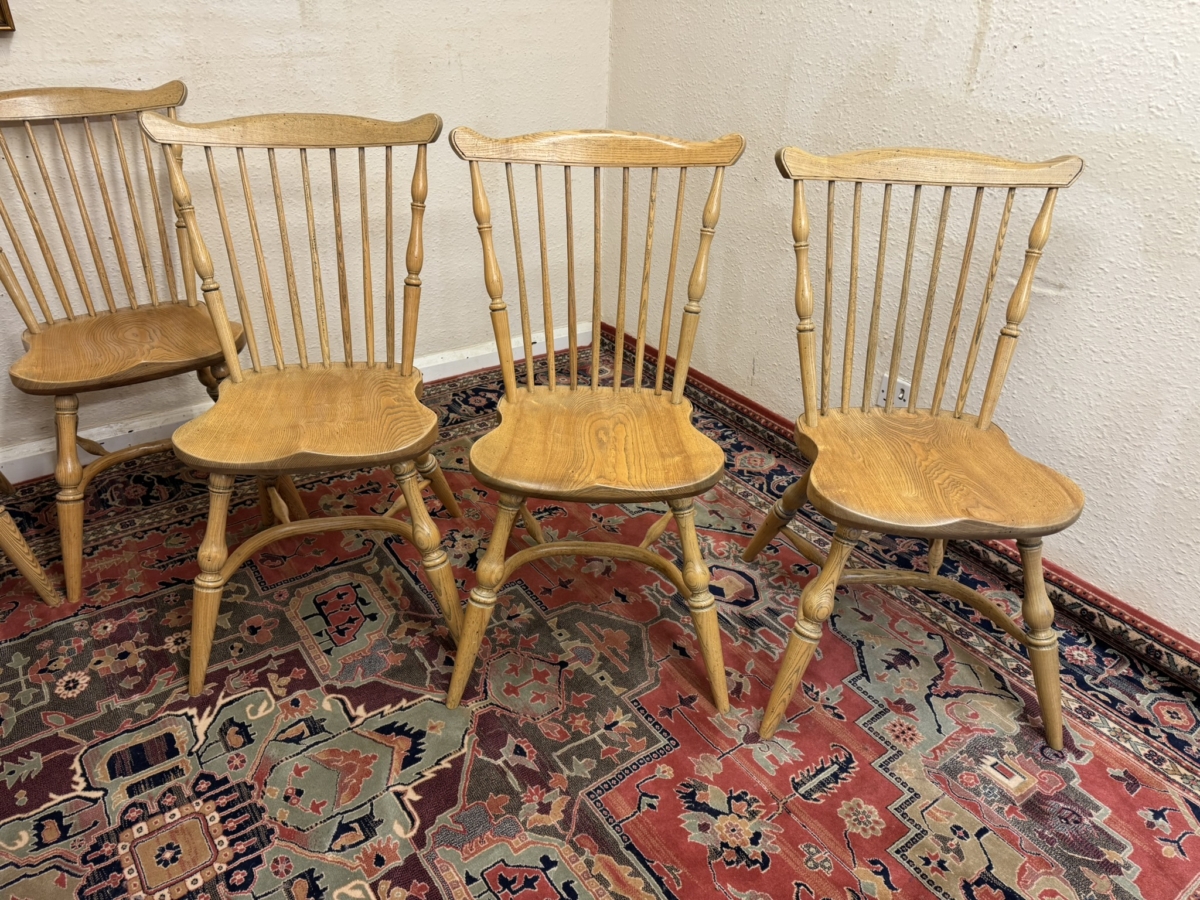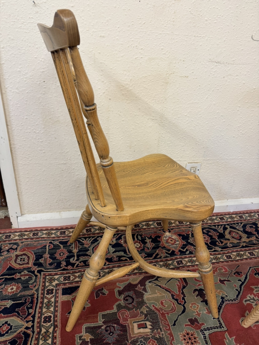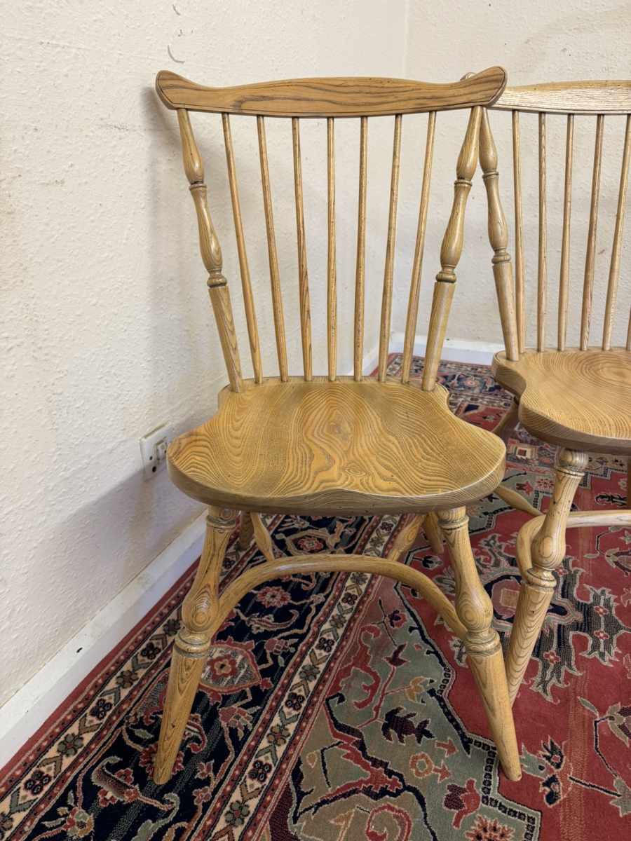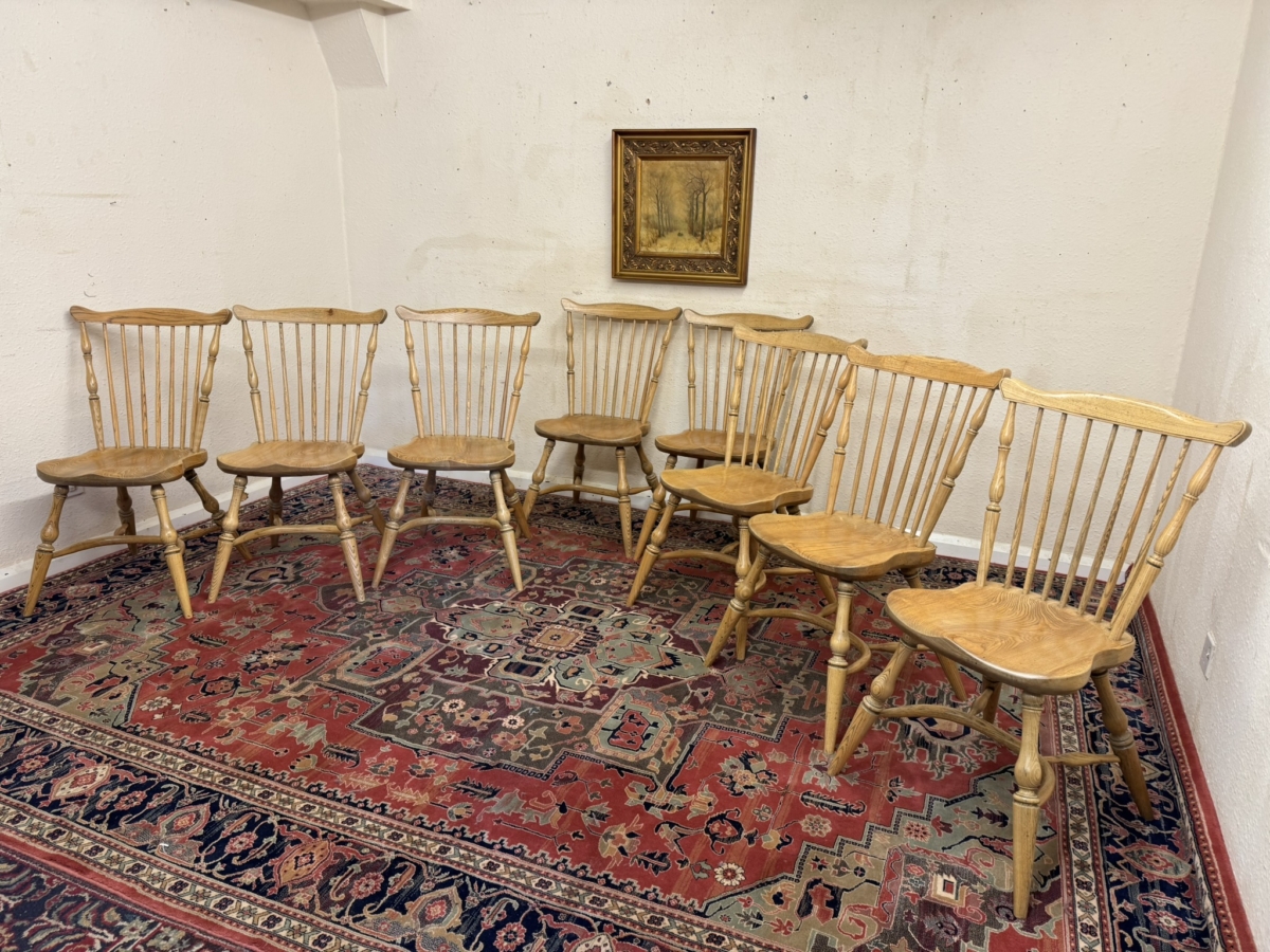 Great set of eight Windsor chairs which are made from ash. Each chair has a spindle fan back, moulded saddle seat, four elegant turned legs with crinoline stretcher supports.