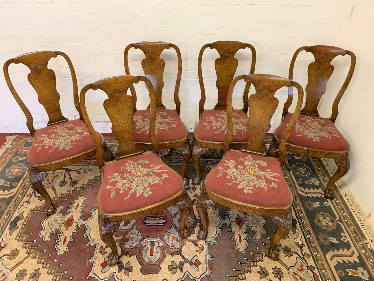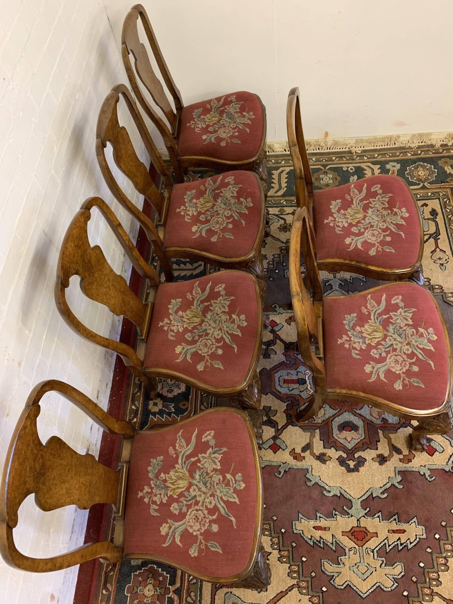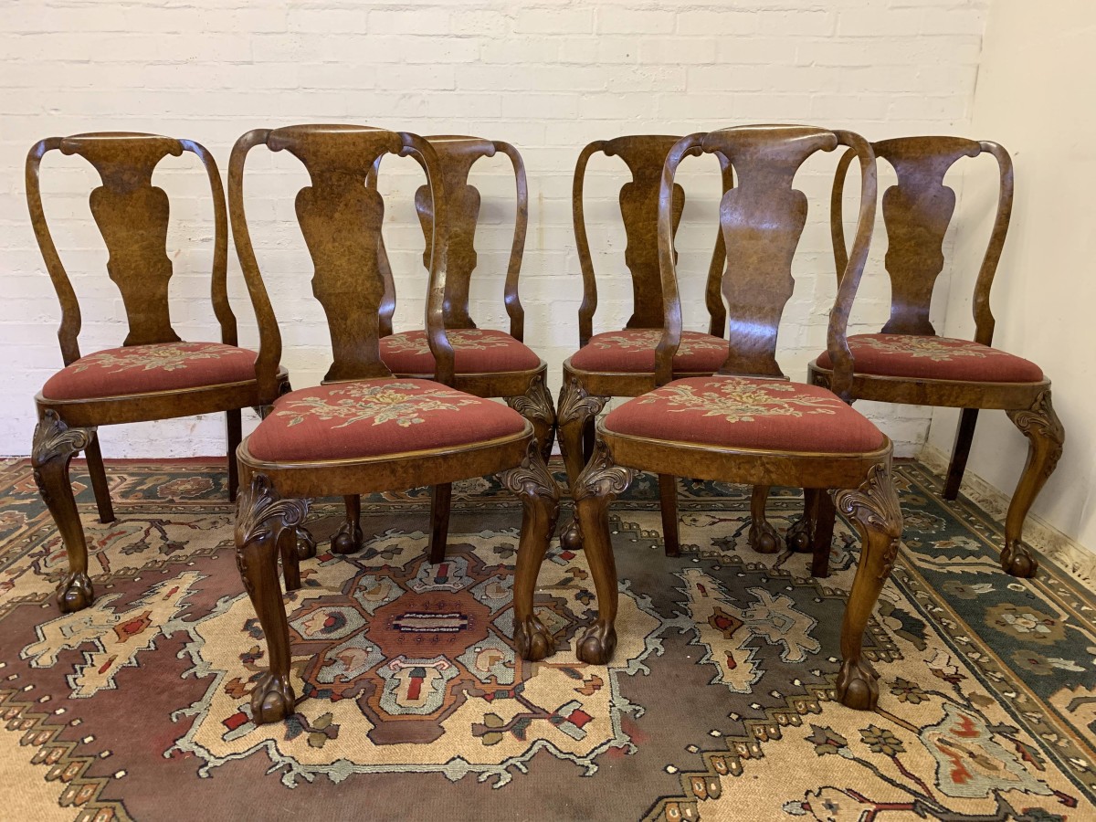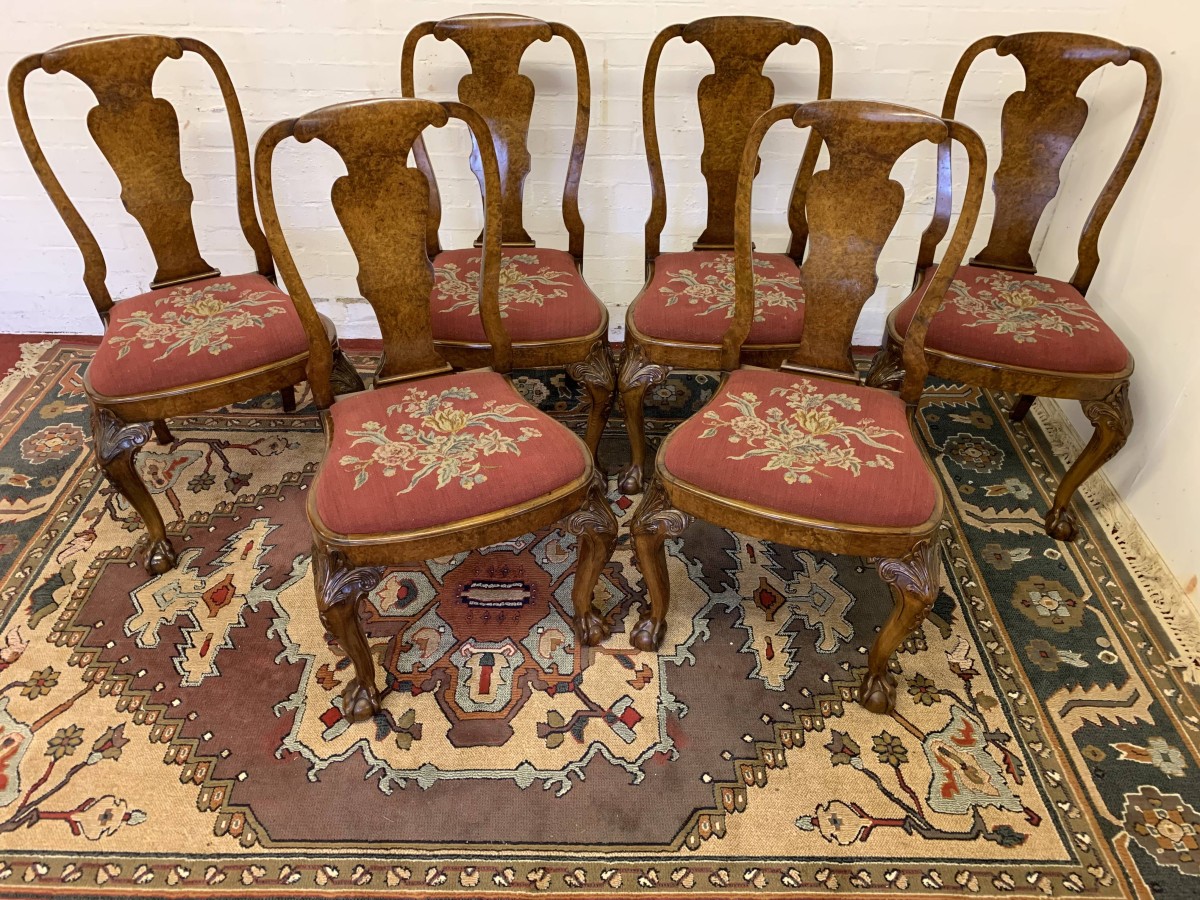 We are delighted to offer this gorgeous set of six dining chairs made in highest quality burr walnut. Each chair has a walnut back rest which is shaped for added comfort. The removable tapestry removable seat pad has an exquisite floral decoration. The front legs have decorative plume of feather carvings to the top and stand proud on ball and claw feet to the front. Please note these chairs are made in solid walnut and are in excellent condition.