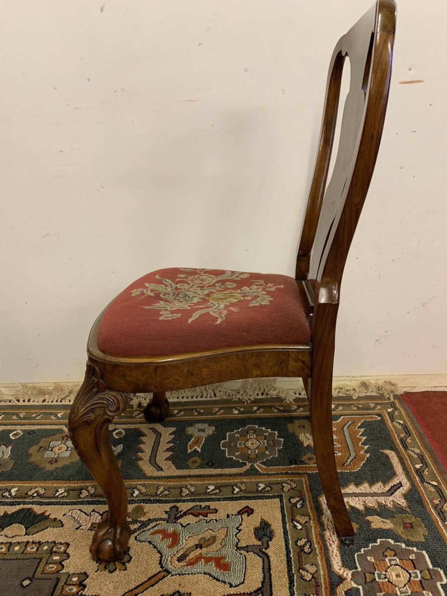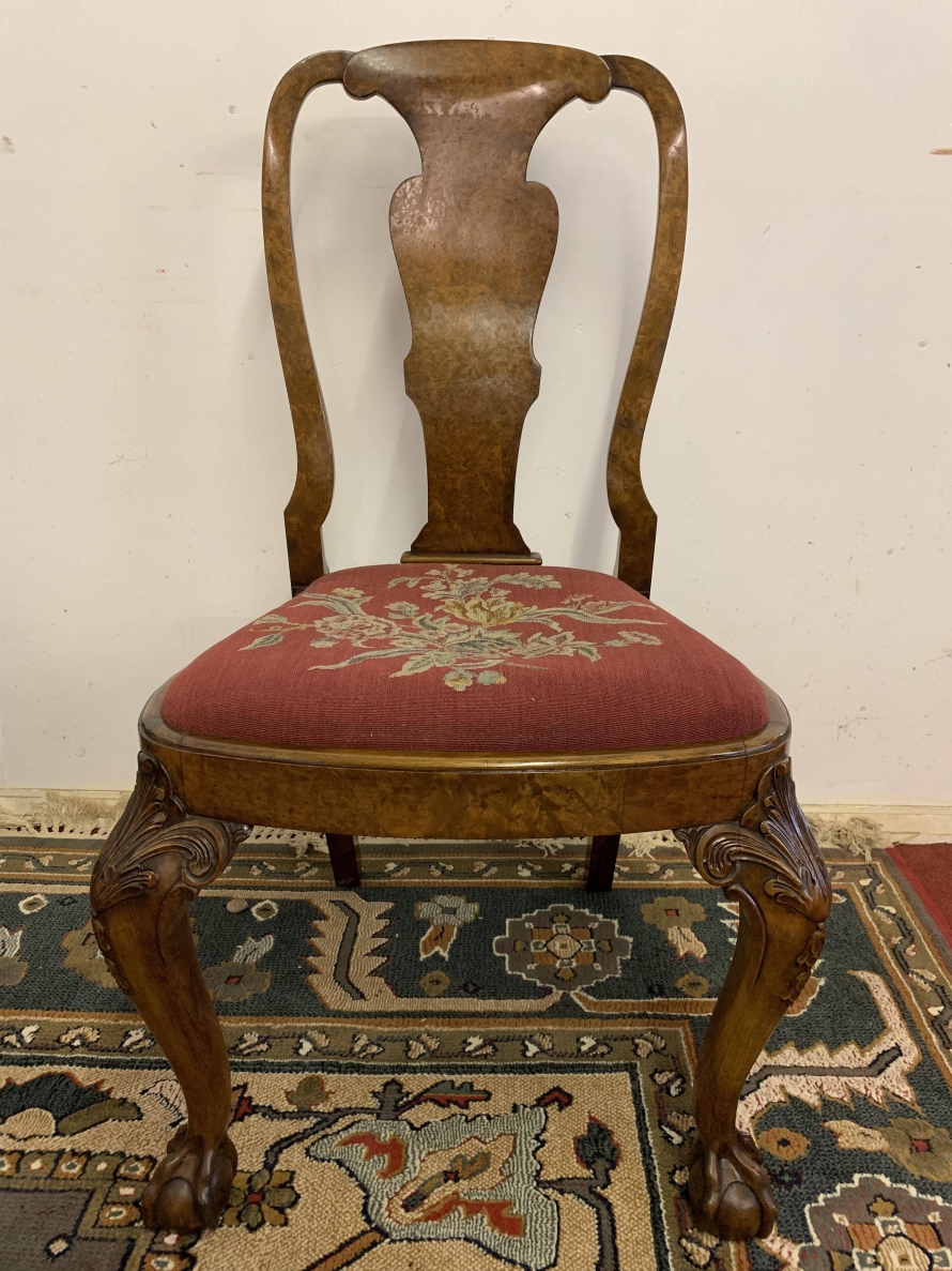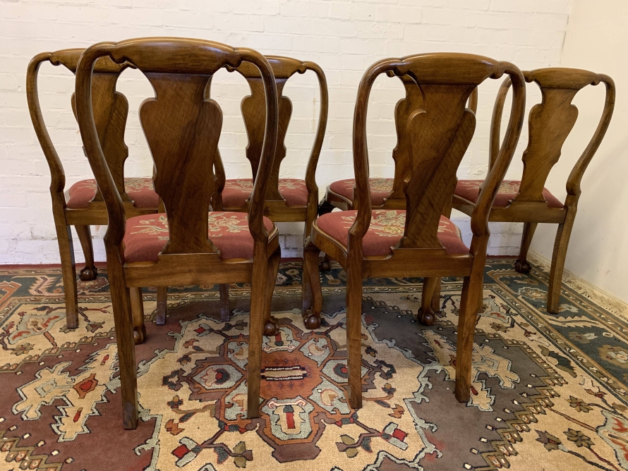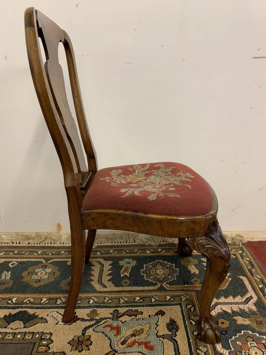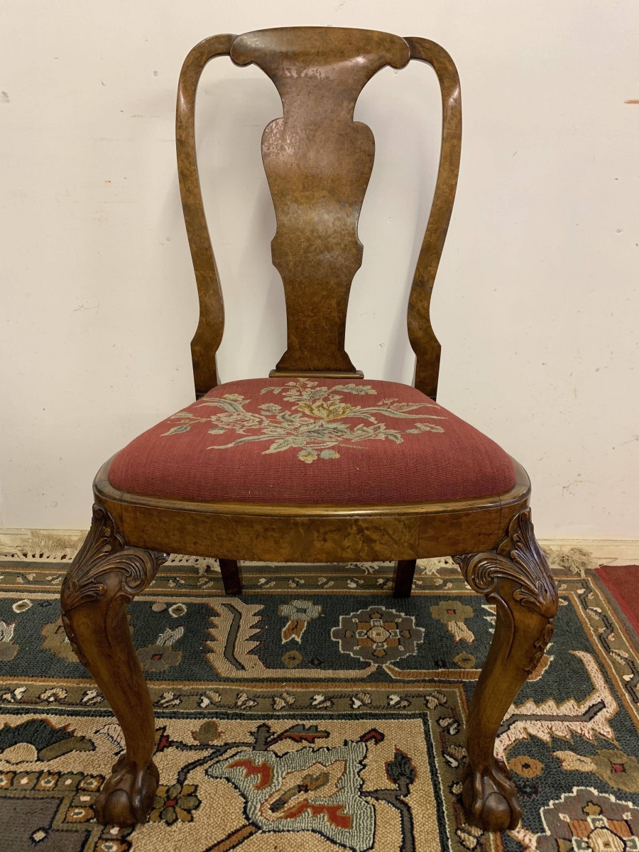 We are delighted to offer this gorgeous set of six dining chairs made in highest quality burr walnut. Each chair has a walnut back rest which is shaped for added comfort. The removable tapestry removable seat pad has an exquisite floral decoration. The front legs have decorative plume of feather carvings to the top and stand proud on ball and claw feet to the front. Please note these chairs are made in solid walnut and are in excellent condition.