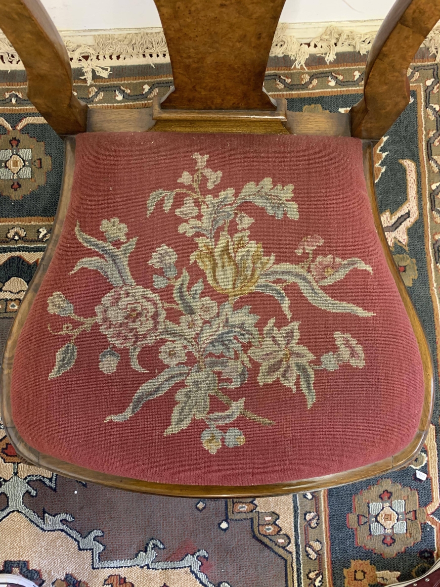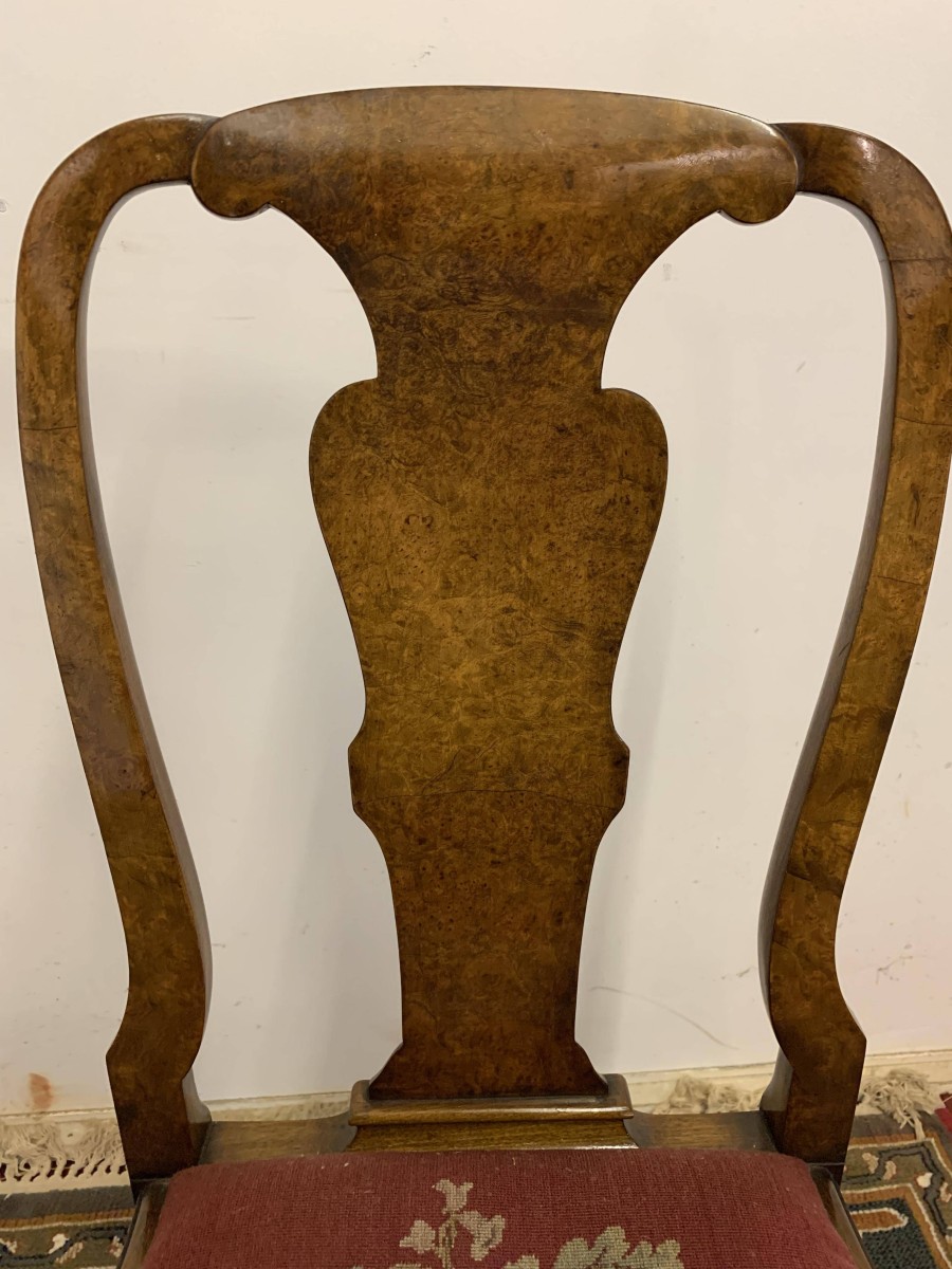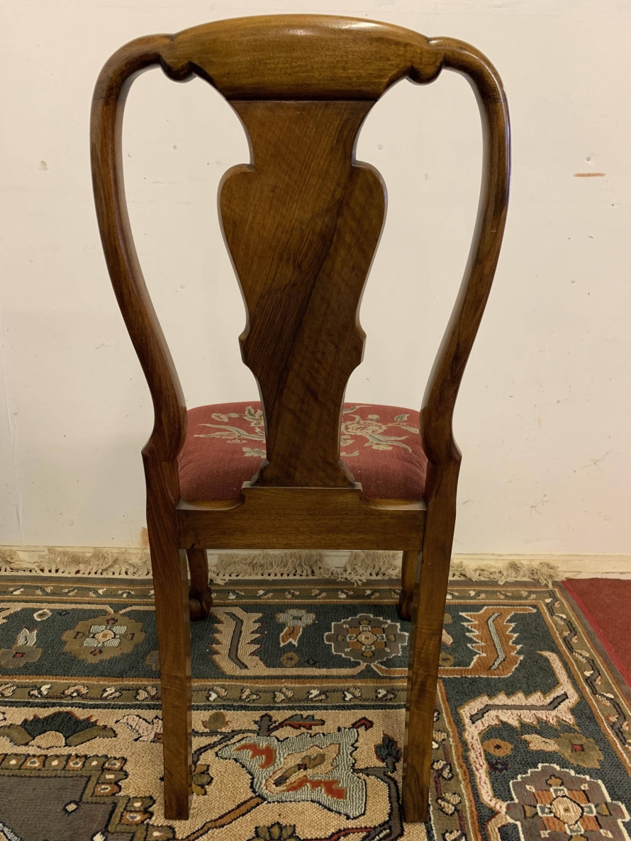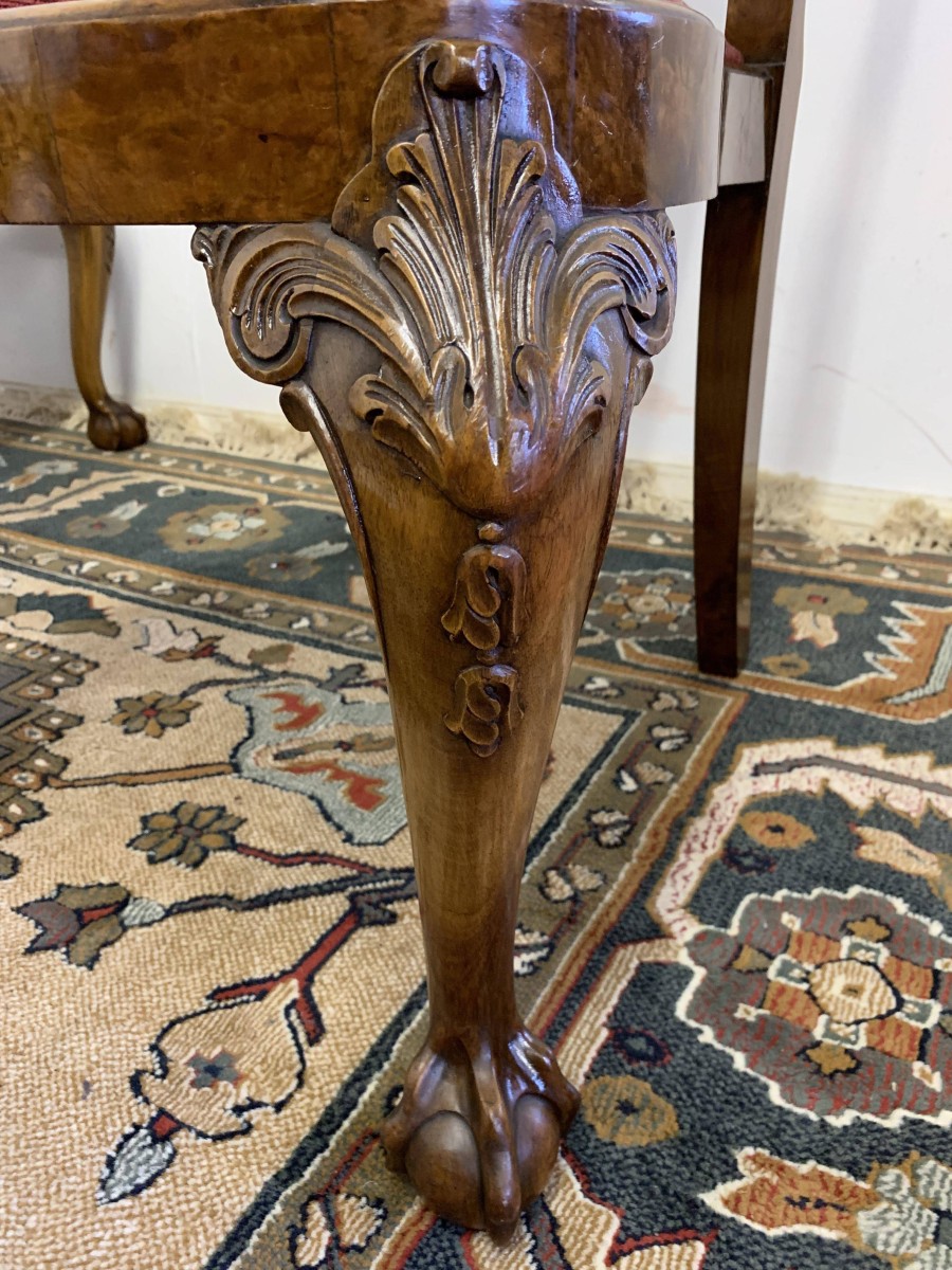 We are delighted to offer this gorgeous set of six dining chairs made in highest quality burr walnut. Each chair has a walnut back rest which is shaped for added comfort. The removable tapestry removable seat pad has an exquisite floral decoration. The front legs have decorative plume of feather carvings to the top and stand proud on ball and claw feet to the front. Please note these chairs are made in solid walnut and are in excellent condition.