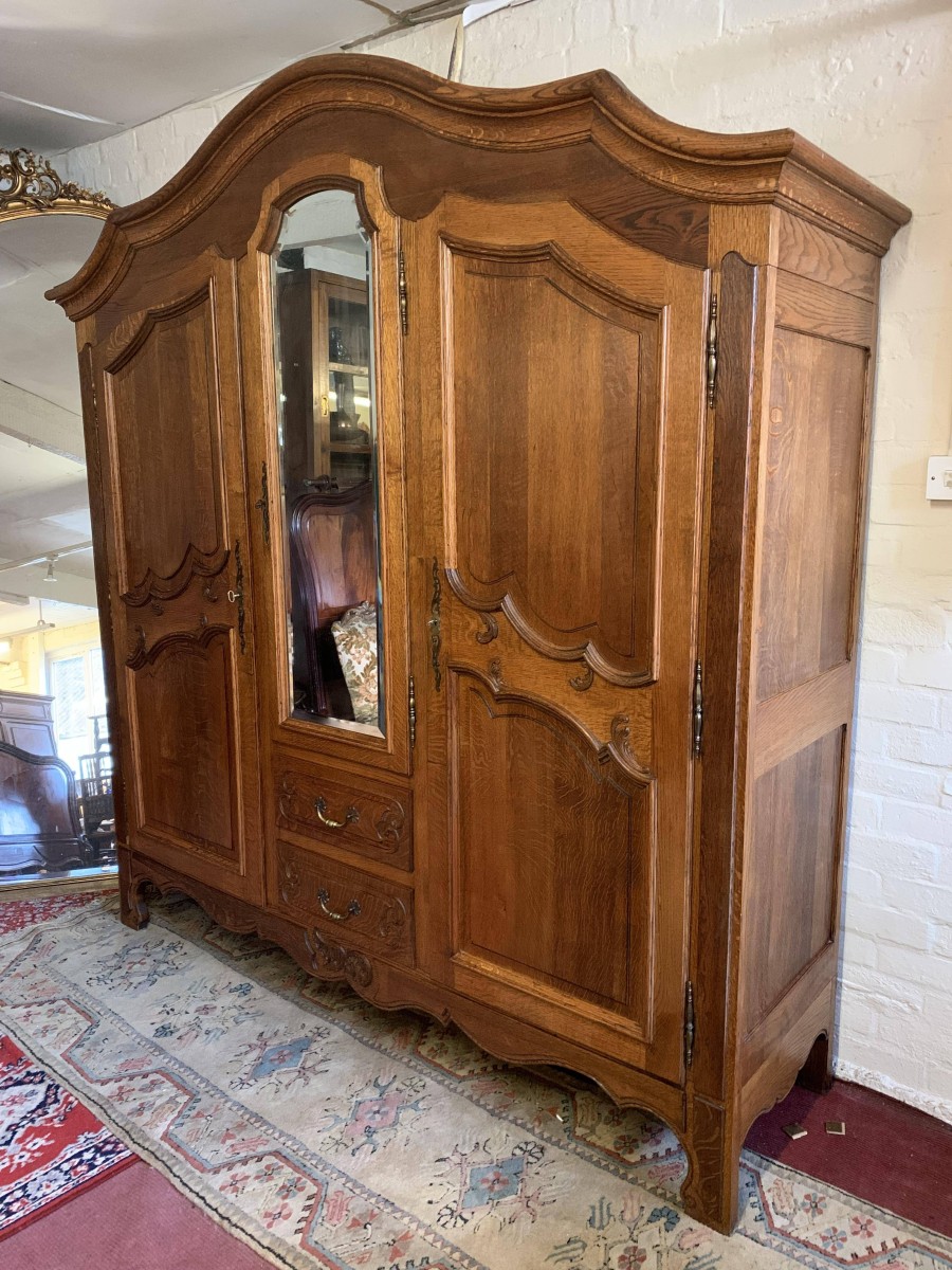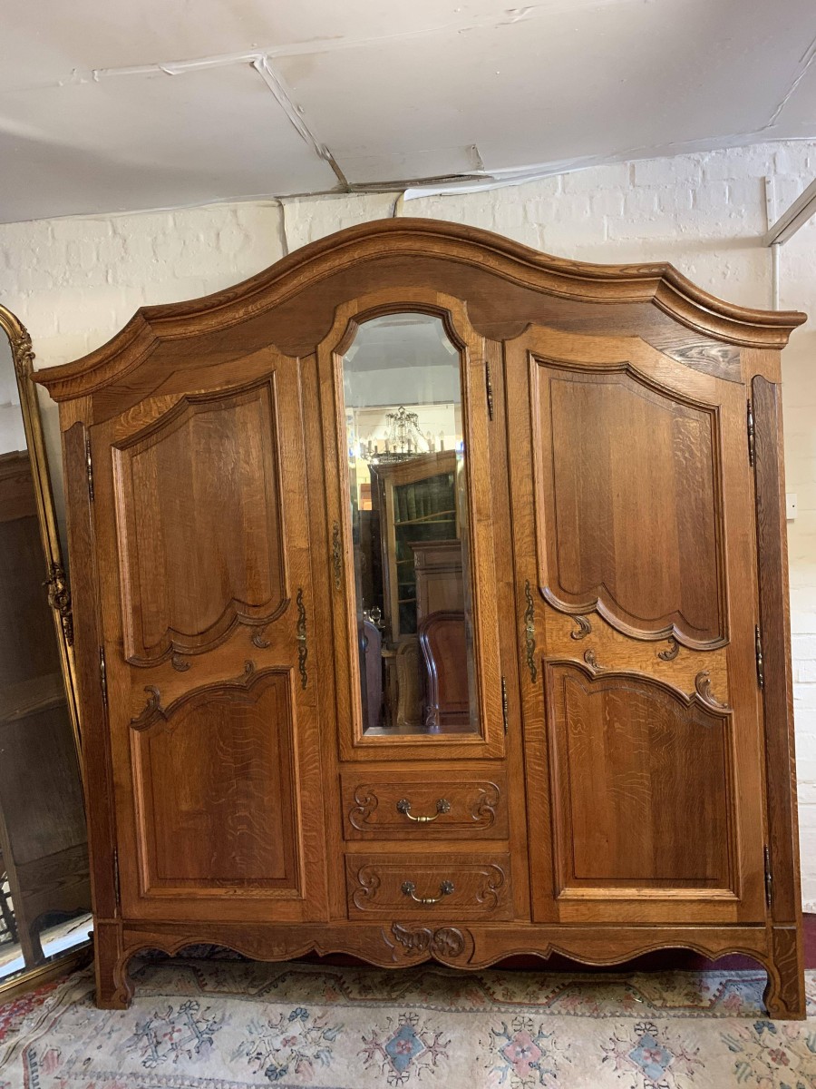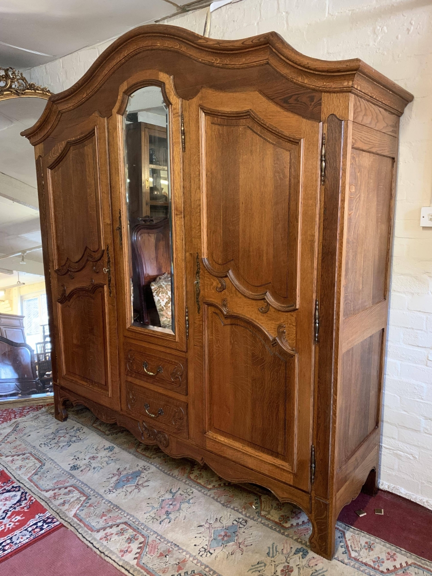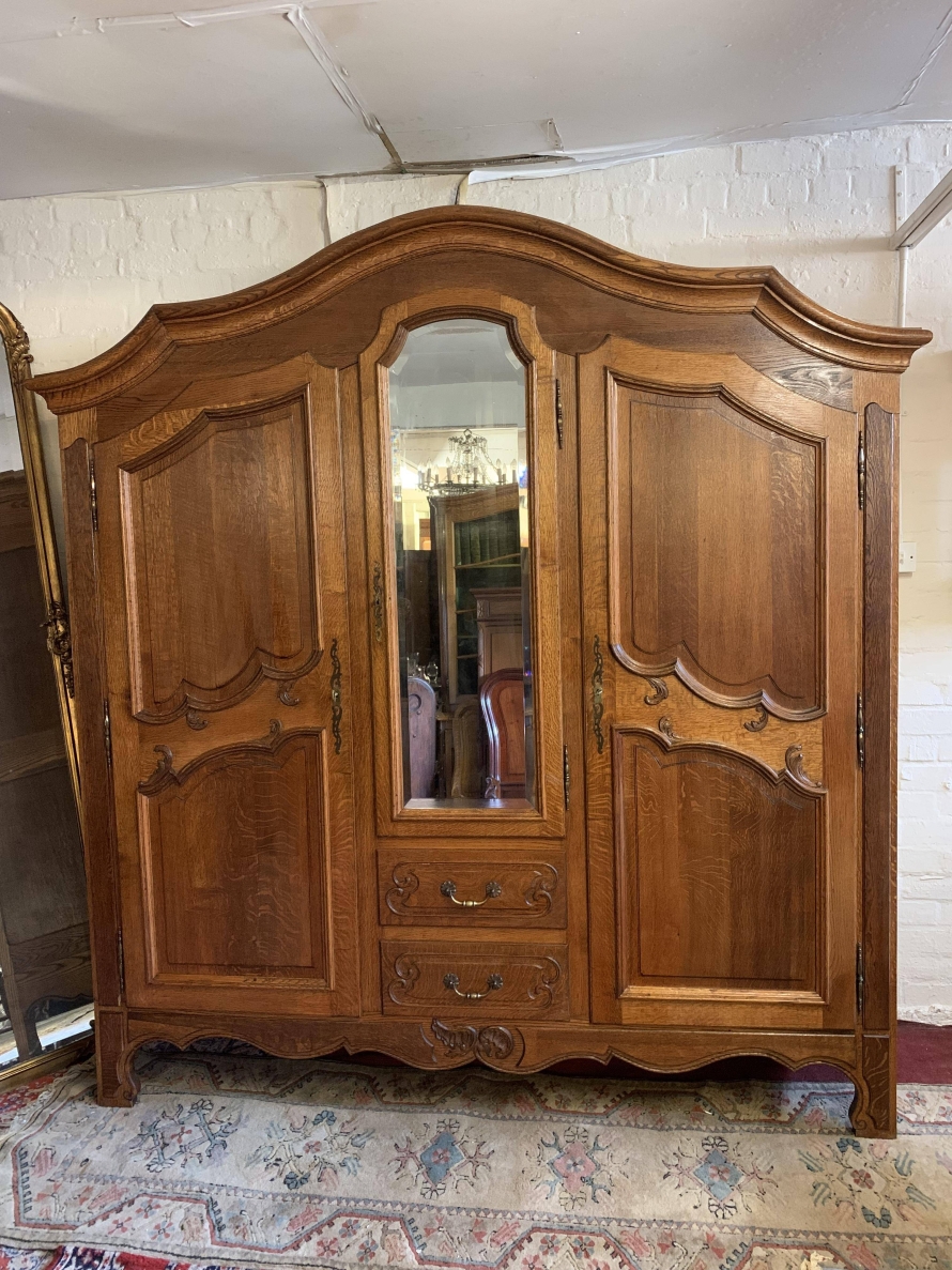 A fantastic antique French armoire which is in excellent condition. The shaped oversailing top sits above a central bevel edged lockable door, the door having brass hinges, decorative brass escutcheon and key. The door opens to reveal three adjustable and removable storage shelves. Below the mirrored door are two carved recessed panelled drawers, each drawer having a brass drop handle. The central mirrored door is flanked by a pair of lockable shaped recessed panelled doors, each door having brass hinges, decorative brass escutcheon, key and decorative central carvings. Each door opens to reveal a shelf above a hanging rail. Recessed panelled sides, shaped skirt with decorative central carving this fabulous armoire stands on two carved shaped legs to the front. Please note this armoire splits down for easy delivery and transportation into any home.