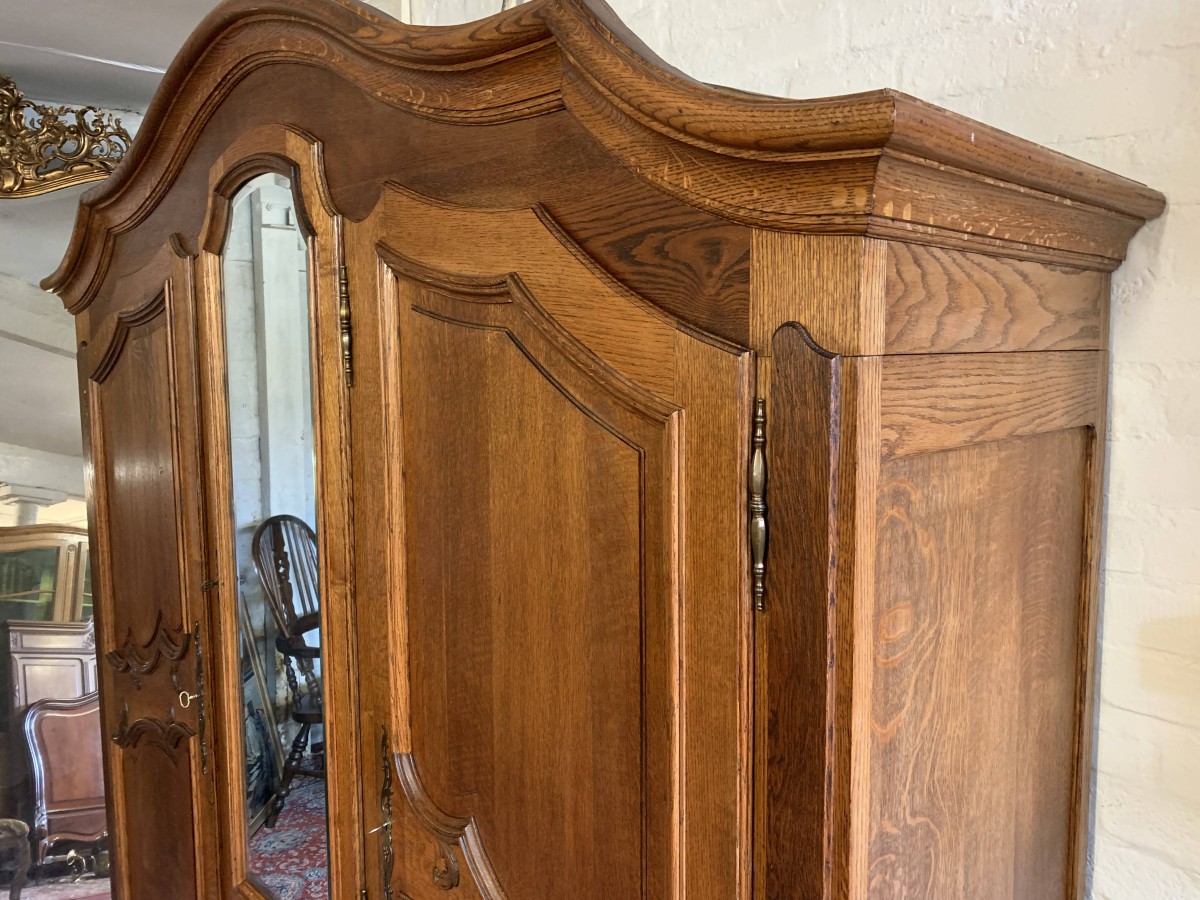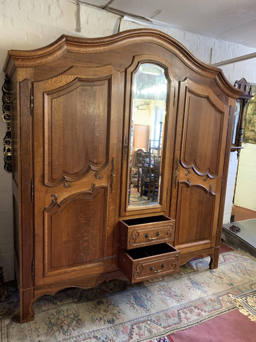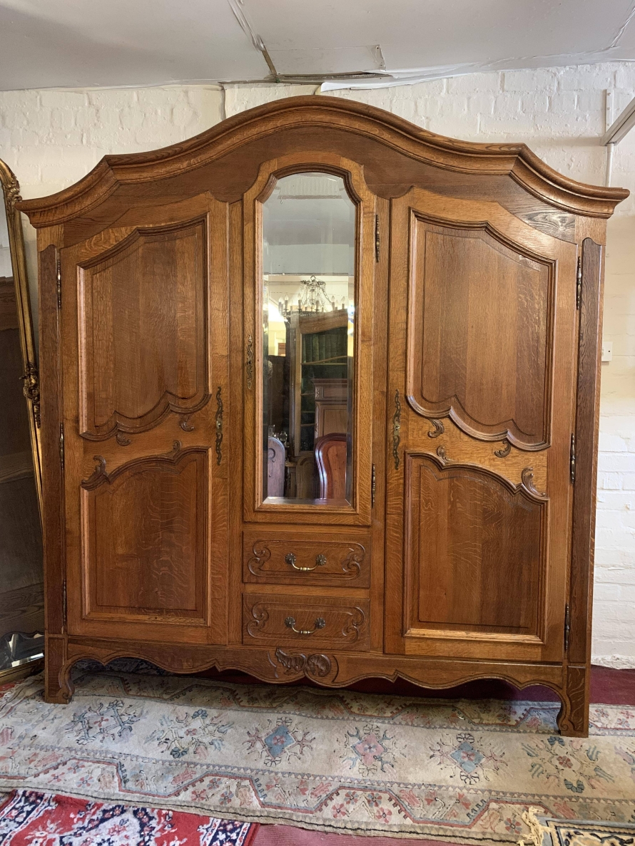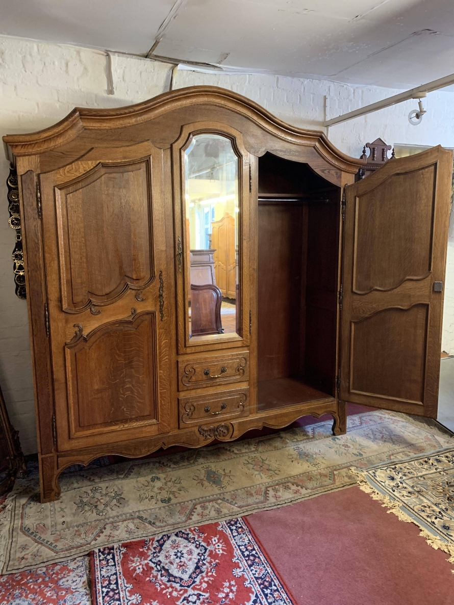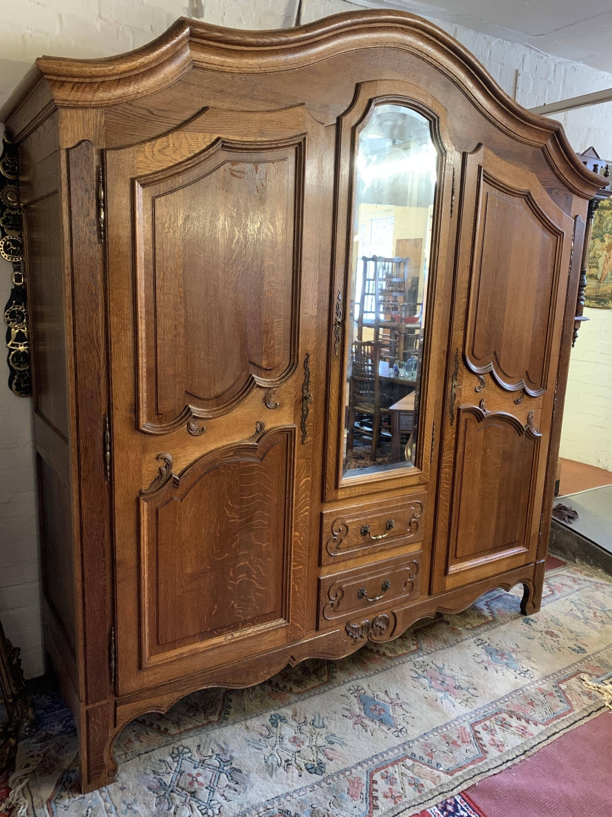 A fantastic antique French armoire which is in excellent condition. The shaped oversailing top sits above a central bevel edged lockable door, the door having brass hinges, decorative brass escutcheon and key. The door opens to reveal three adjustable and removable storage shelves. Below the mirrored door are two carved recessed panelled drawers, each drawer having a brass drop handle. The central mirrored door is flanked by a pair of lockable shaped recessed panelled doors, each door having brass hinges, decorative brass escutcheon, key and decorative central carvings. Each door opens to reveal a shelf above a hanging rail. Recessed panelled sides, shaped skirt with decorative central carving this fabulous armoire stands on two carved shaped legs to the front. Please note this armoire splits down for easy delivery and transportation into any home.