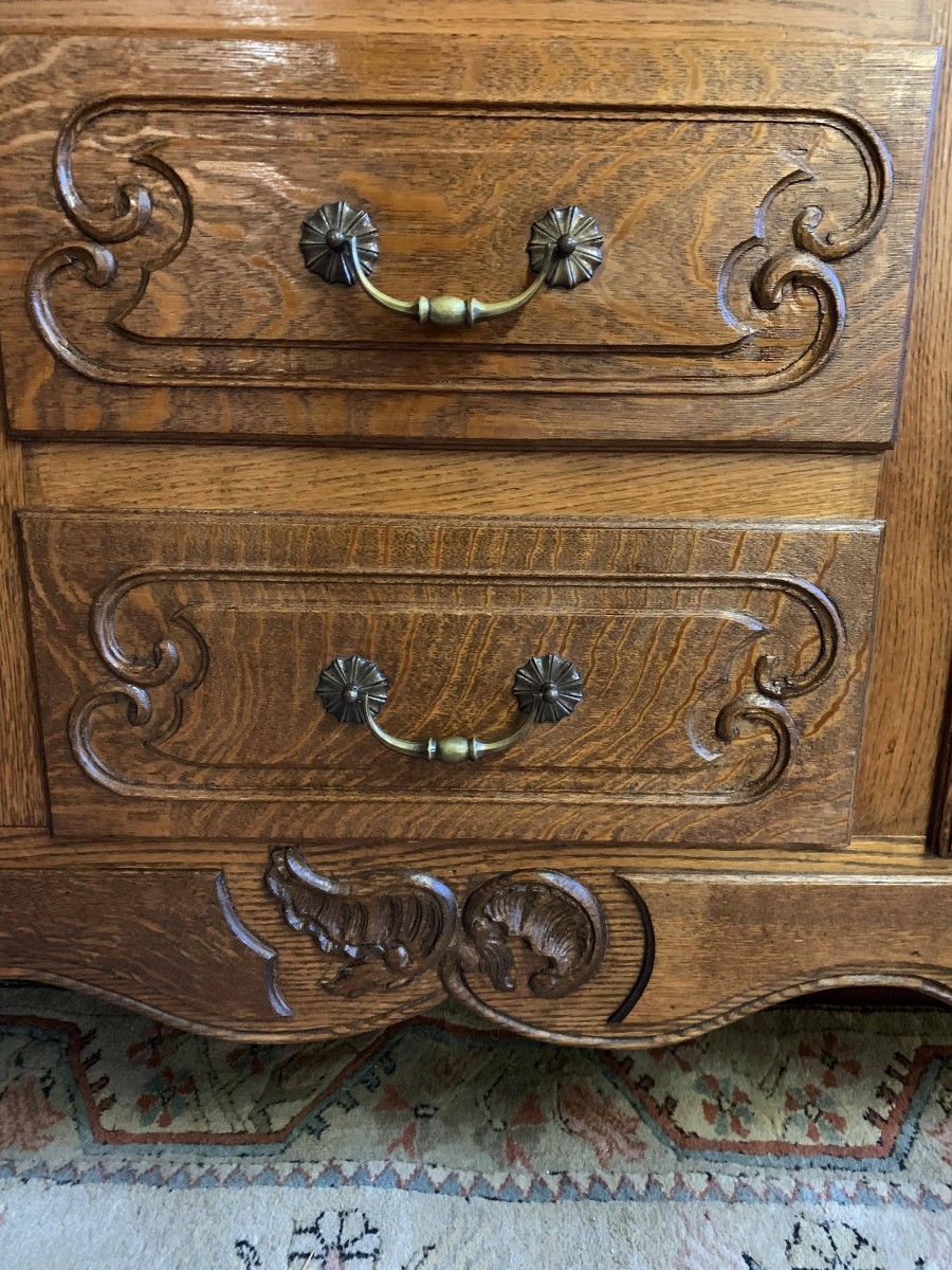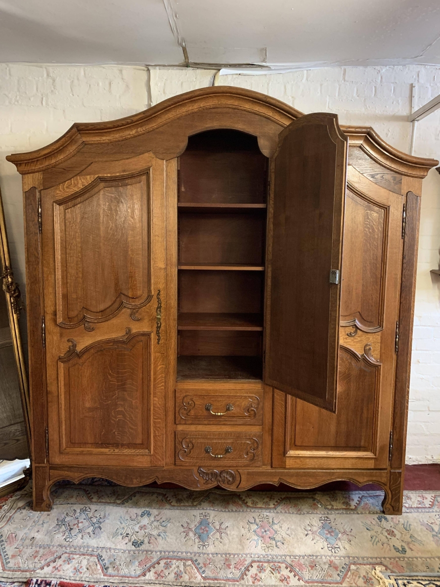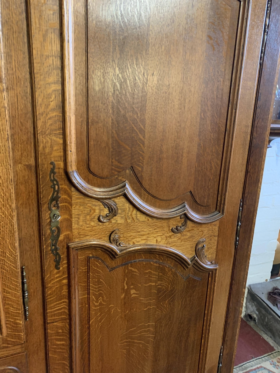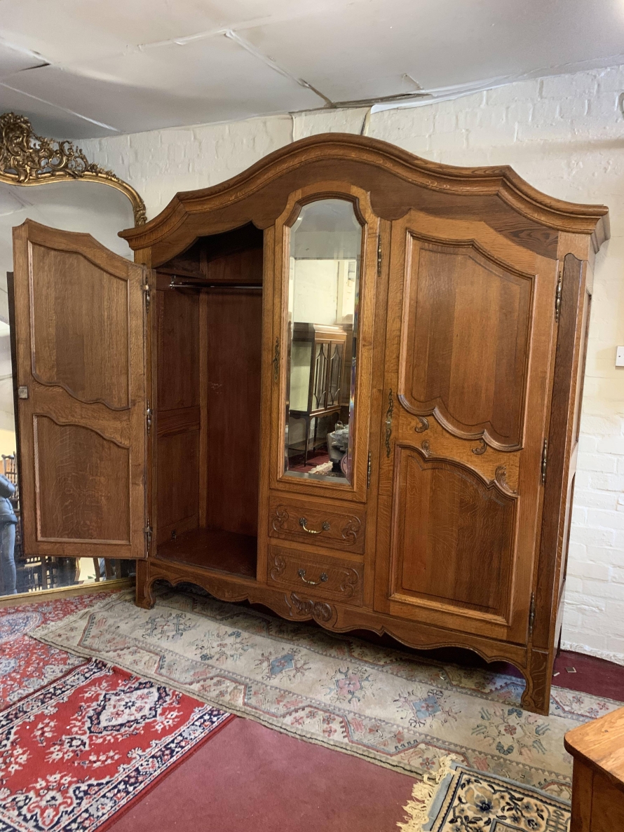A fantastic antique French armoire which is in excellent condition. The shaped oversailing top sits above a central bevel edged lockable door, the door having brass hinges, decorative brass escutcheon and key. The door opens to reveal three adjustable and removable storage shelves. Below the mirrored door are two carved recessed panelled drawers, each drawer having a brass drop handle. The central mirrored door is flanked by a pair of lockable shaped recessed panelled doors, each door having brass hinges, decorative brass escutcheon, key and decorative central carvings. Each door opens to reveal a shelf above a hanging rail. Recessed panelled sides, shaped skirt with decorative central carving this fabulous armoire stands on two carved shaped legs to the front. Please note this armoire splits down for easy delivery and transportation into any home.