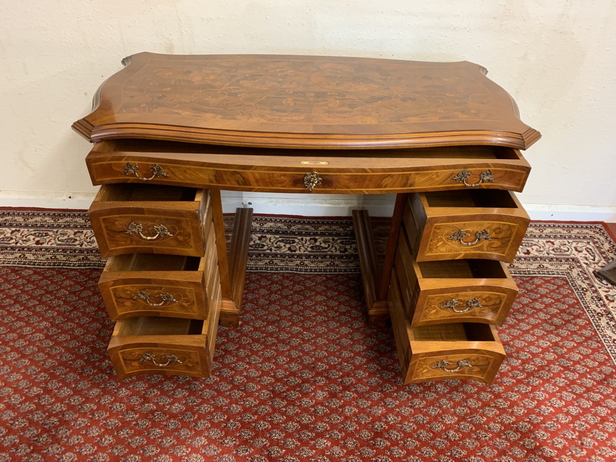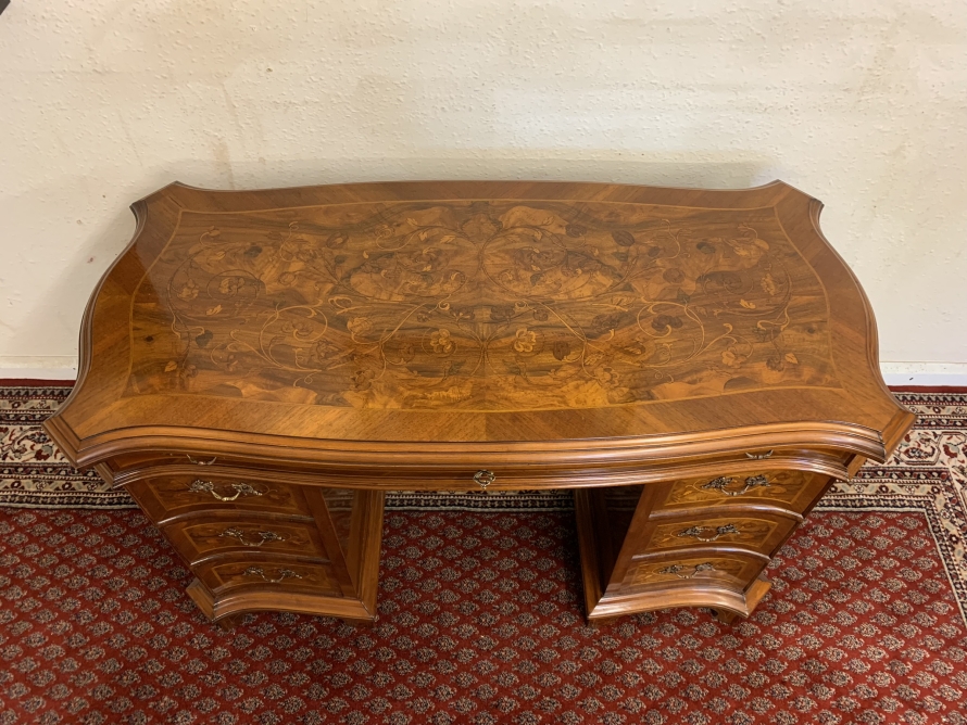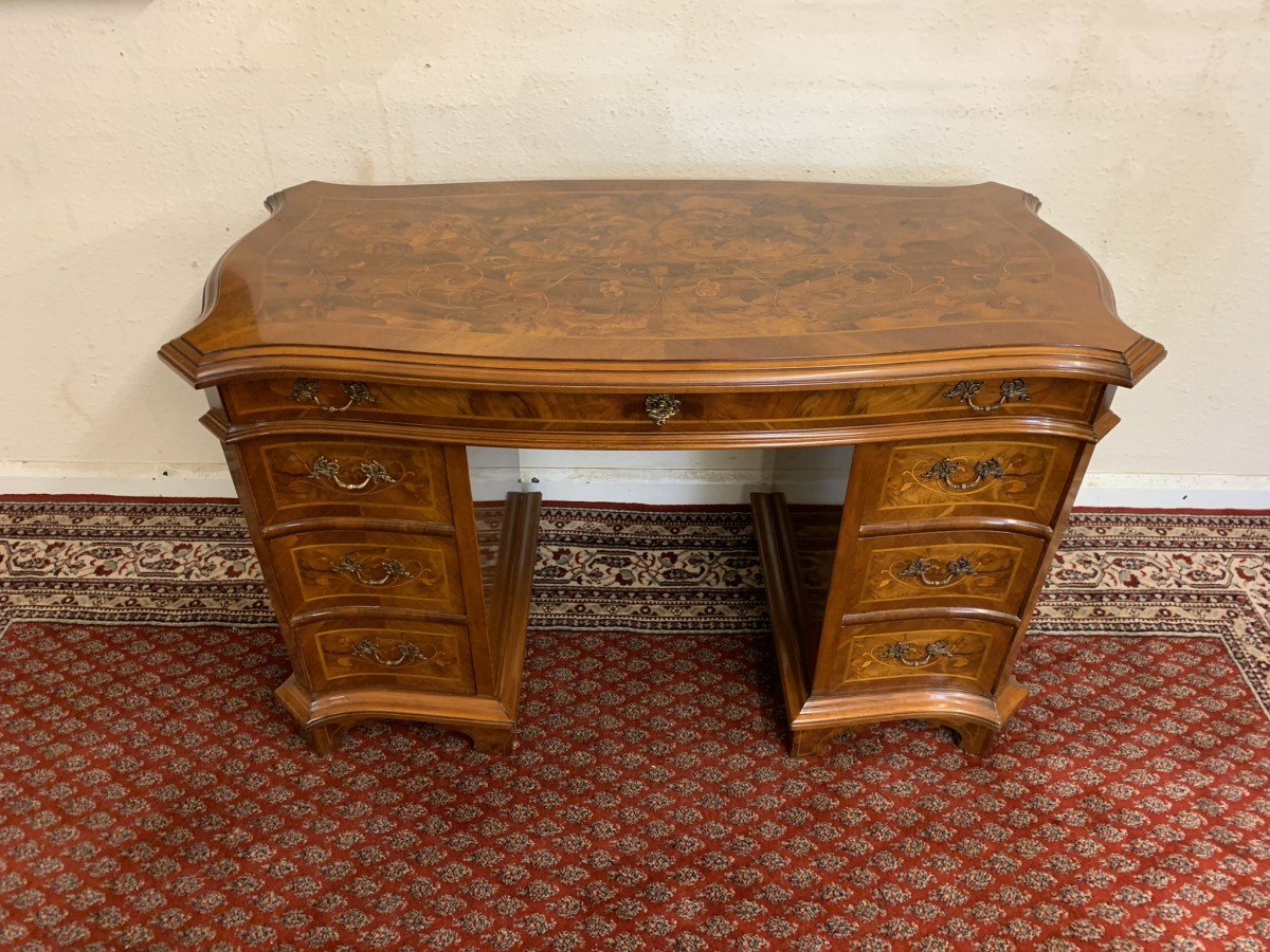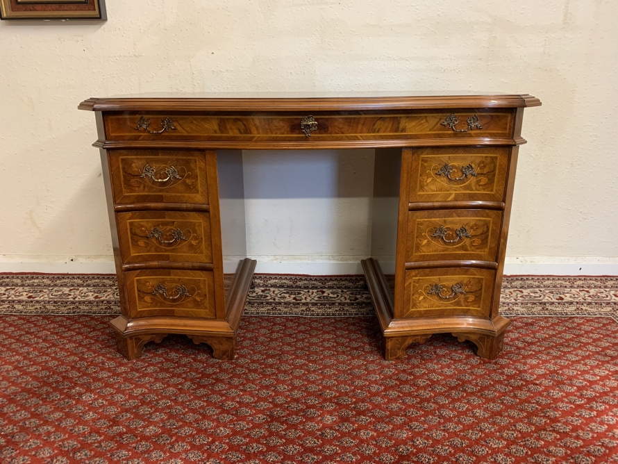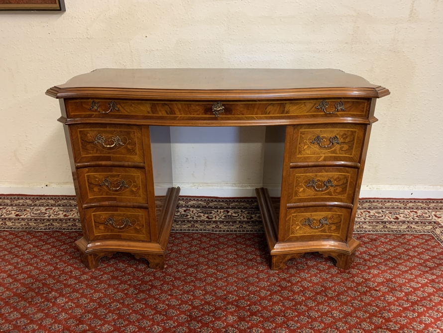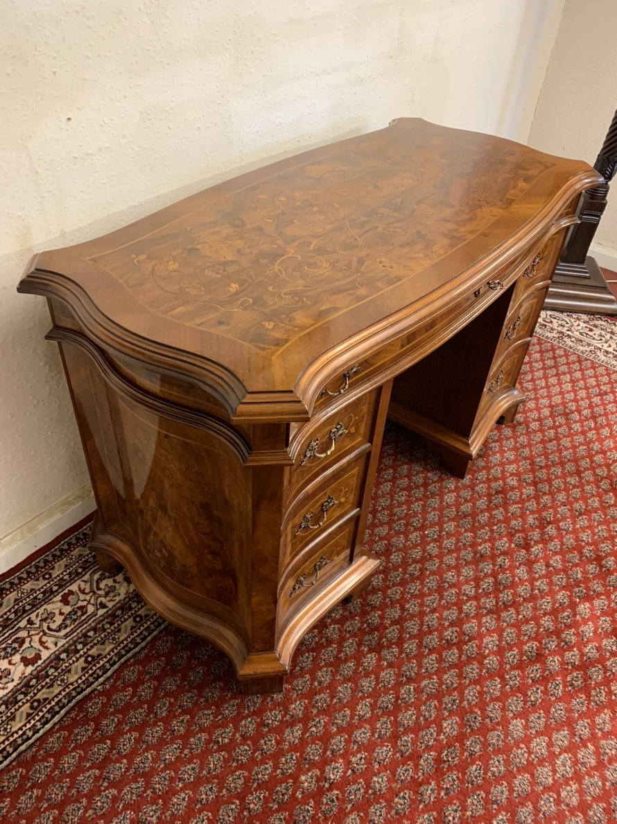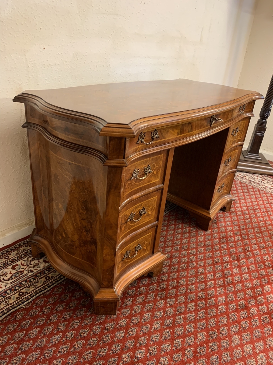 This stylish desk is in excellent condition. The shaped top has a cross banded edging and striking marquetry inlaid decoration. Below is a shaped lockable drawer, the drawer has a pair of ornate brass handles, brass escutcheon and key. The open knee hole section is flanked by a bank of three shaped marquetry inlaid drawers, each drawer having a decorative brass handle. The shaped sides also have striking marquetry inlay. This outstanding desk sits on eight bracket feet.