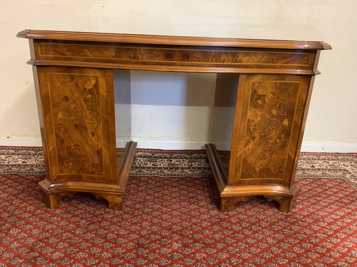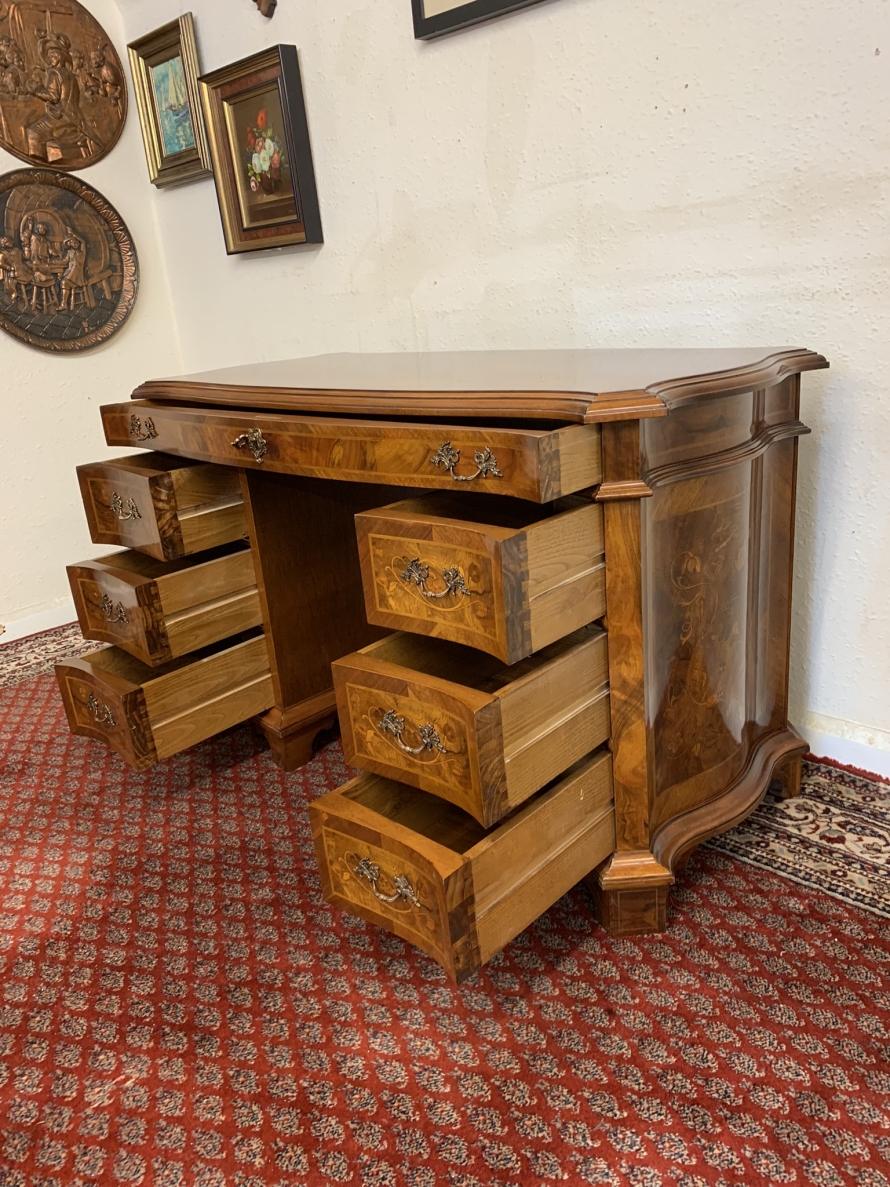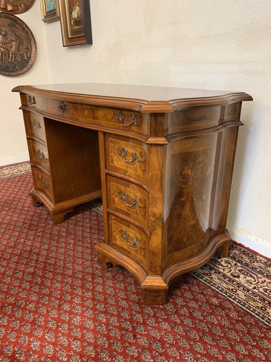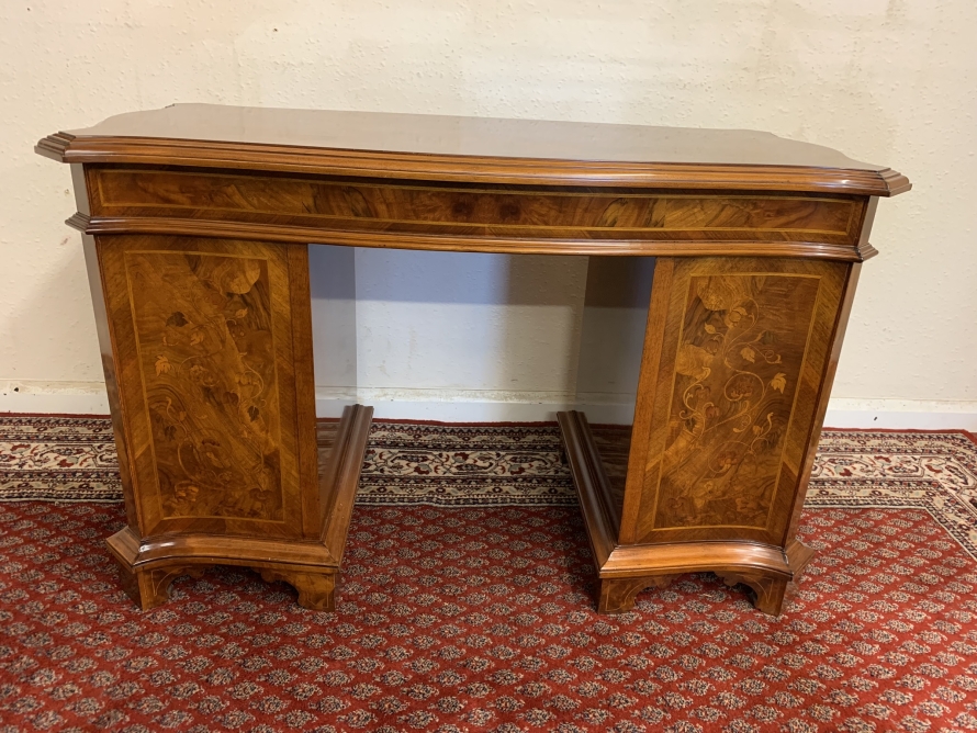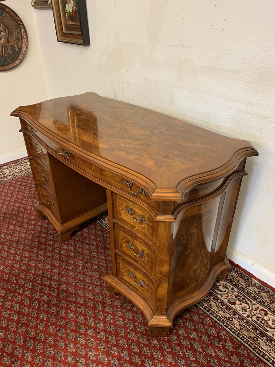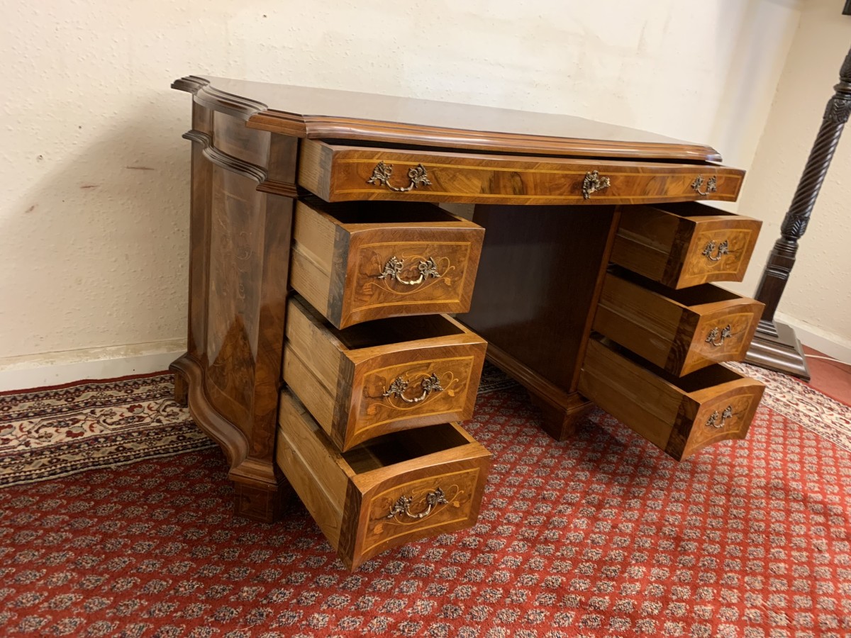 This stylish desk is in excellent condition. The shaped top has a cross banded edging and striking marquetry inlaid decoration. Below is a shaped lockable drawer, the drawer has a pair of ornate brass handles, brass escutcheon and key. The open knee hole section is flanked by a bank of three shaped marquetry inlaid drawers, each drawer having a decorative brass handle. The shaped sides also have striking marquetry inlay. This outstanding desk sits on eight bracket feet.