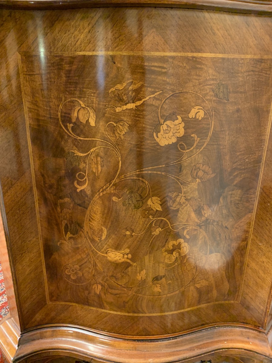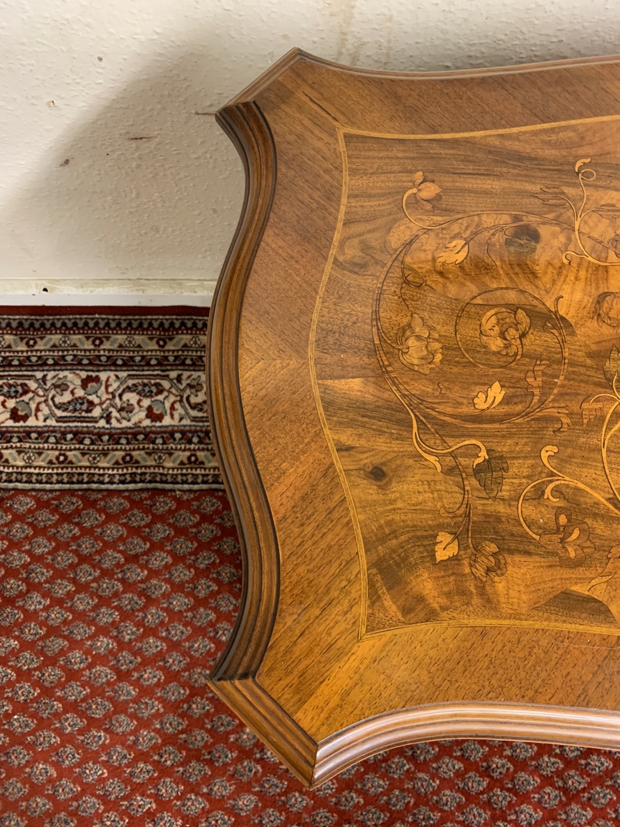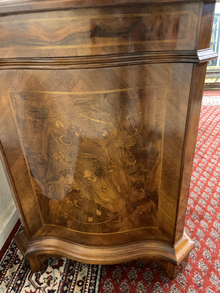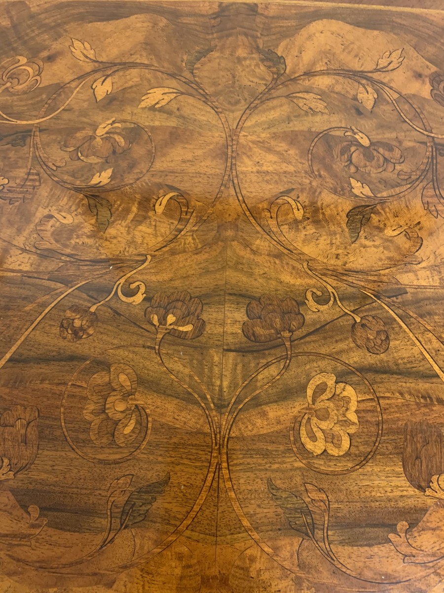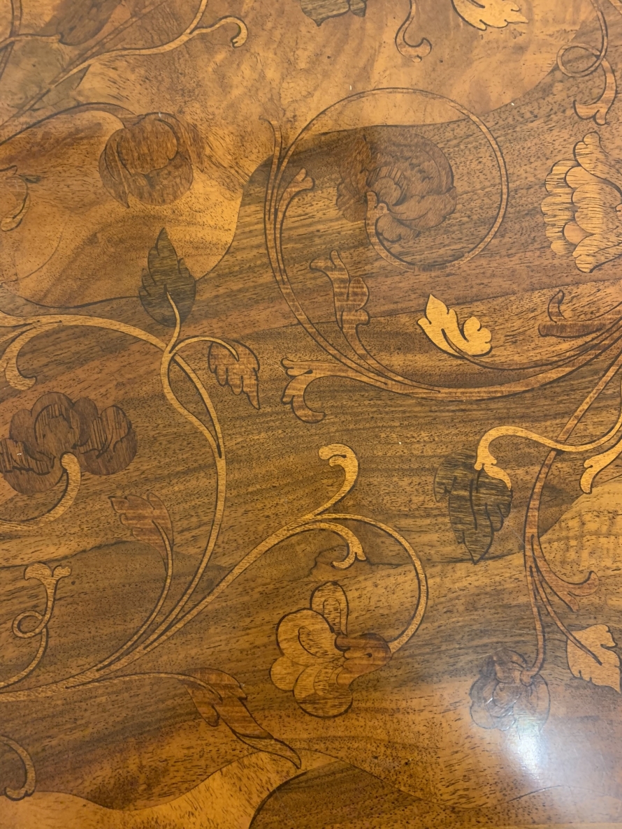 This stylish desk is in excellent condition. The shaped top has a cross banded edging and striking marquetry inlaid decoration. Below is a shaped lockable drawer, the drawer has a pair of ornate brass handles, brass escutcheon and key. The open knee hole section is flanked by a bank of three shaped marquetry inlaid drawers, each drawer having a decorative brass handle. The shaped sides also have striking marquetry inlay. This outstanding desk sits on eight bracket feet.