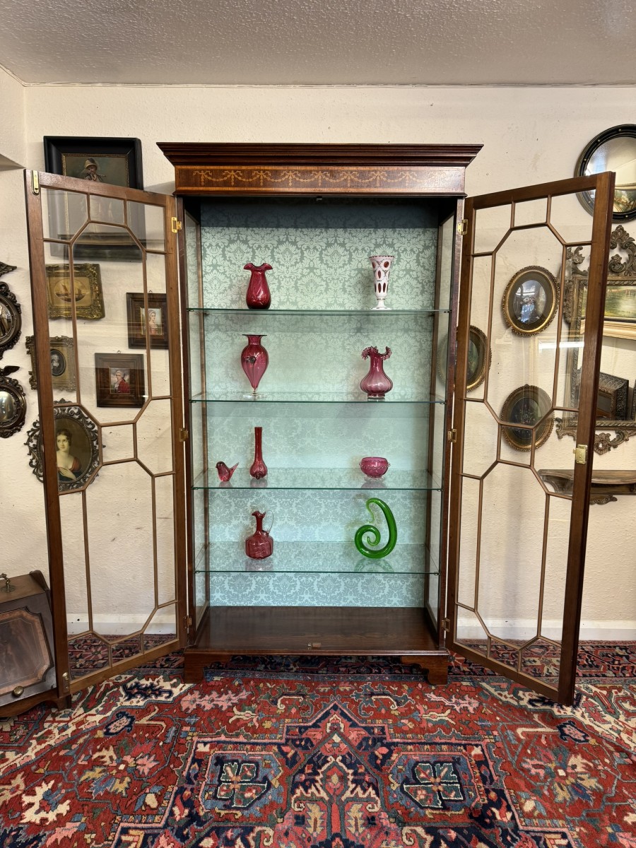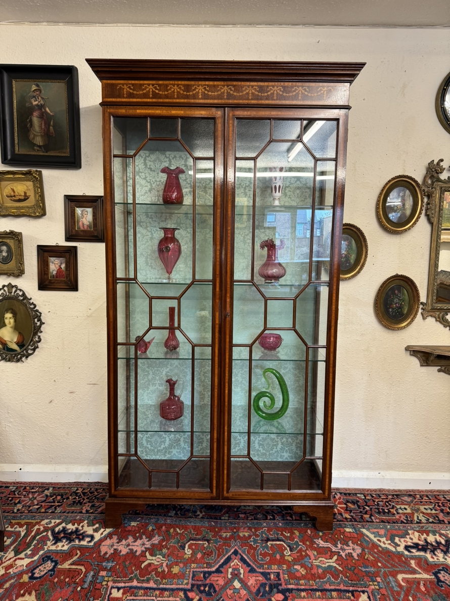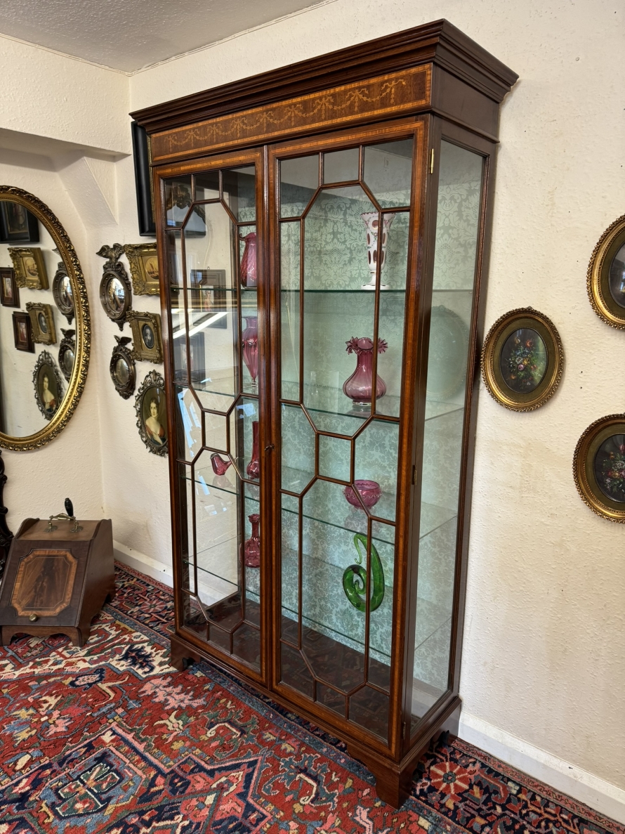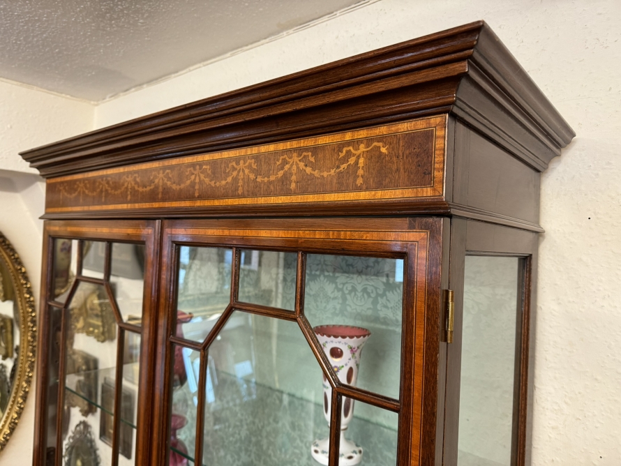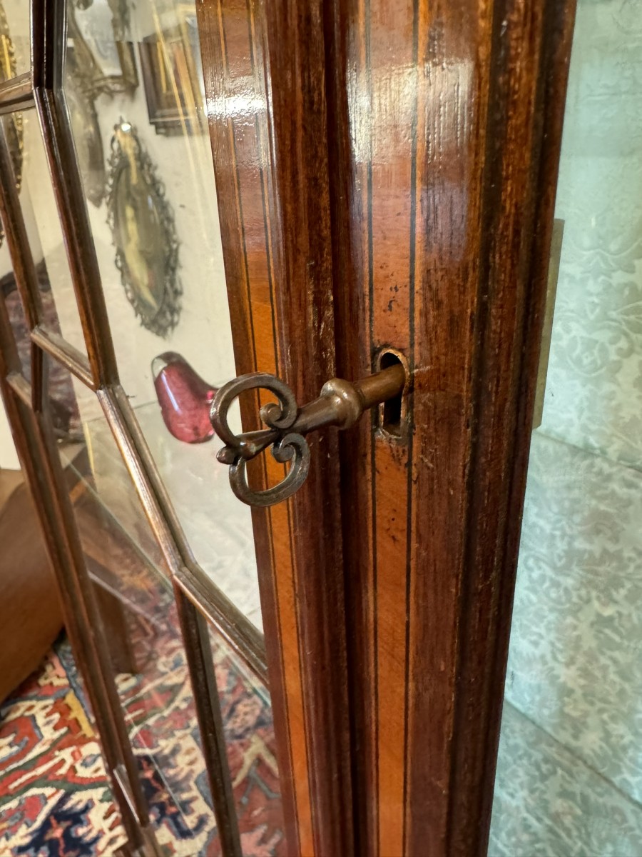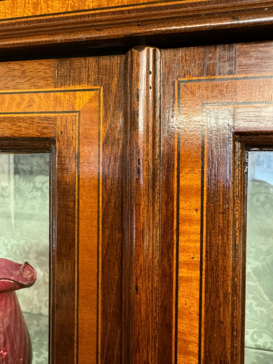 The stepped oversailing top sits above striking inlaid decoration. Two lockable glazed doors with ornate wood barring and inlaid decoration, the doors open to reveal four adjustable and removable glass shelves with a demask fabric back. Full length glazed sides this fabulous cabinet stands on four bracket feet.