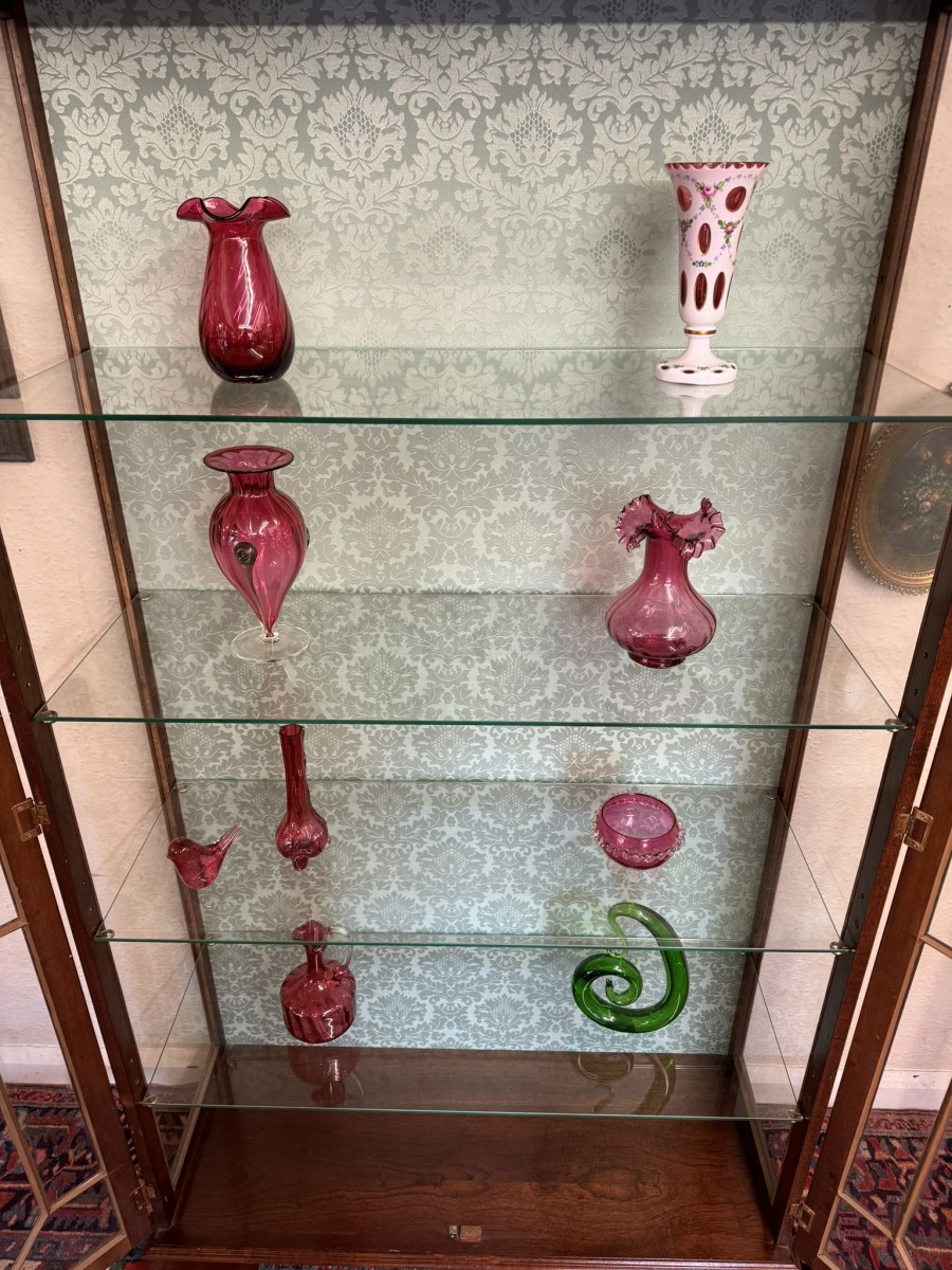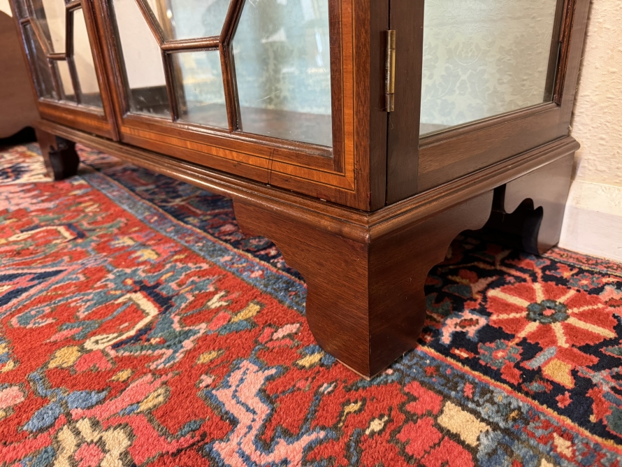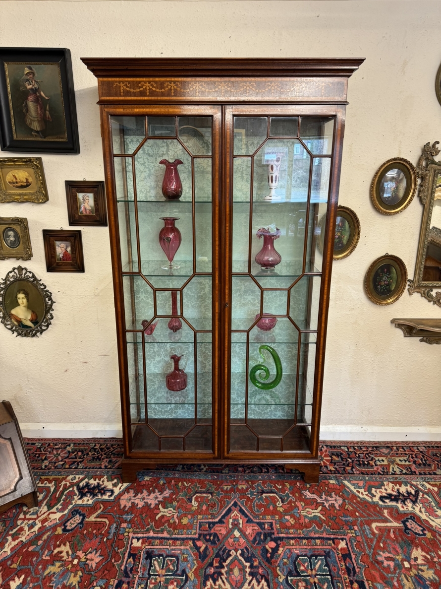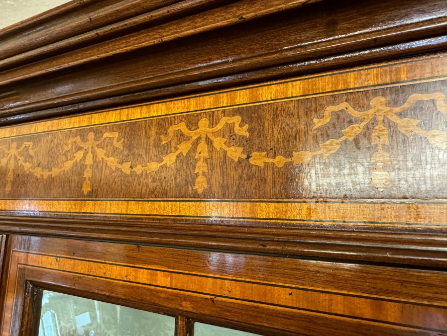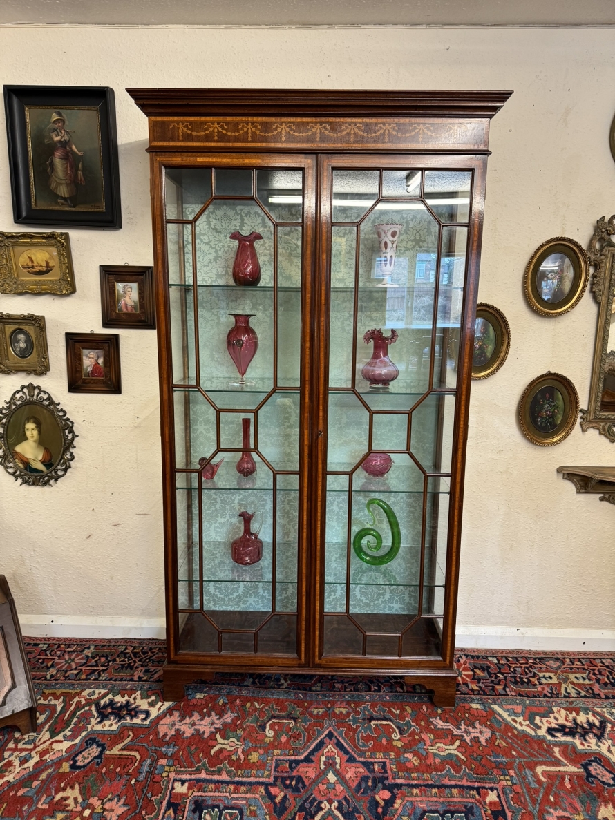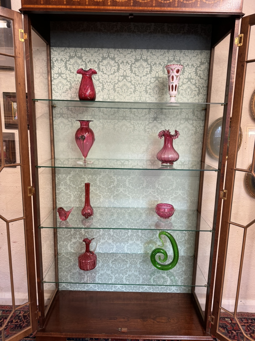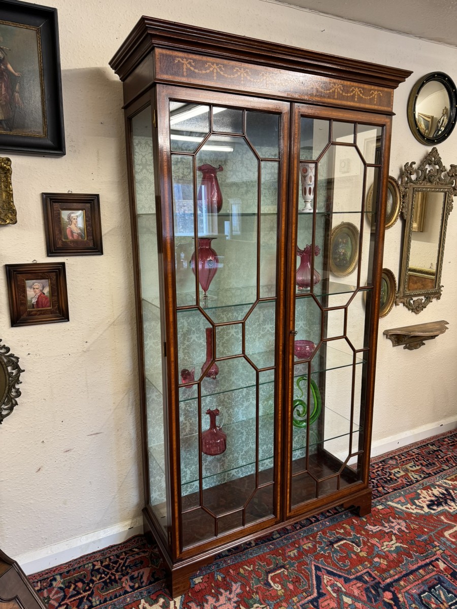 The stepped oversailing top sits above striking inlaid decoration. Two lockable glazed doors with ornate wood barring and inlaid decoration, the doors open to reveal four adjustable and removable glass shelves with a demask fabric back. Full length glazed sides this fabulous cabinet stands on four bracket feet.