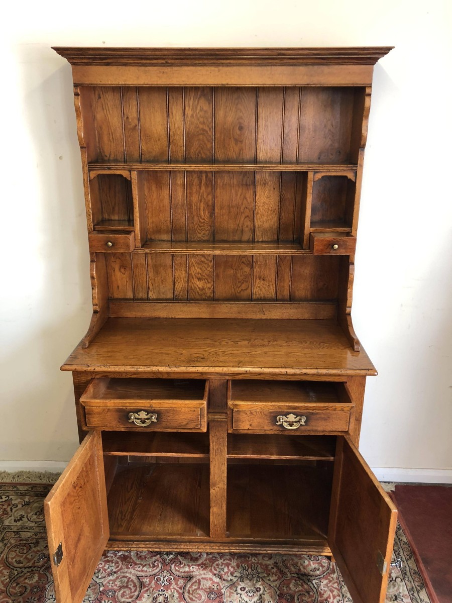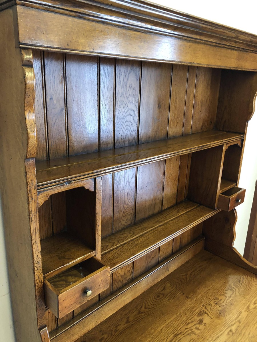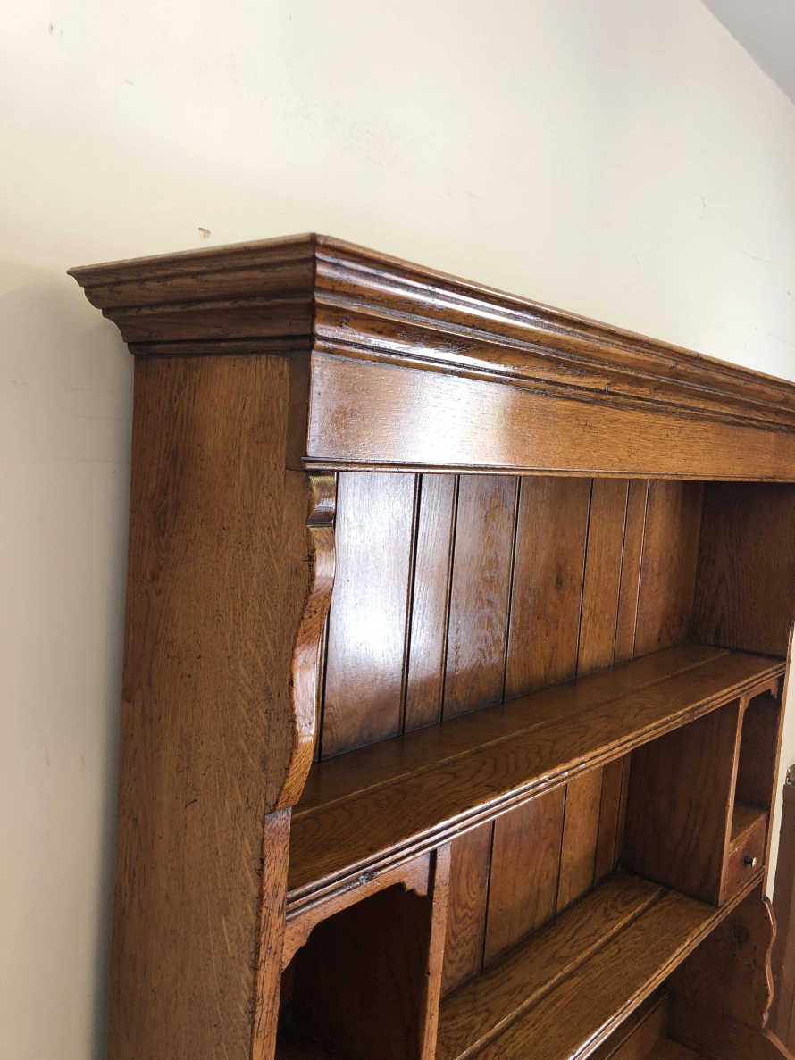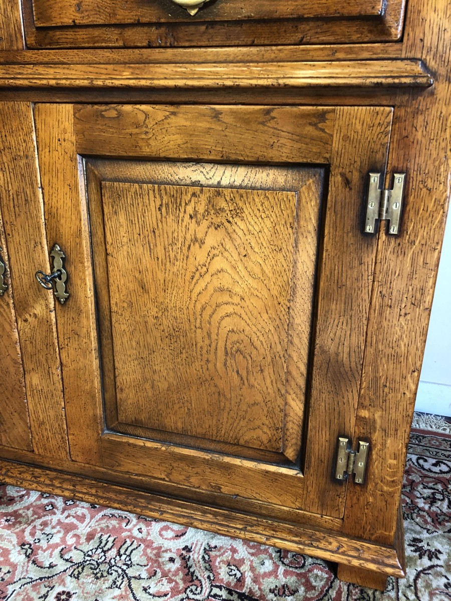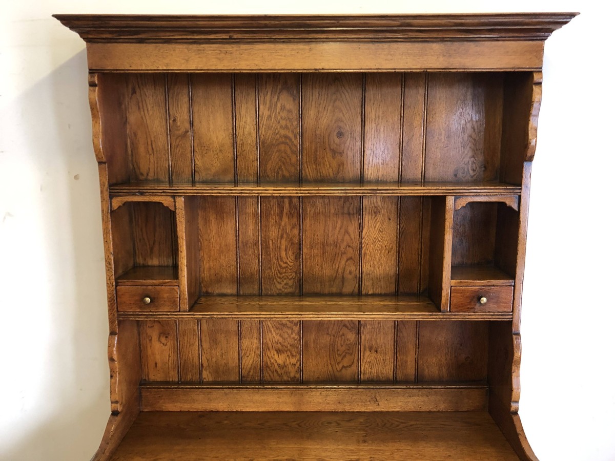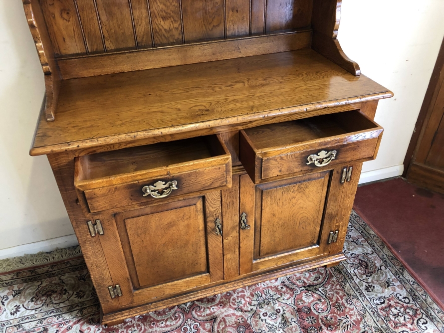 We are delighted to offer this beautiful dresser which is made entirely of solid oak. The removable rack has a boarded back, two shelves and two small drawers. The base has an over sailing top which sits above a pair of drawers, each drawer having decorative brass handle. Below are a pair of recessed panelled lockable drawers each drawer having traditional H hinges, key and brass escutcheon. The doors open to reveal a shelf and ample storage. This great dresser sits on traditional block feet. An outstanding quality item of furniture which would enhance any home.