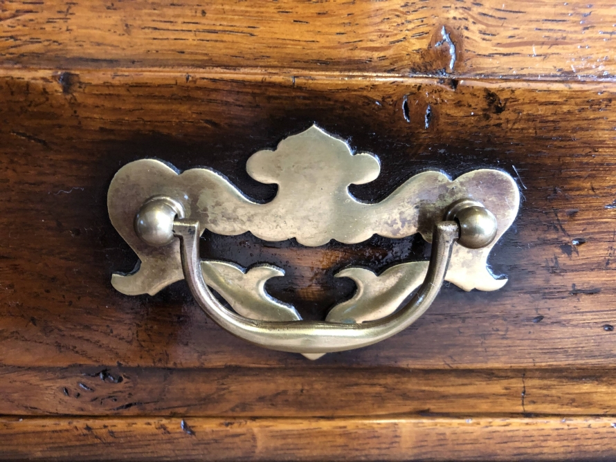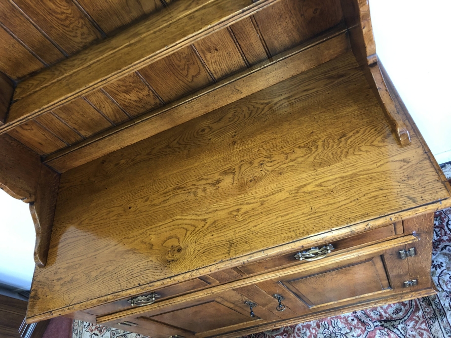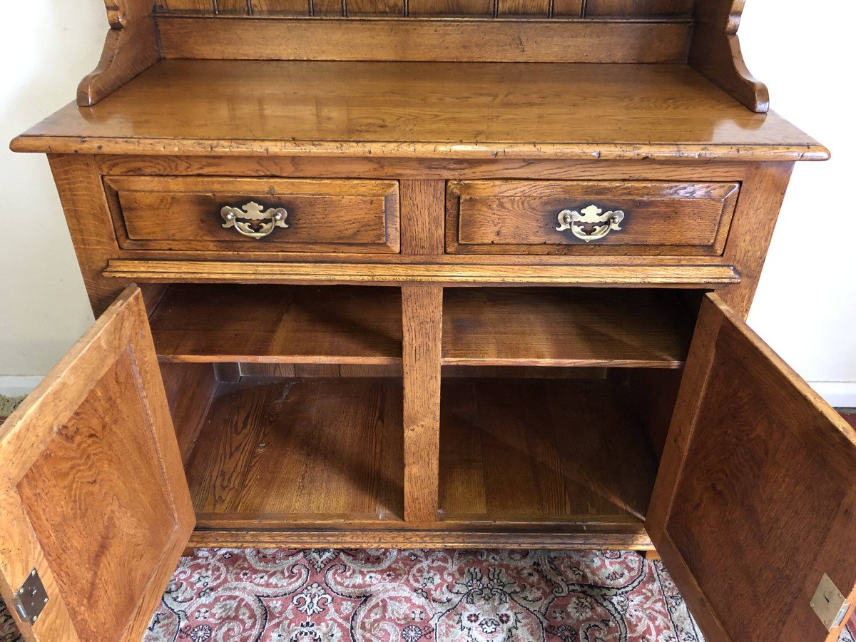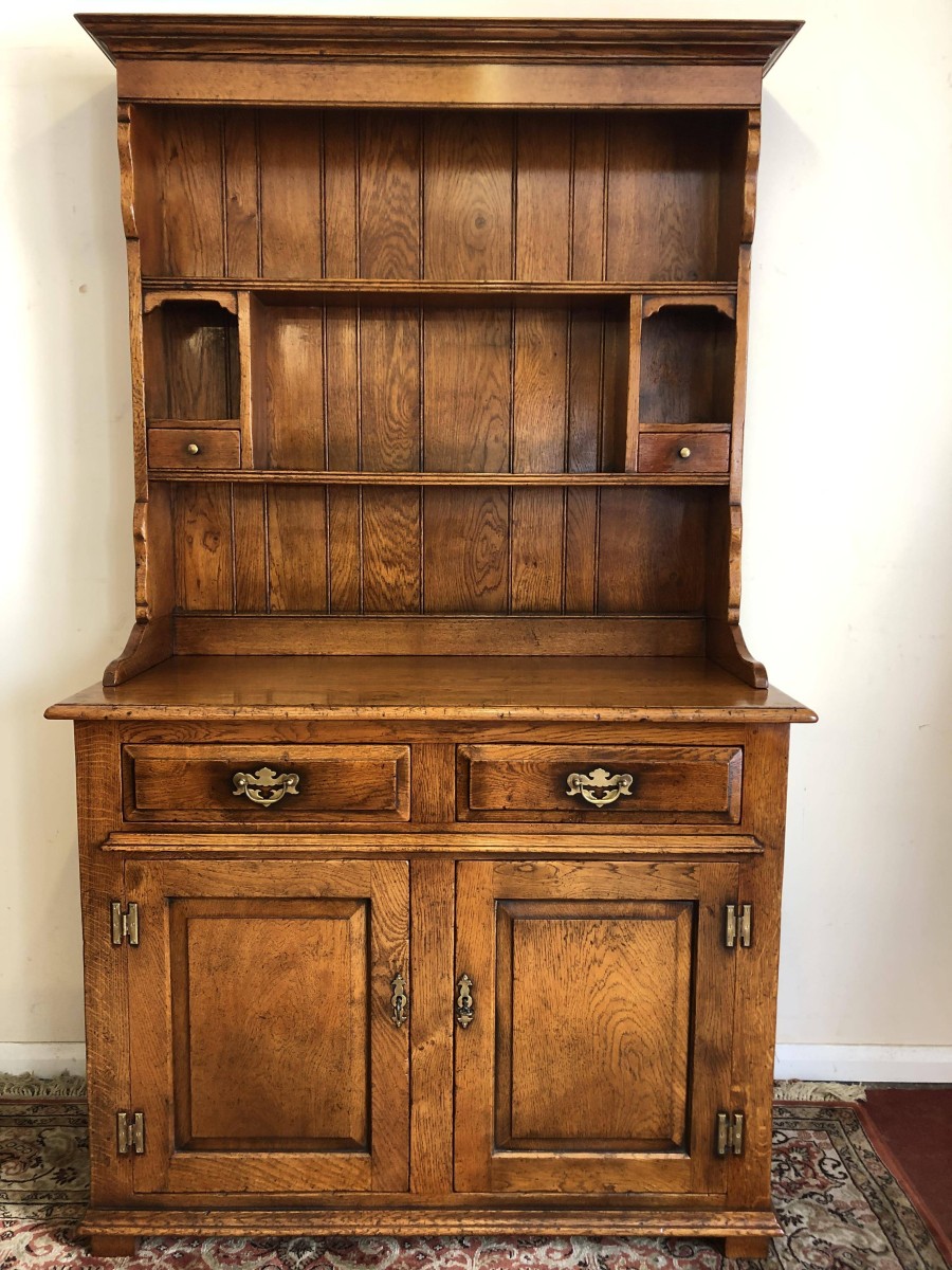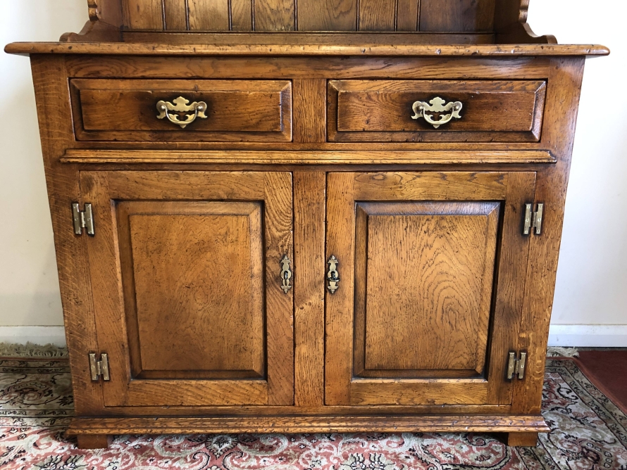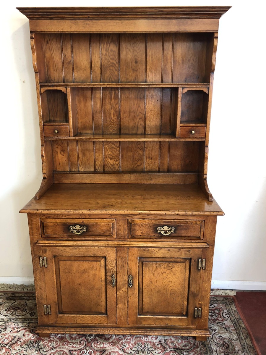 We are delighted to offer this beautiful dresser which is made entirely of solid oak. The removable rack has a boarded back, two shelves and two small drawers. The base has an over sailing top which sits above a pair of drawers, each drawer having decorative brass handle. Below are a pair of recessed panelled lockable drawers each drawer having traditional H hinges, key and brass escutcheon. The doors open to reveal a shelf and ample storage. This great dresser sits on traditional block feet. An outstanding quality item of furniture which would enhance any home.