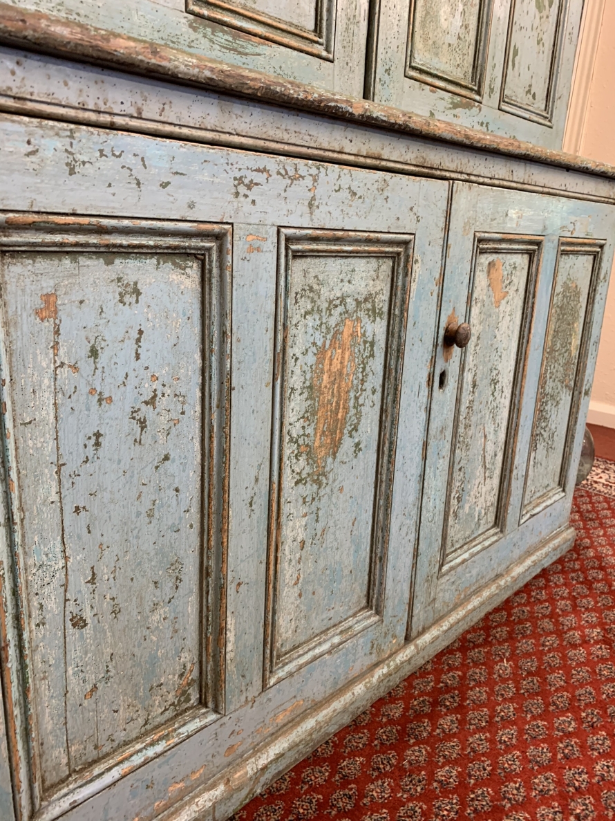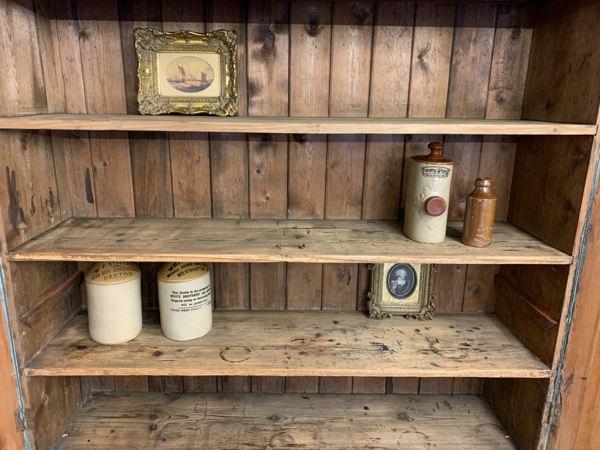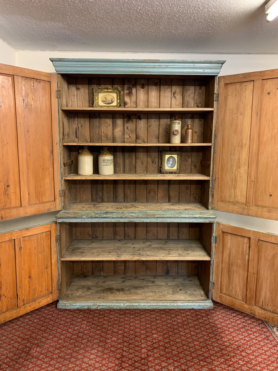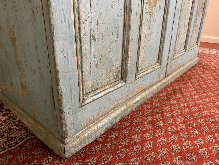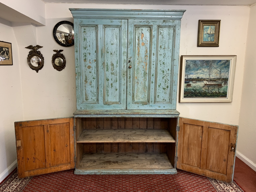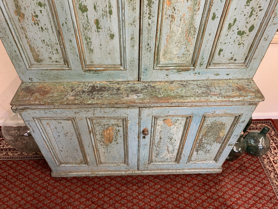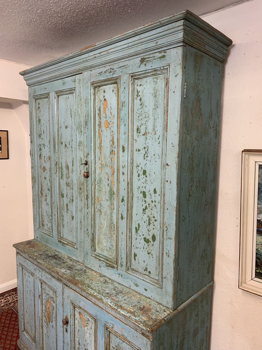 This on trend free standing cupboard is striking on the eye. Excellently proportioned and showcasing its vintage old paint over original scumble paint. The oversailing top sits above two double panelled doors, the doors open to reveal three fixed shelves. Below are a pair of double panelled doors which open to reveal a fixed shelf. The cupboard sits on a plinth base. This super stylish cupboard which dates circa 1860 offers ample storage.