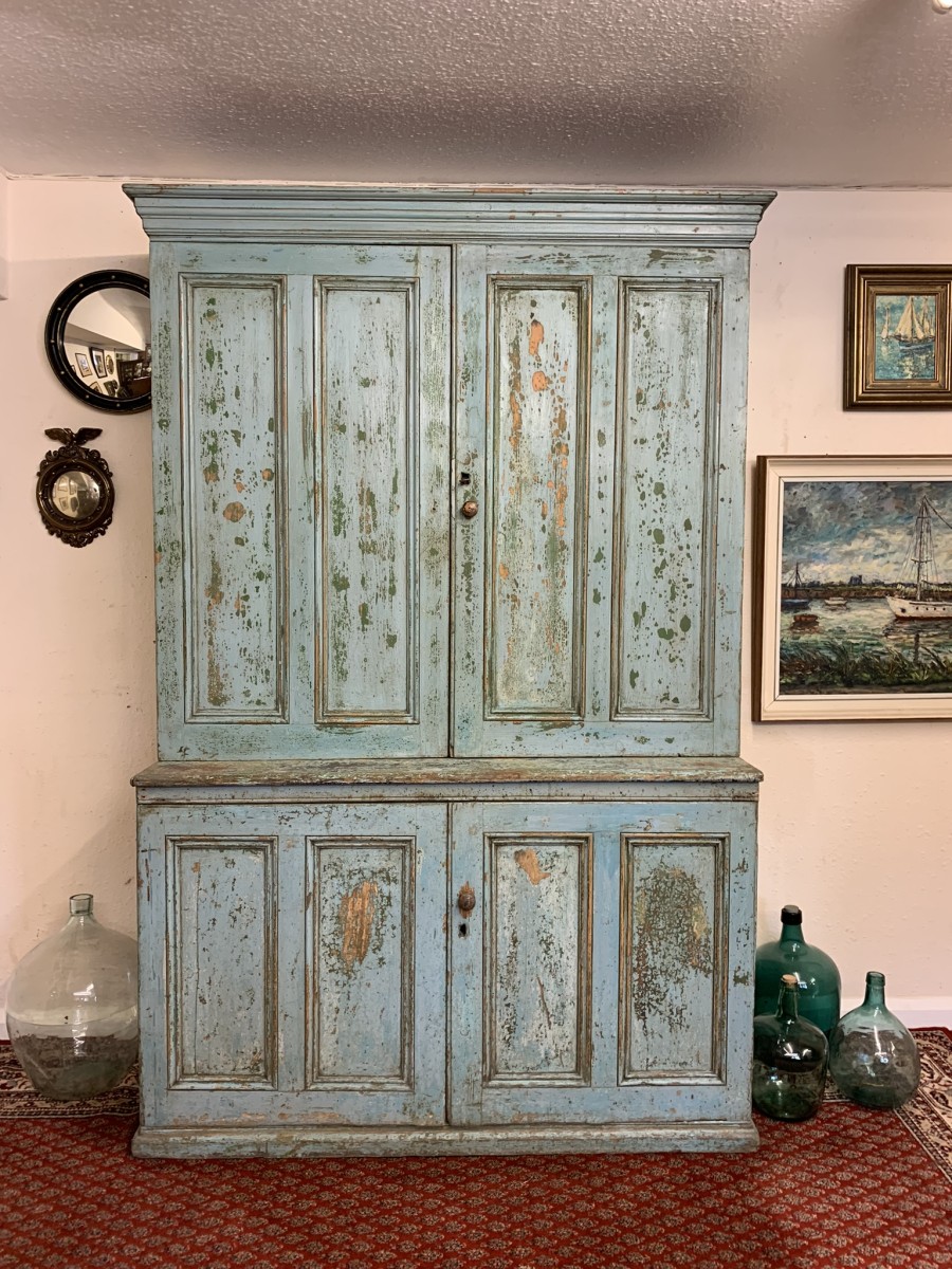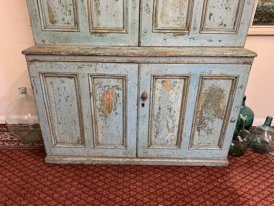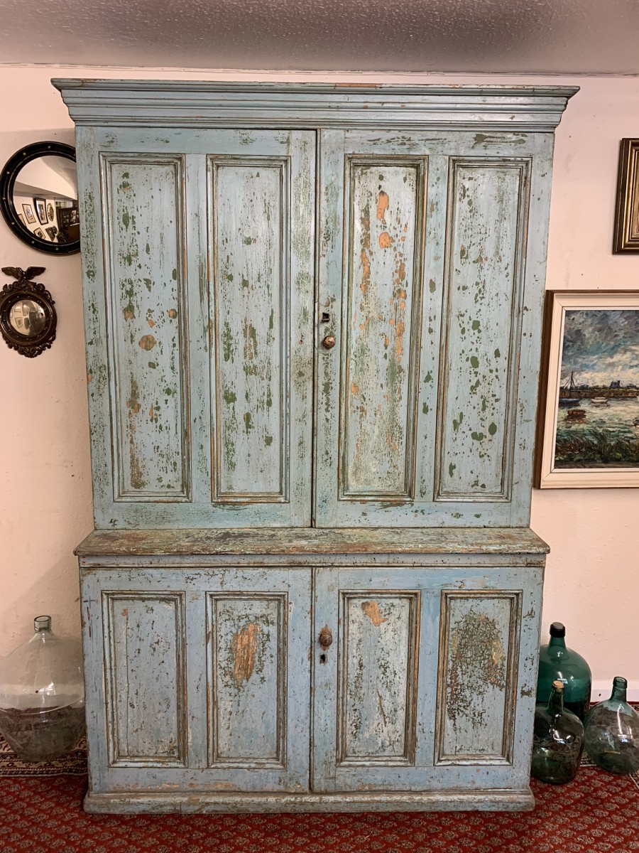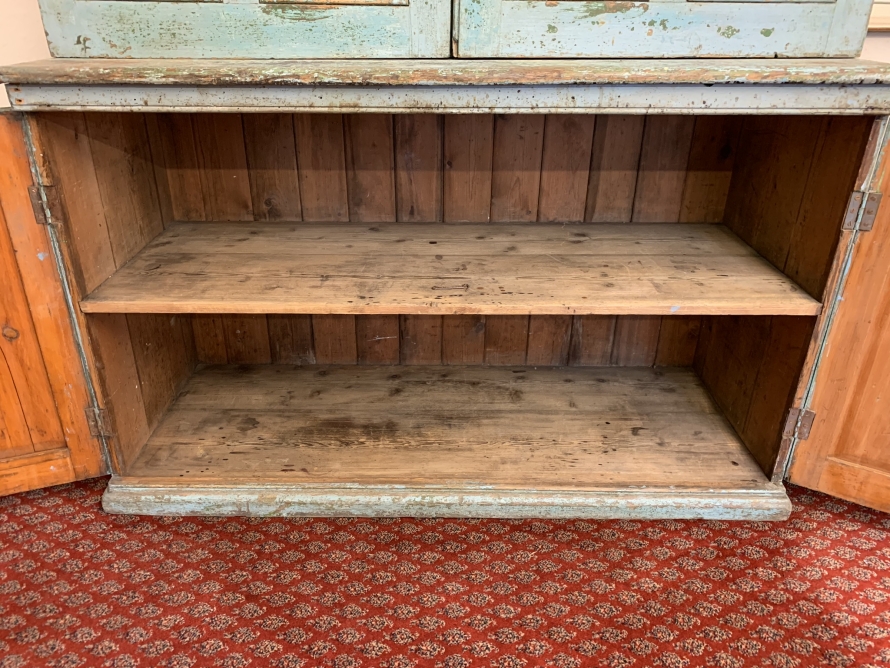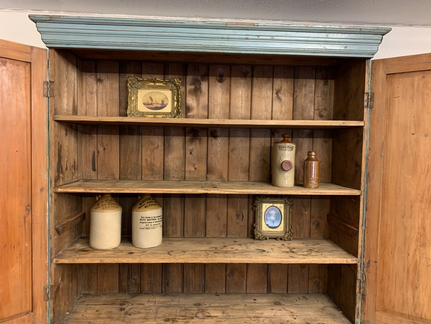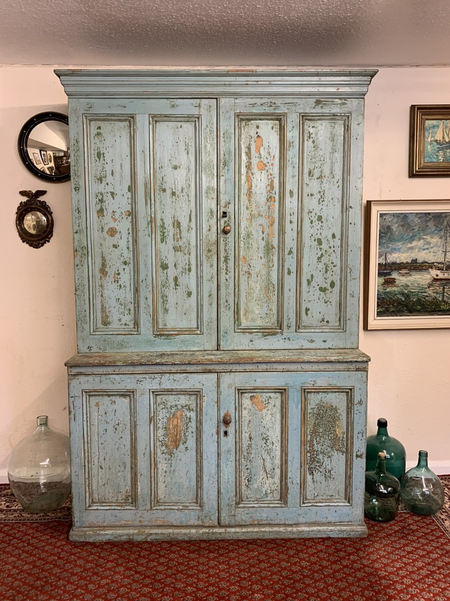 This on trend free standing cupboard is striking on the eye. Excellently proportioned and showcasing its vintage old paint over original scumble paint. The oversailing top sits above two double panelled doors, the doors open to reveal three fixed shelves. Below are a pair of double panelled doors which open to reveal a fixed shelf. The cupboard sits on a plinth base. This super stylish cupboard which dates circa 1860 offers ample storage.