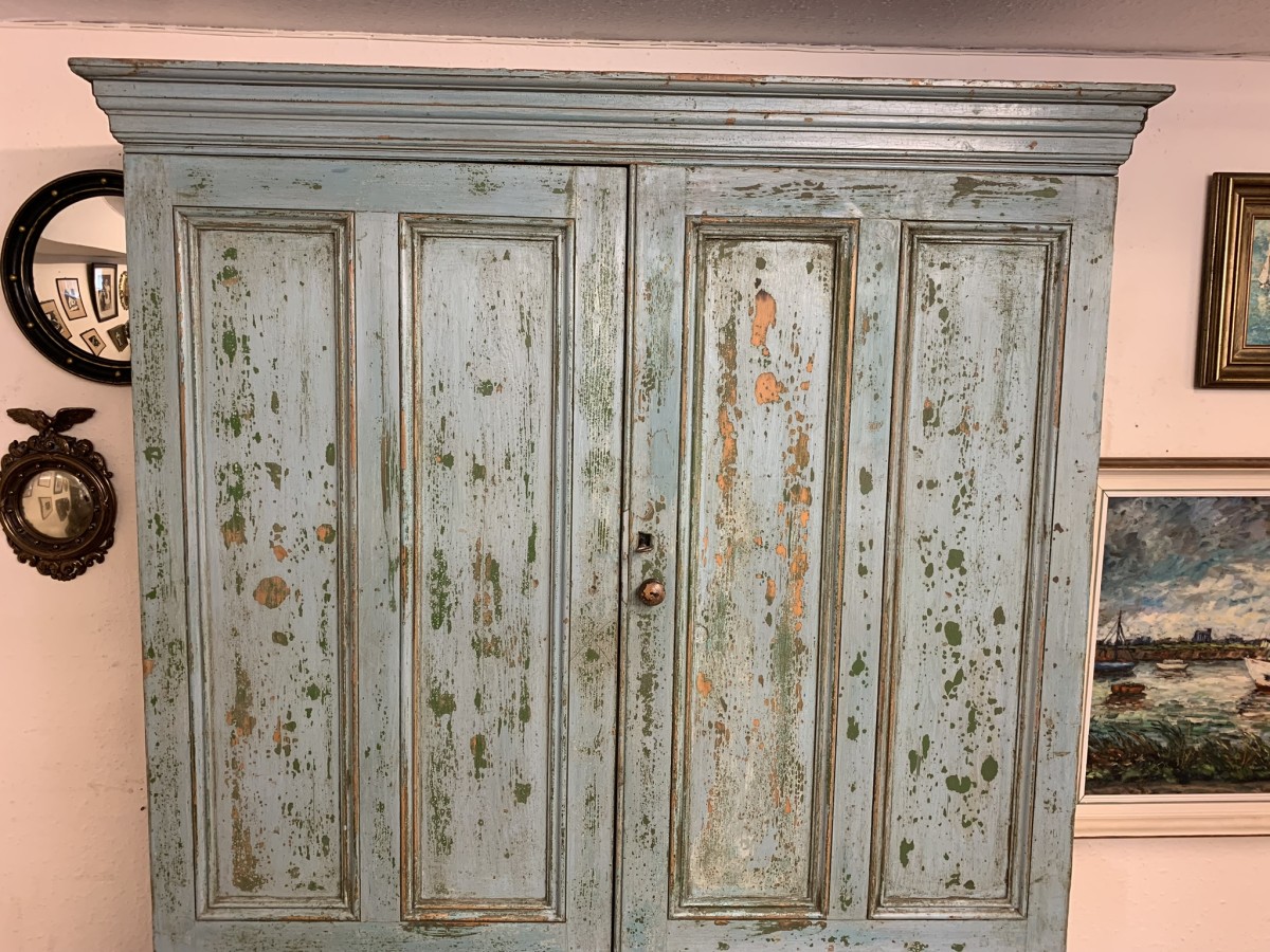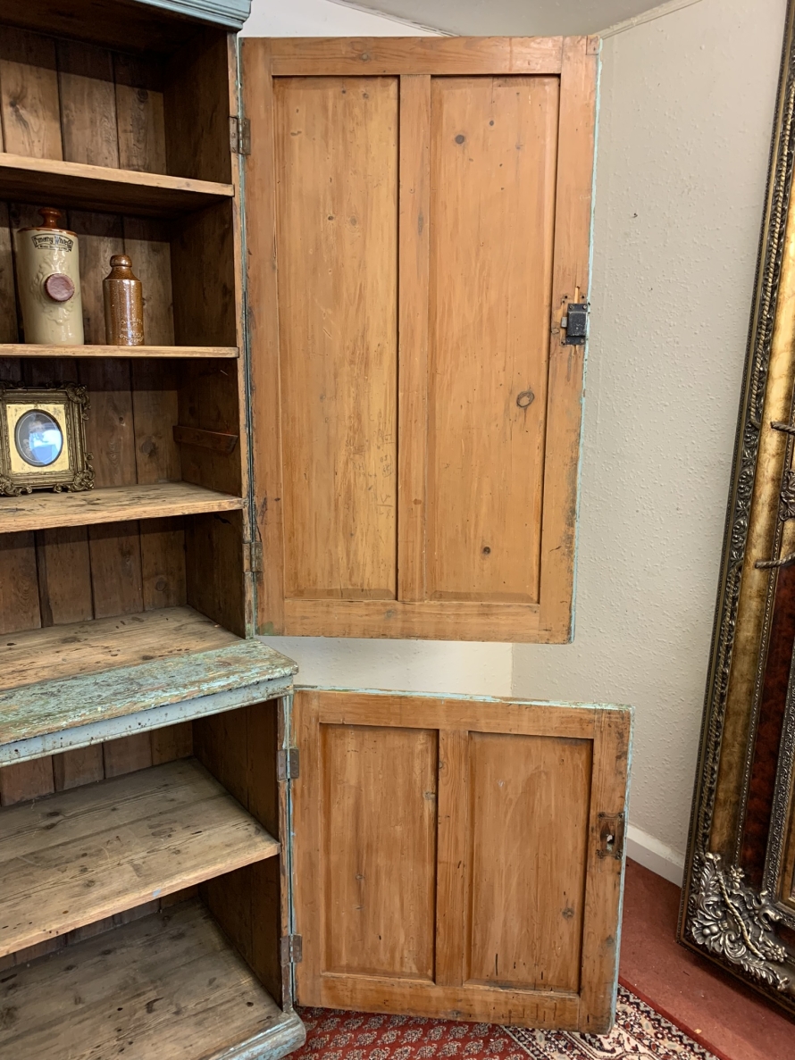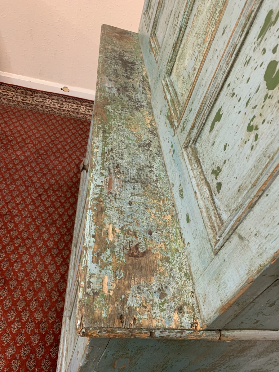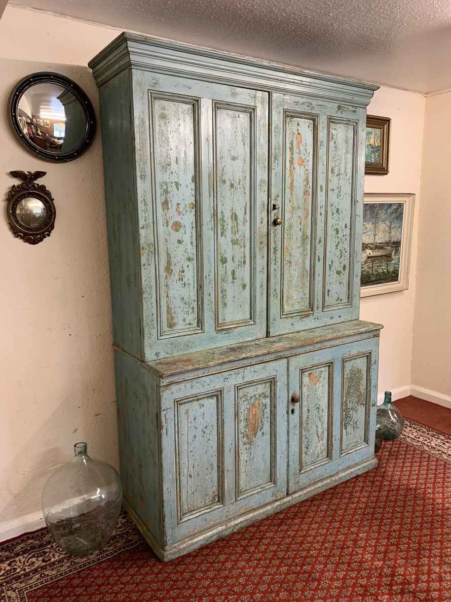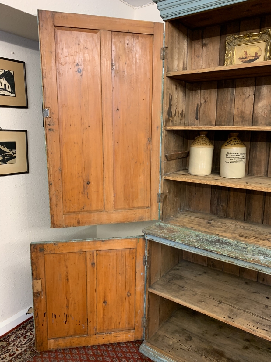 This on trend free standing cupboard is striking on the eye. Excellently proportioned and showcasing its vintage old paint over original scumble paint. The oversailing top sits above two double panelled doors, the doors open to reveal three fixed shelves. Below are a pair of double panelled doors which open to reveal a fixed shelf. The cupboard sits on a plinth base. This super stylish cupboard which dates circa 1860 offers ample storage.
