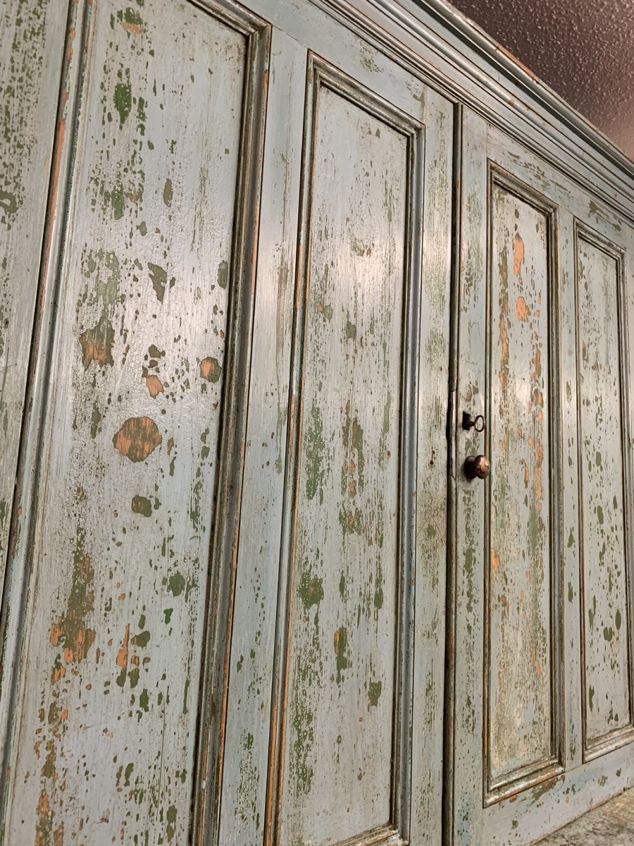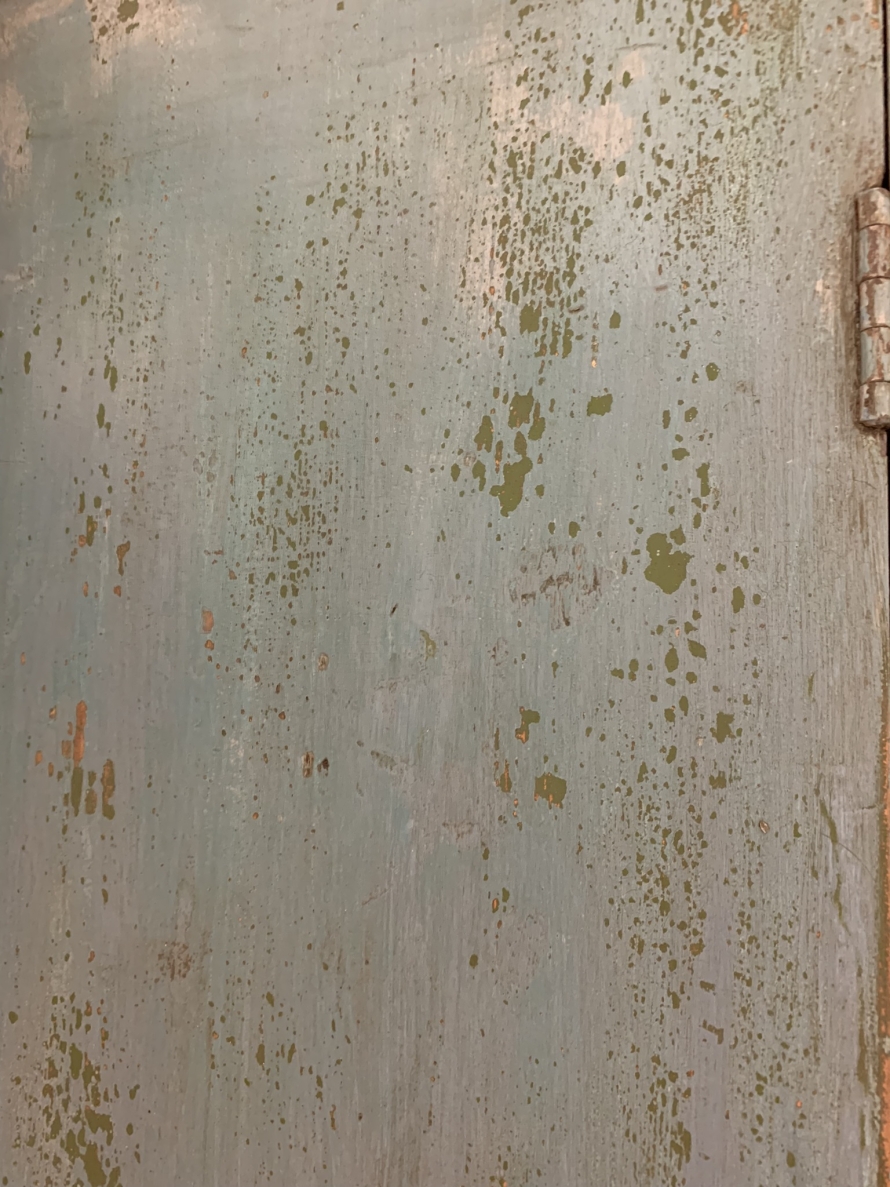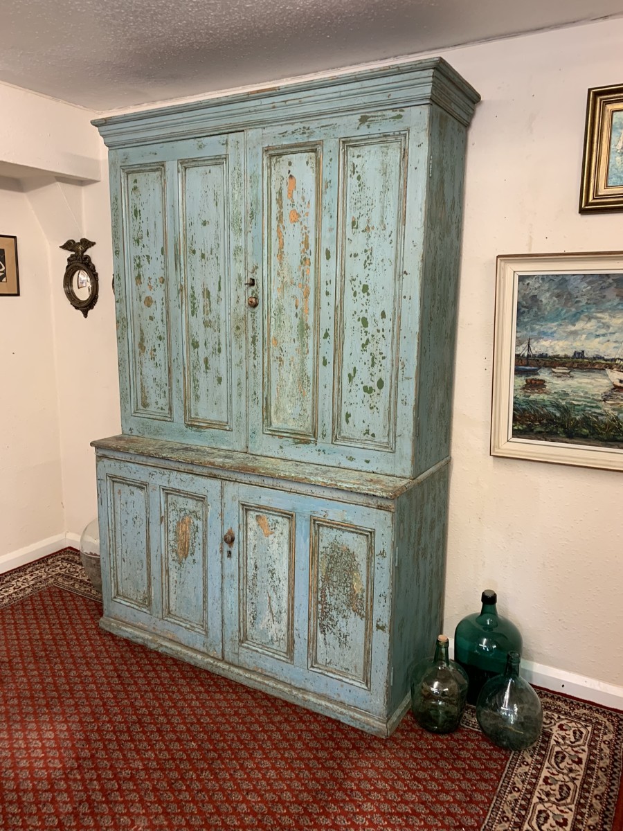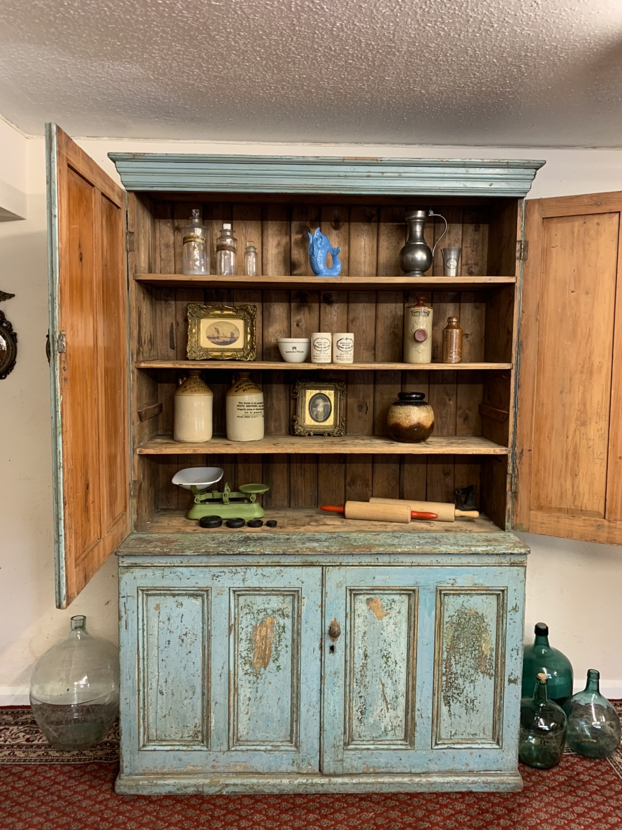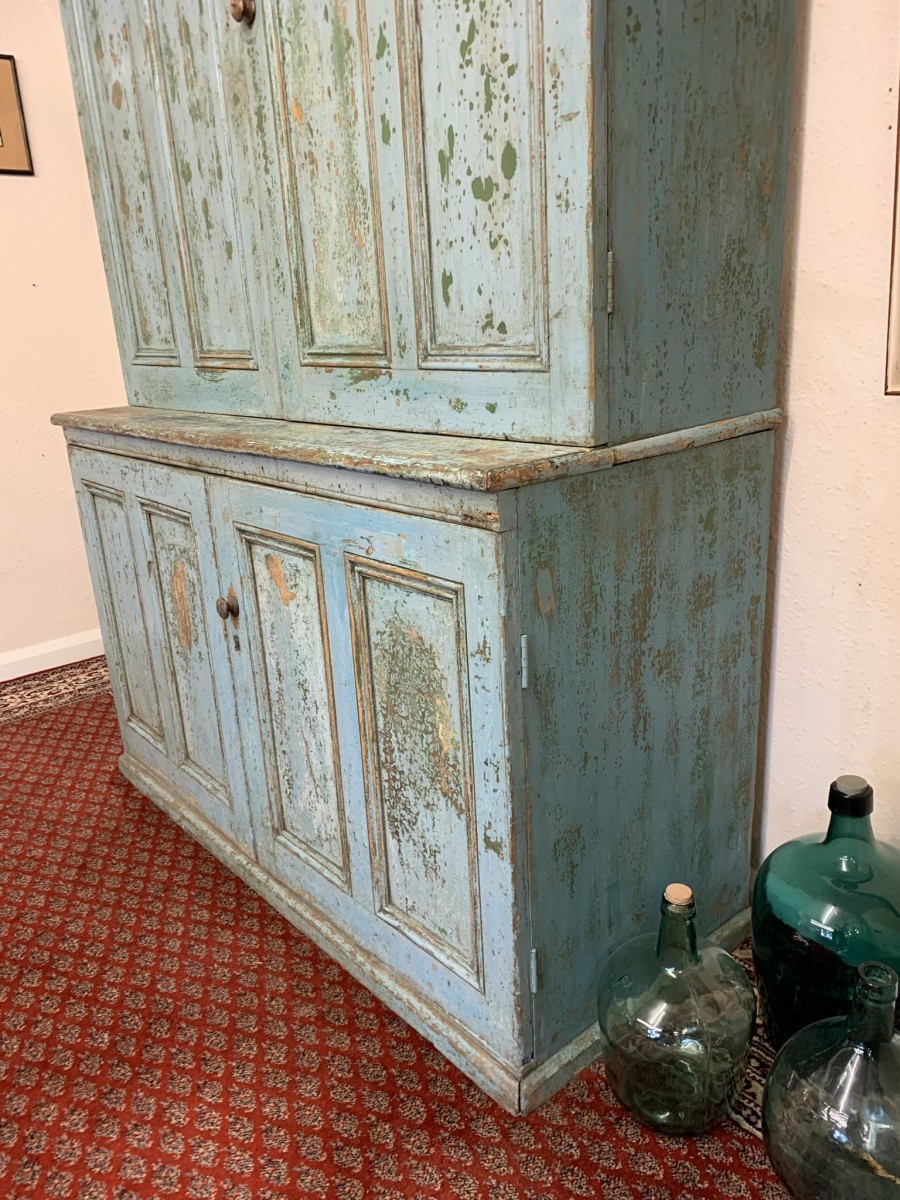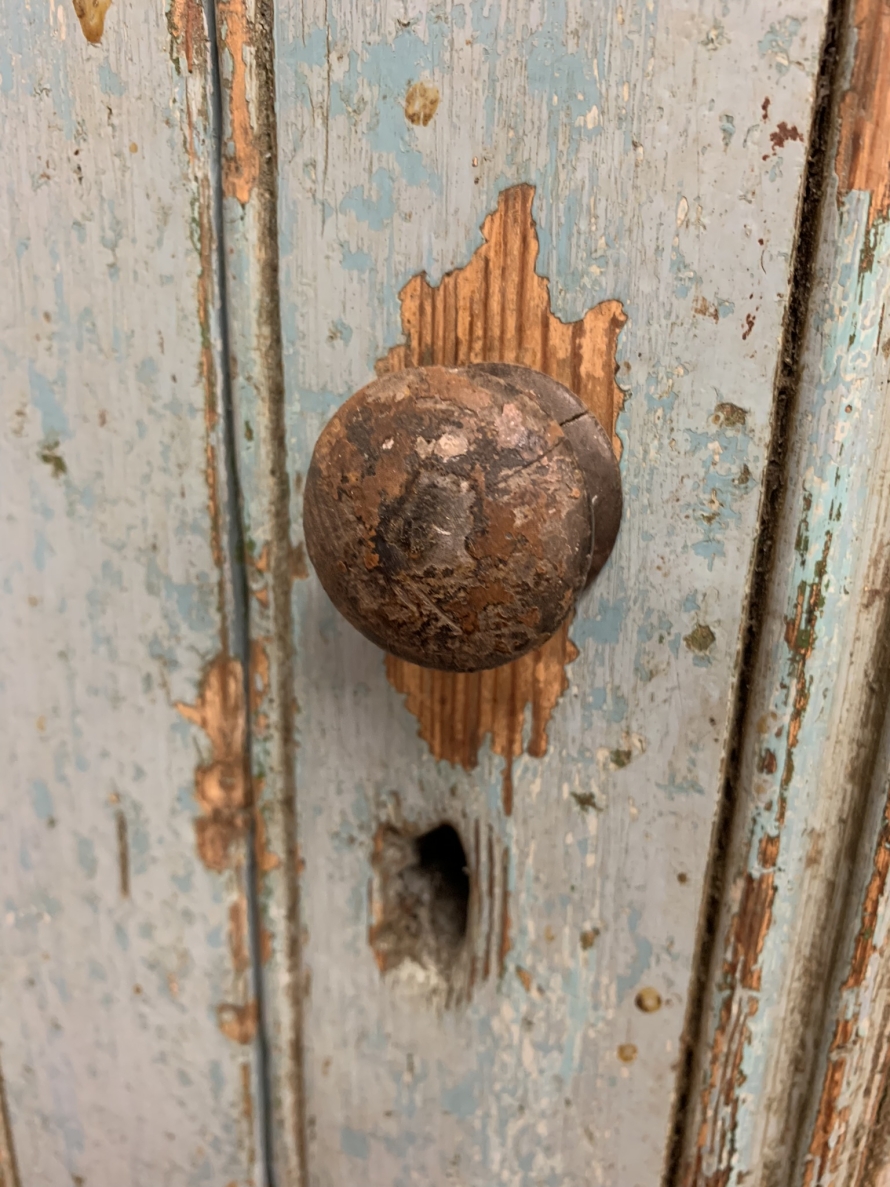 This on trend free standing cupboard is striking on the eye. Excellently proportioned and showcasing its vintage old paint over original scumble paint. The oversailing top sits above two double panelled doors, the doors open to reveal three fixed shelves. Below are a pair of double panelled doors which open to reveal a fixed shelf. The cupboard sits on a plinth base. This super stylish cupboard which dates circa 1860 offers ample storage.