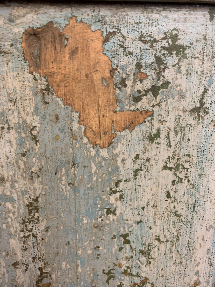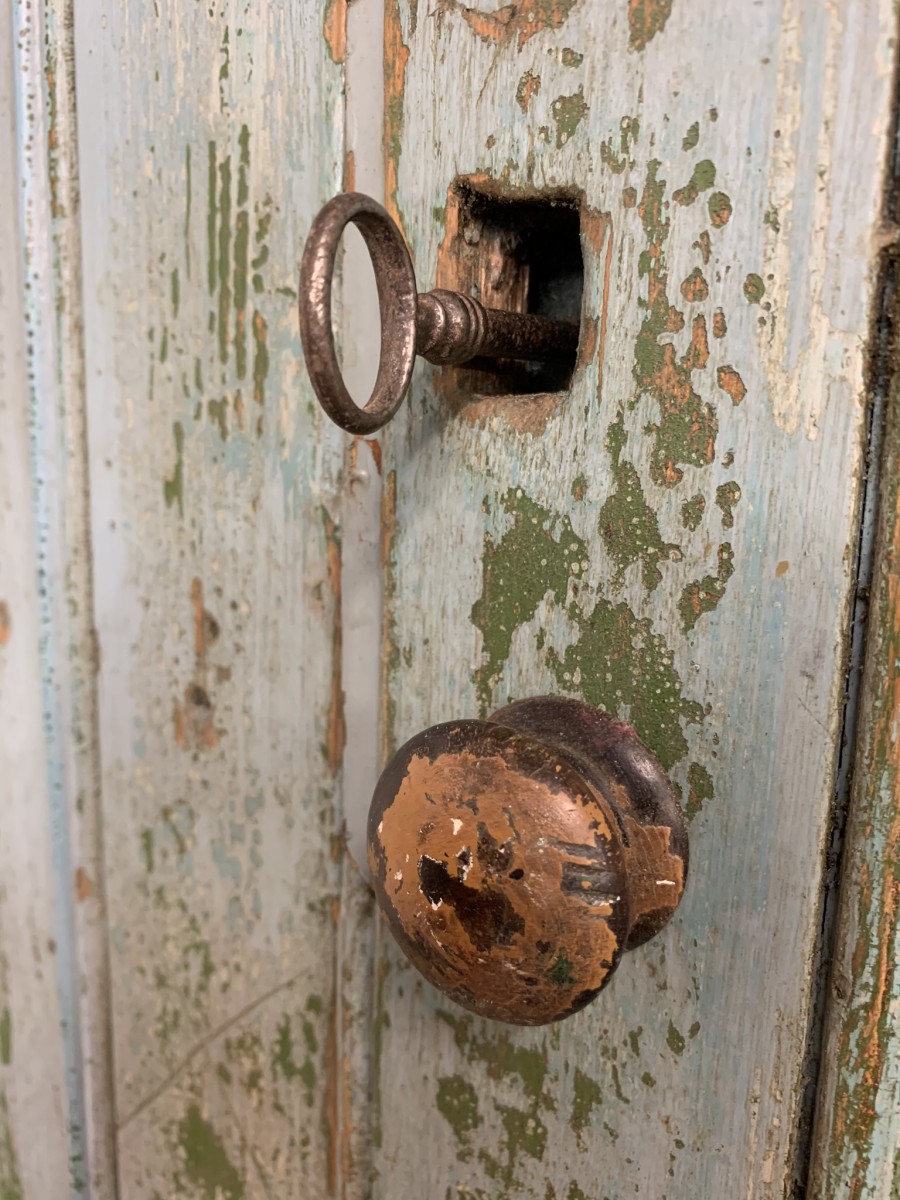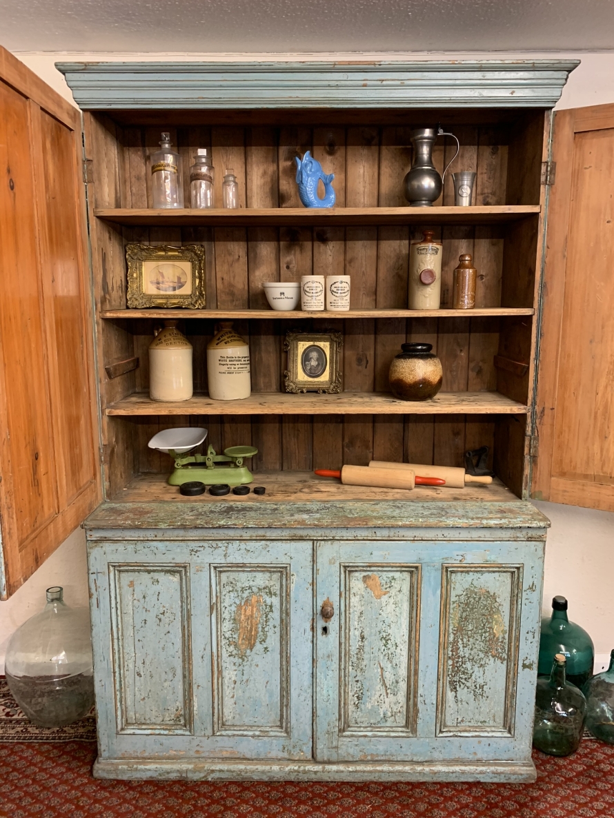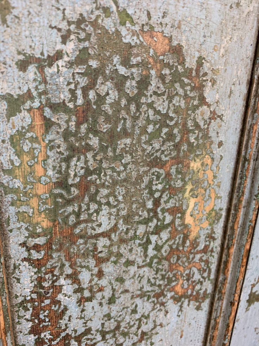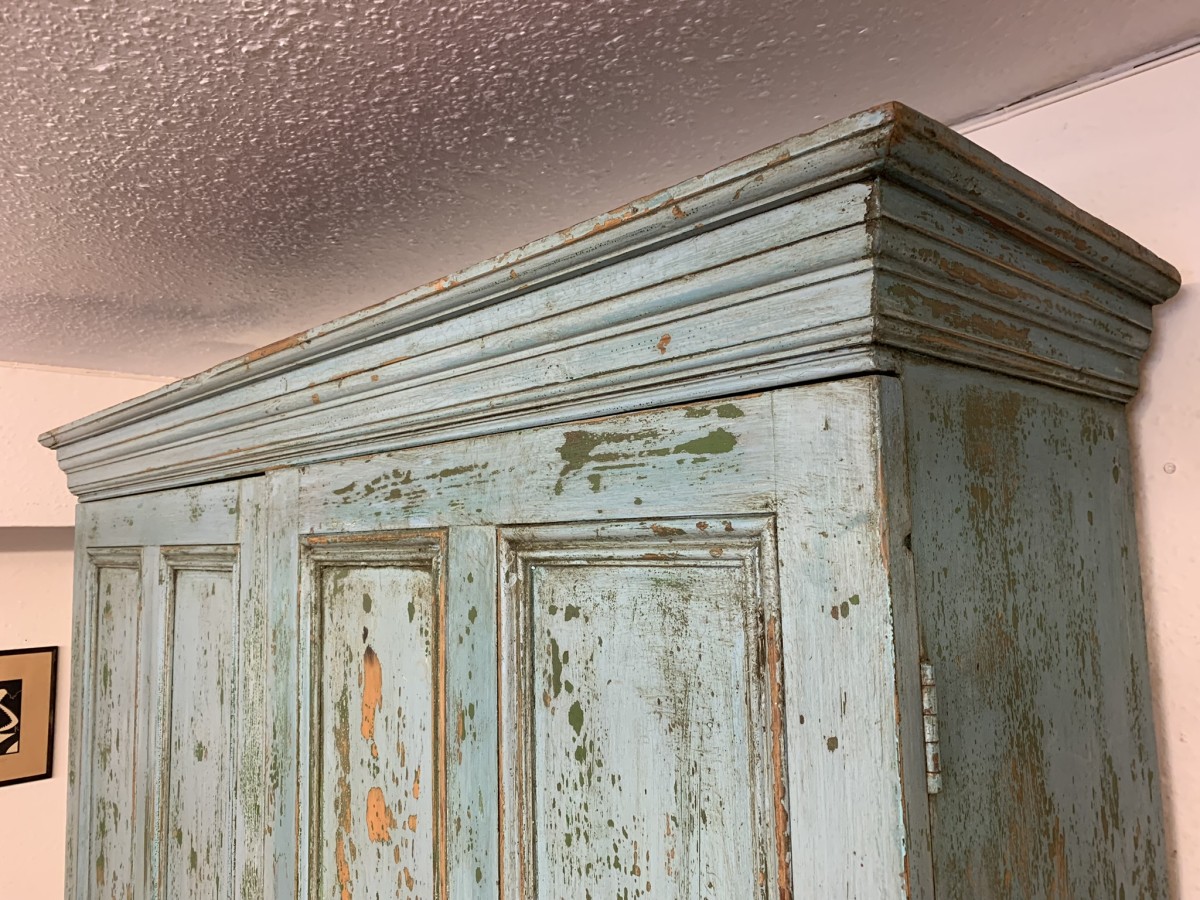 This on trend free standing cupboard is striking on the eye. Excellently proportioned and showcasing its vintage old paint over original scumble paint. The oversailing top sits above two double panelled doors, the doors open to reveal three fixed shelves. Below are a pair of double panelled doors which open to reveal a fixed shelf. The cupboard sits on a plinth base. This super stylish cupboard which dates circa 1860 offers ample storage.