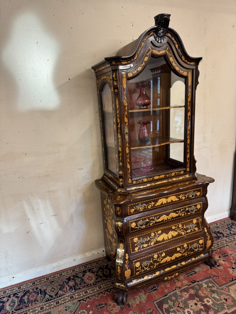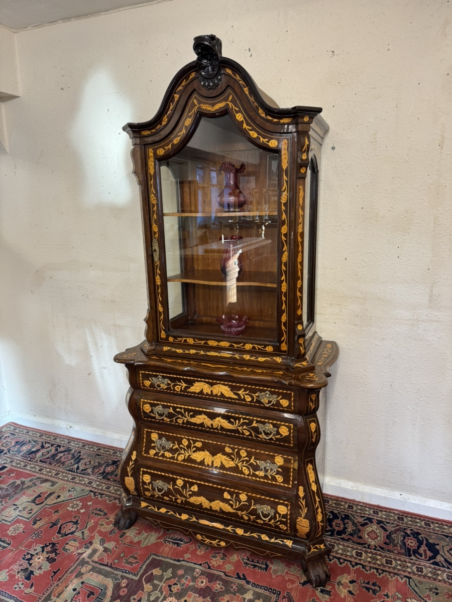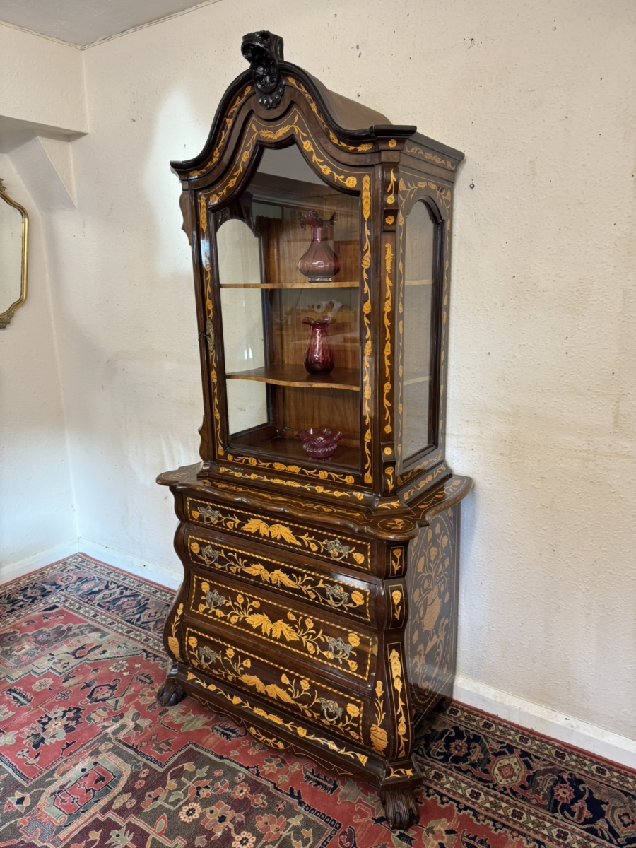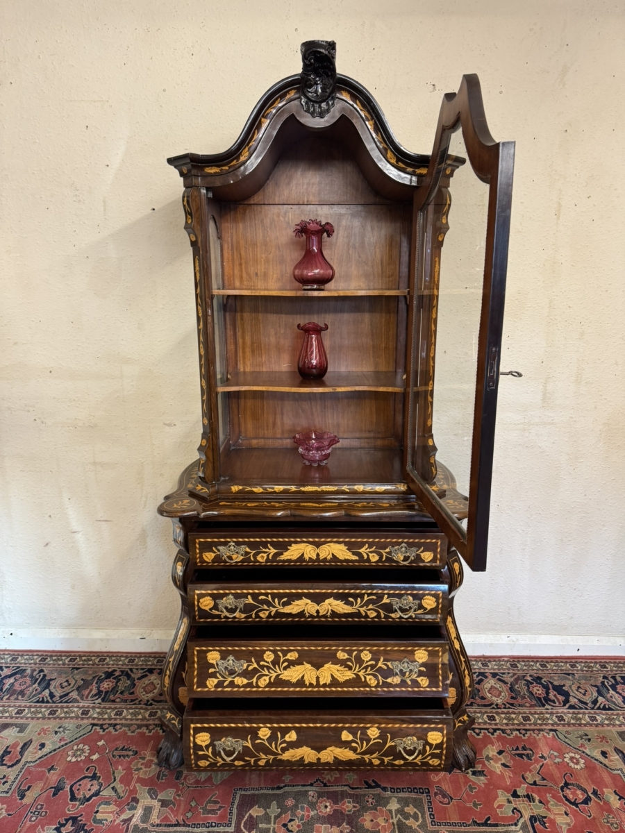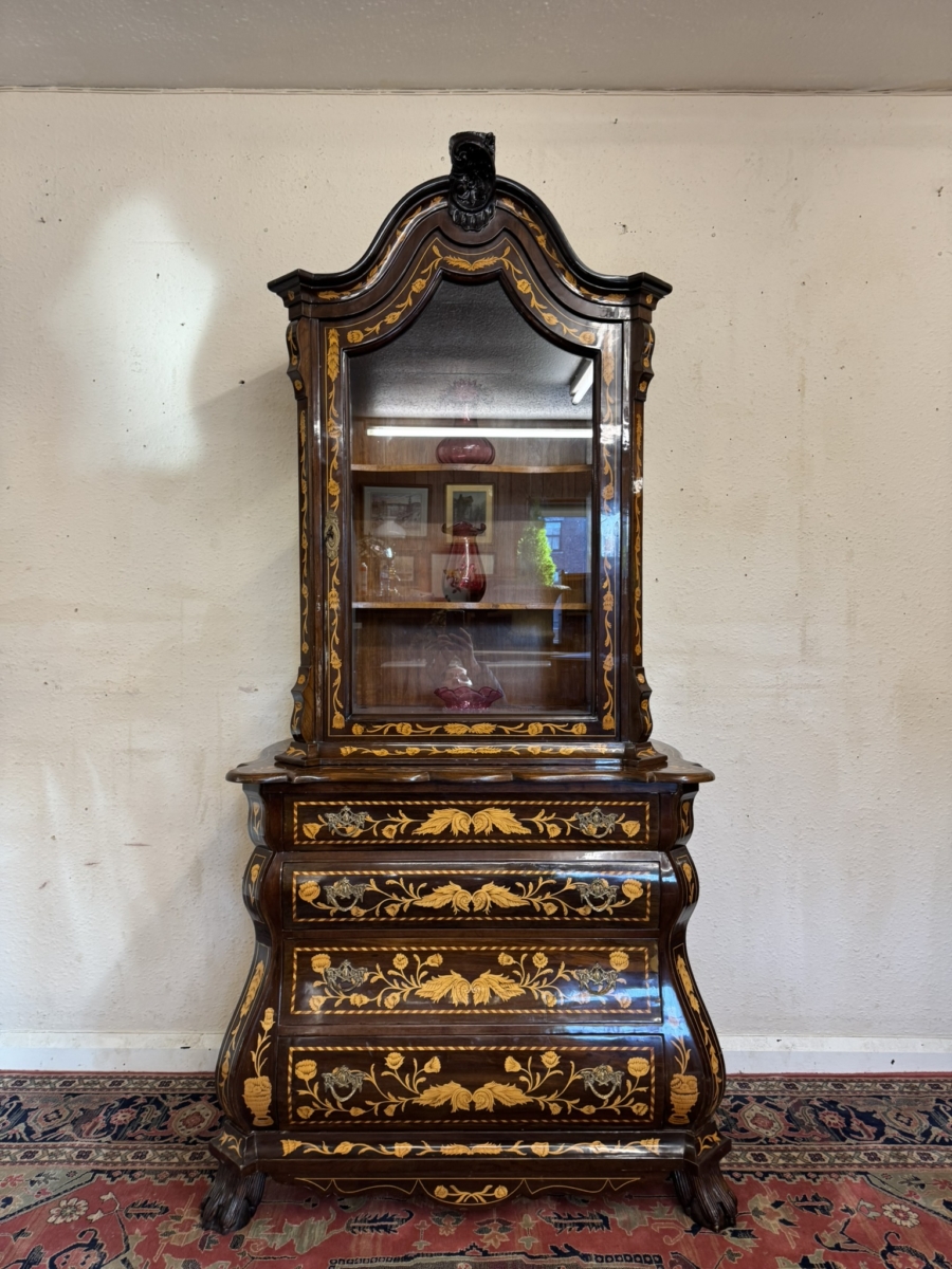 This beautiful cabinet has a curved top with a lockable glazed door and sides. The door opens to reveal two shaped wooden shelves. The top sits on a bombe chest of four drawers, each drawer having a pair of ornate brass handles. The cabinet sits on paw feet. The cabinet is adorned with marquetry inlay decoration.