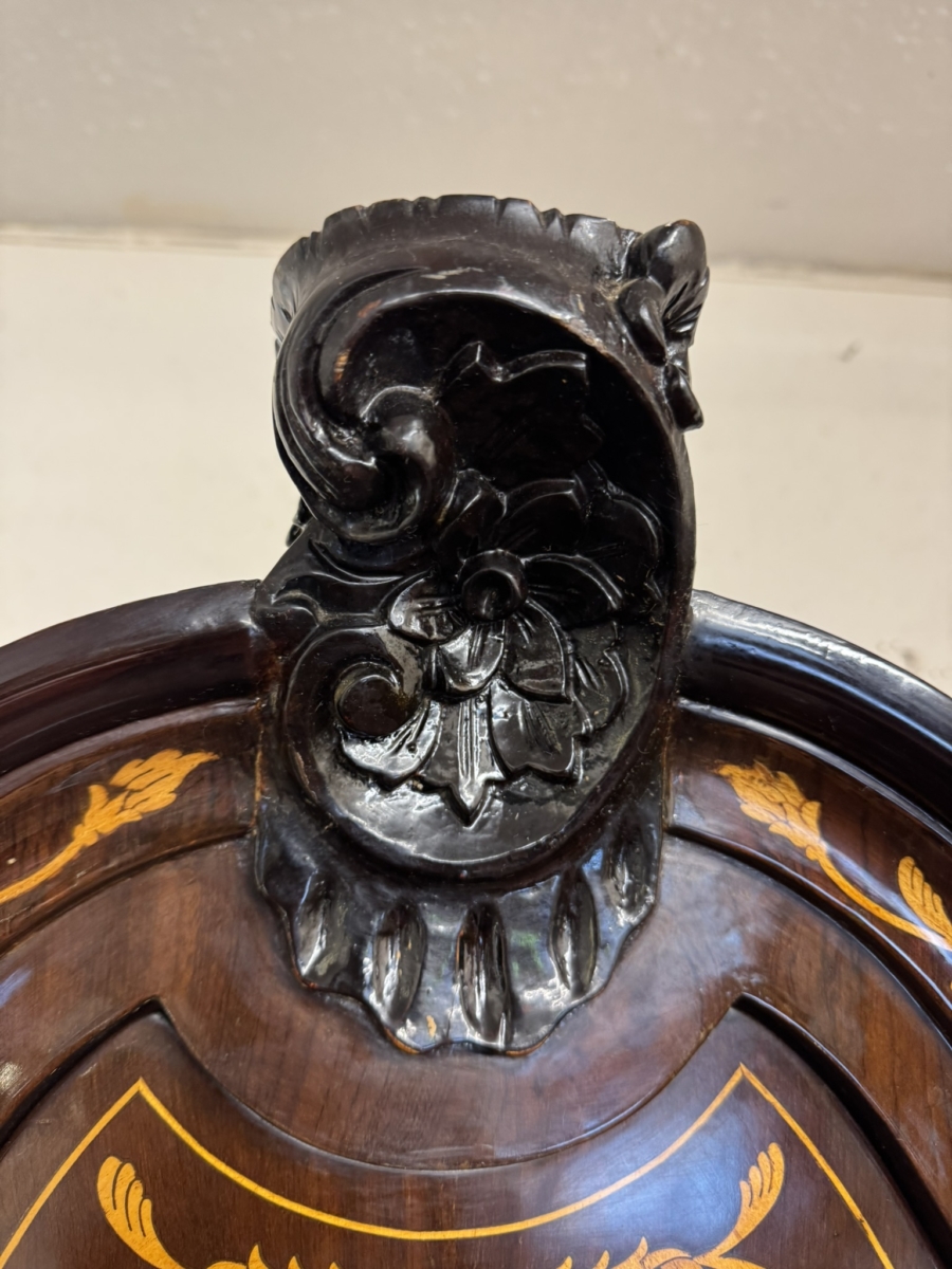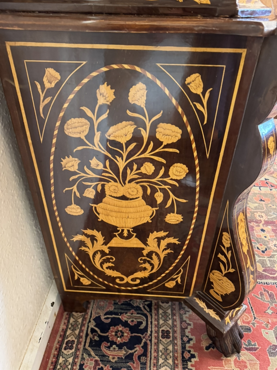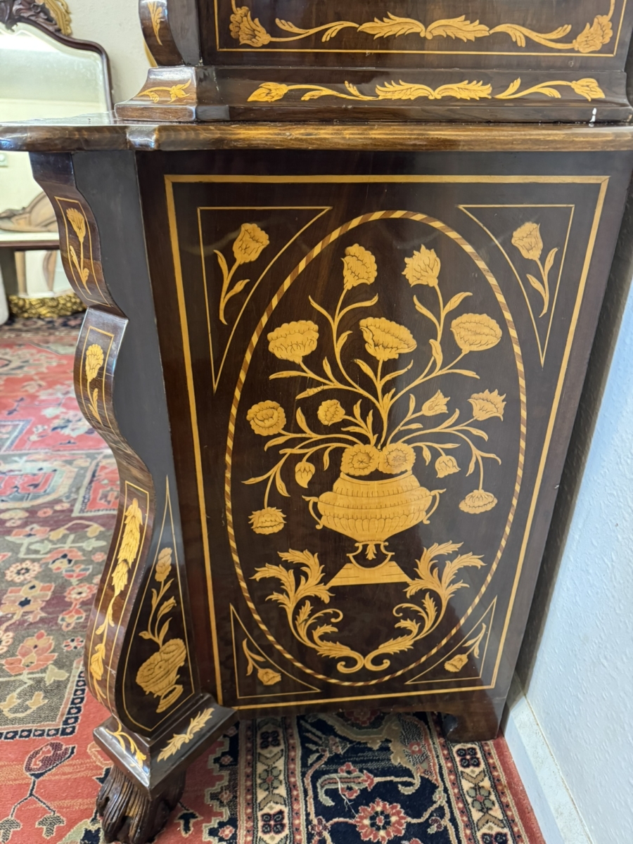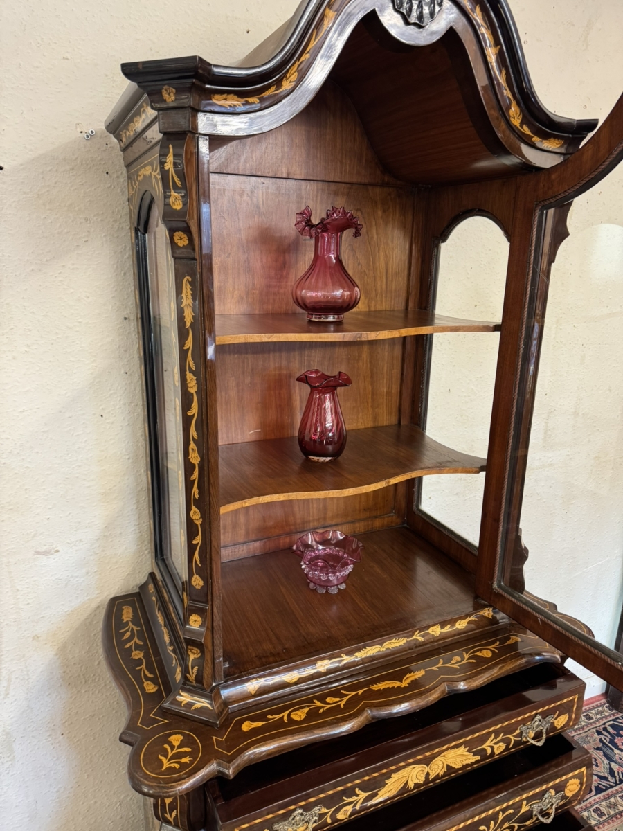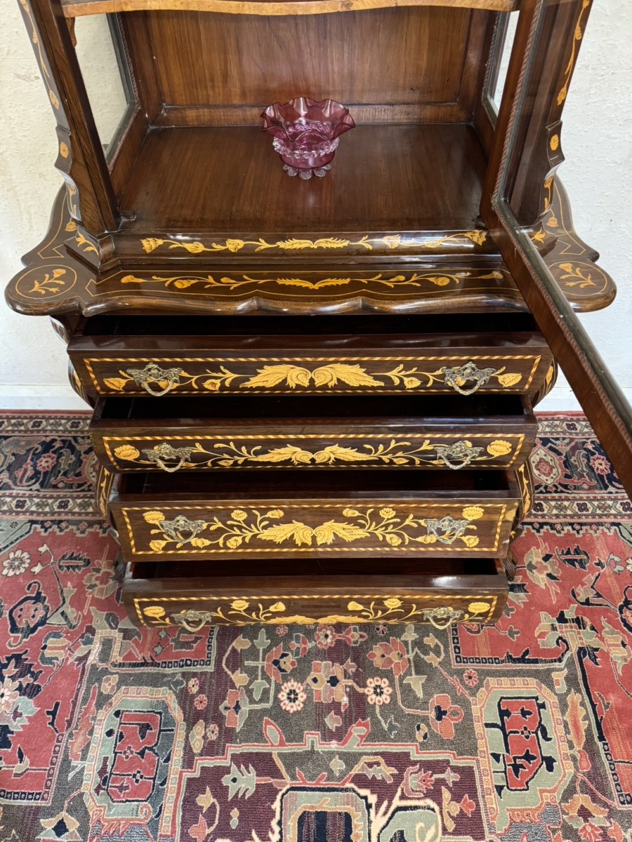 This beautiful cabinet has a curved top with a lockable glazed door and sides. The door opens to reveal two shaped wooden shelves. The top sits on a bombe chest of four drawers, each drawer having a pair of ornate brass handles. The cabinet sits on paw feet. The cabinet is adorned with marquetry inlay decoration.