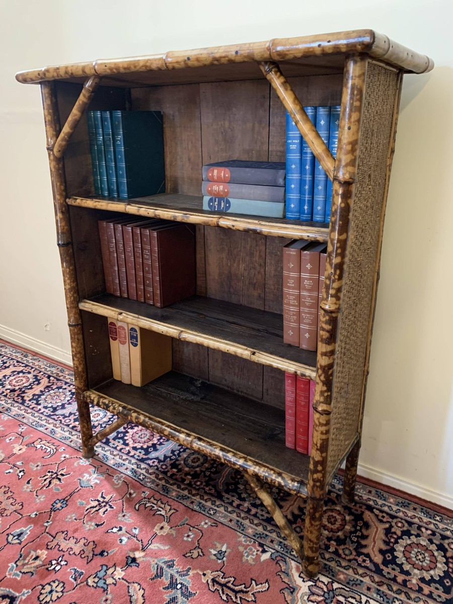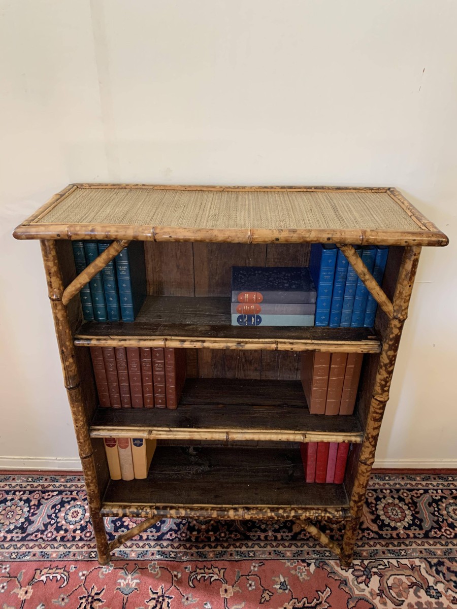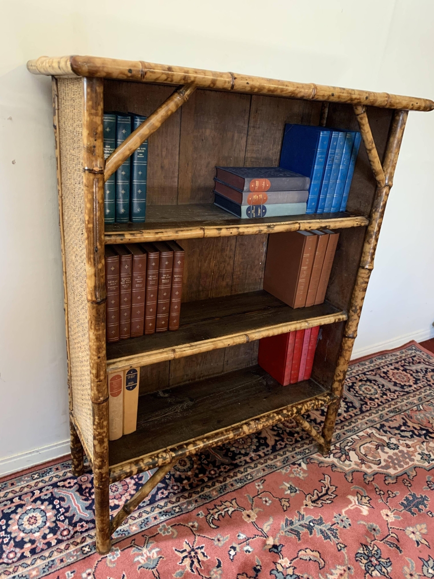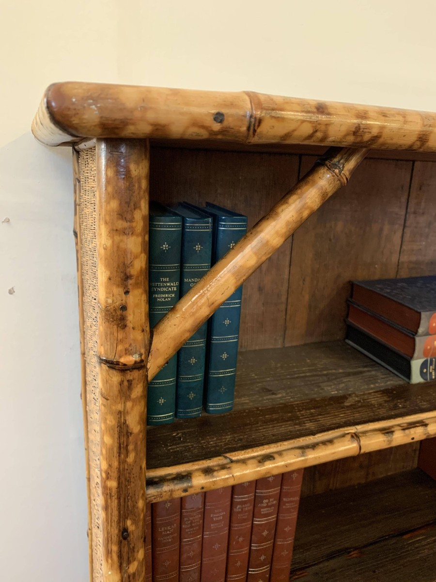 The frame of the bookcase is bamboo with the top and sides having rattan panels. The bookcase has a plank back and plank shelves.
