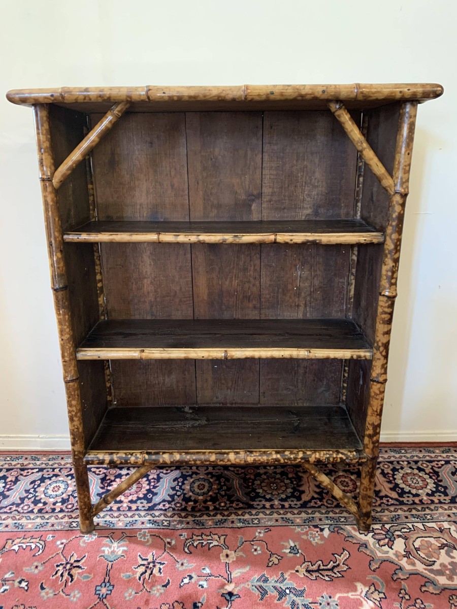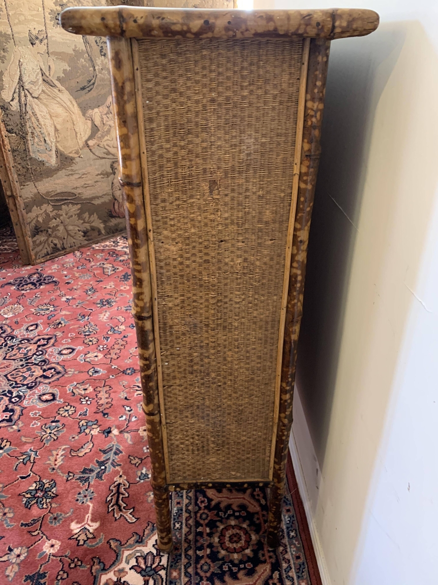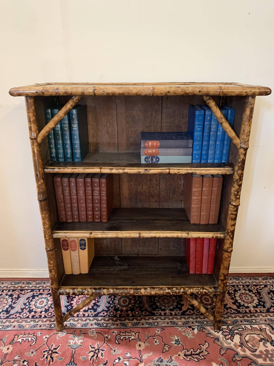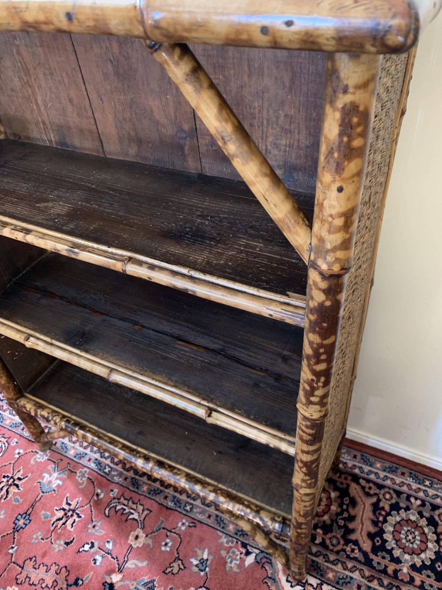The frame of the bookcase is bamboo with the top and sides having rattan panels. The bookcase has a plank back and plank shelves.