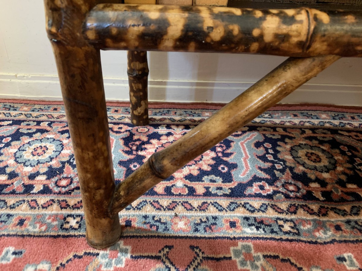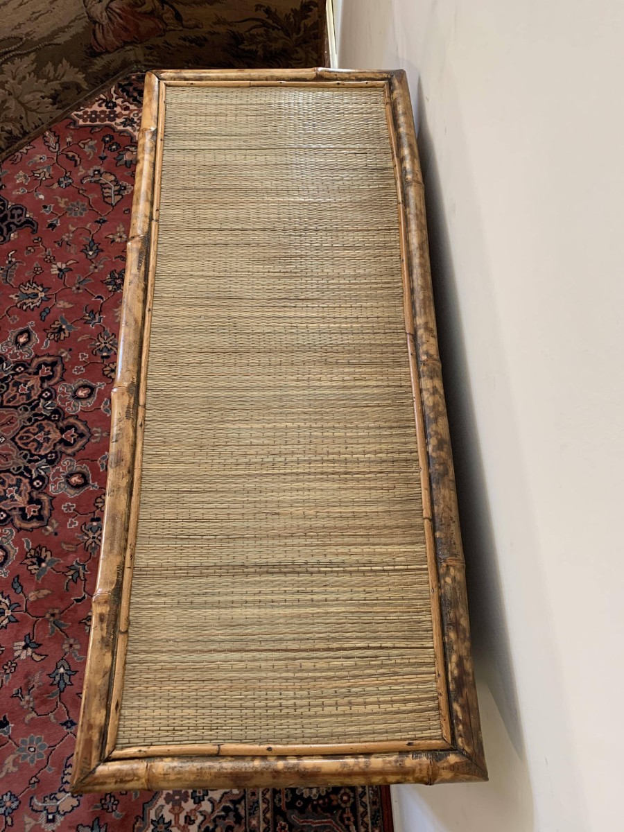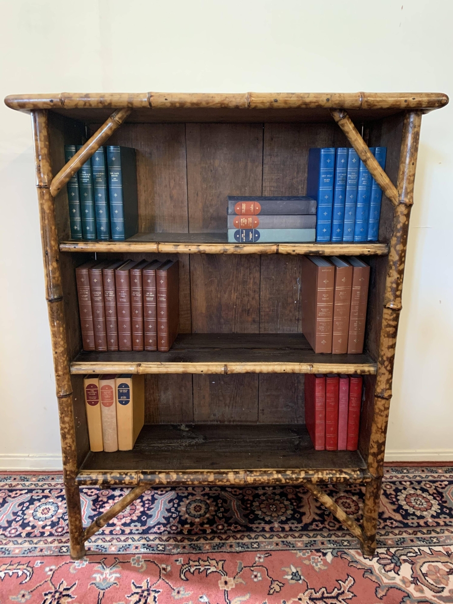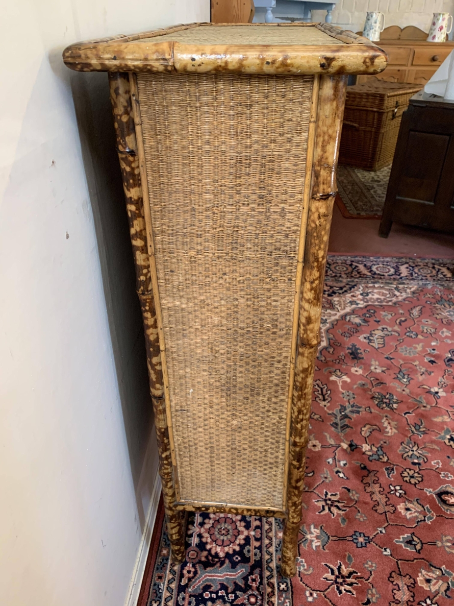 The frame of the bookcase is bamboo with the top and sides having rattan panels. The bookcase has a plank back and plank shelves.