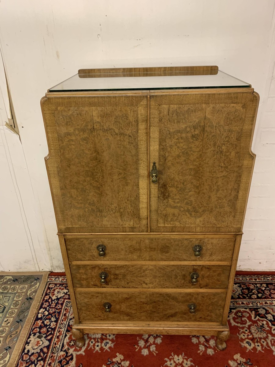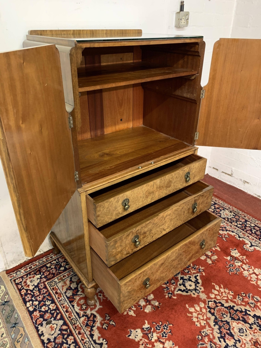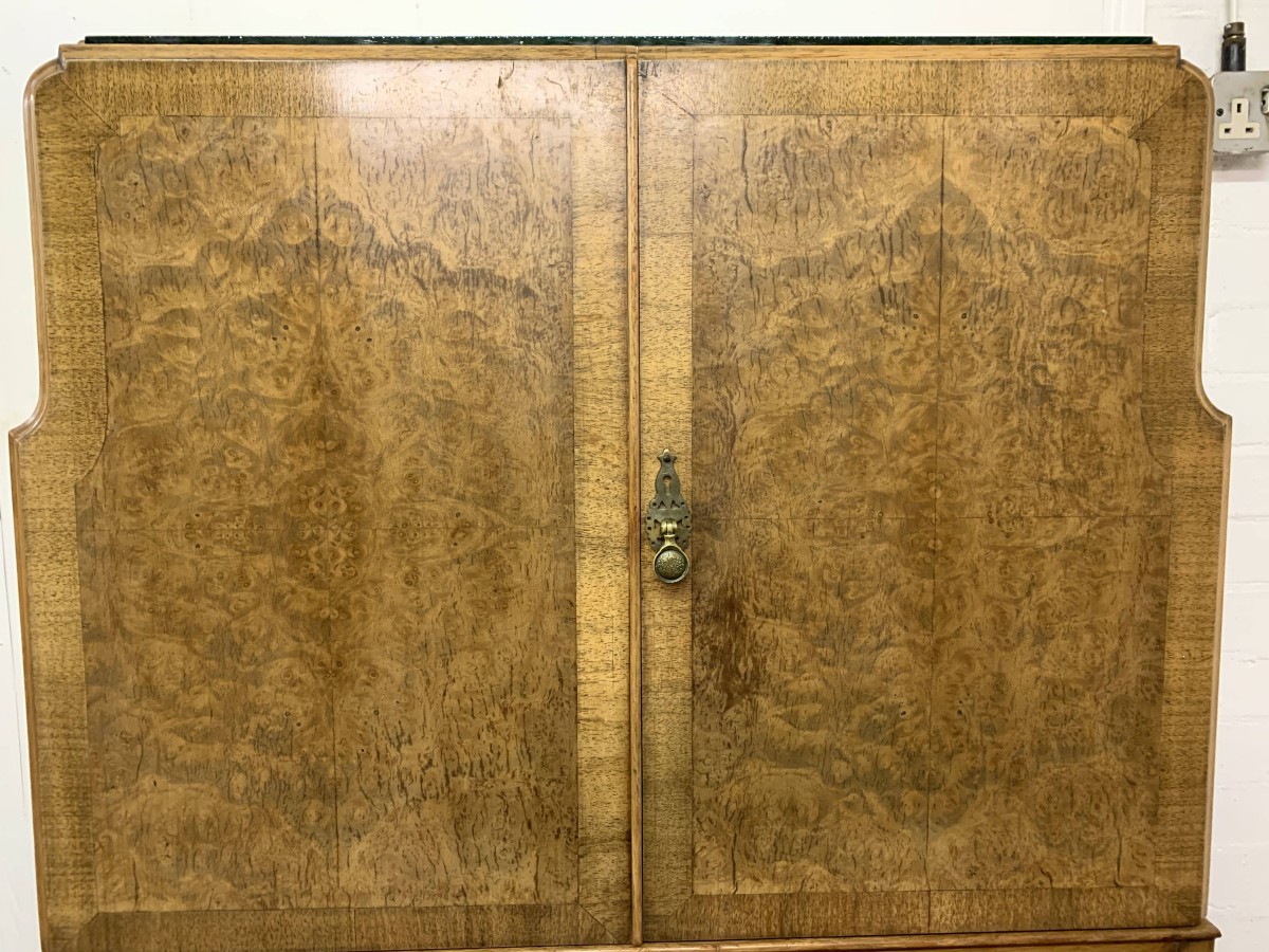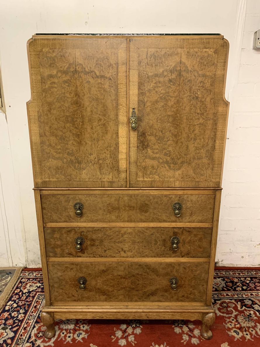 A beautiful item of furniture made in vibrant quality burr walnut. The top has a back rail and a glass protector. Below are a pair of cupboard doors which open to reveal a sliding shelf and offers ample storage. Below are three graduated drawers, each drawer having decorative brass handles. This beautiful item stands proud on four shaped cabriole legs.
