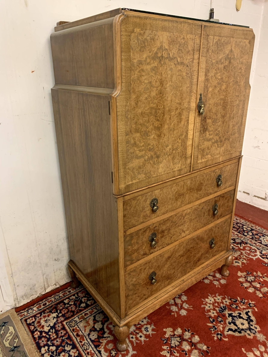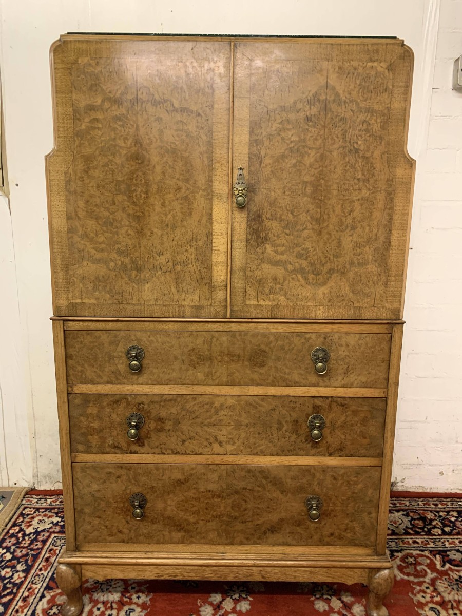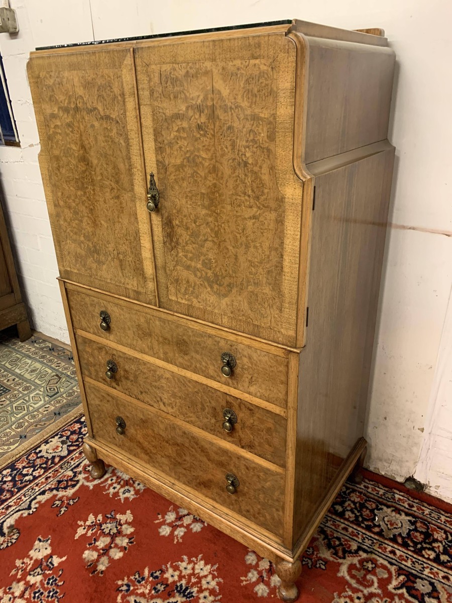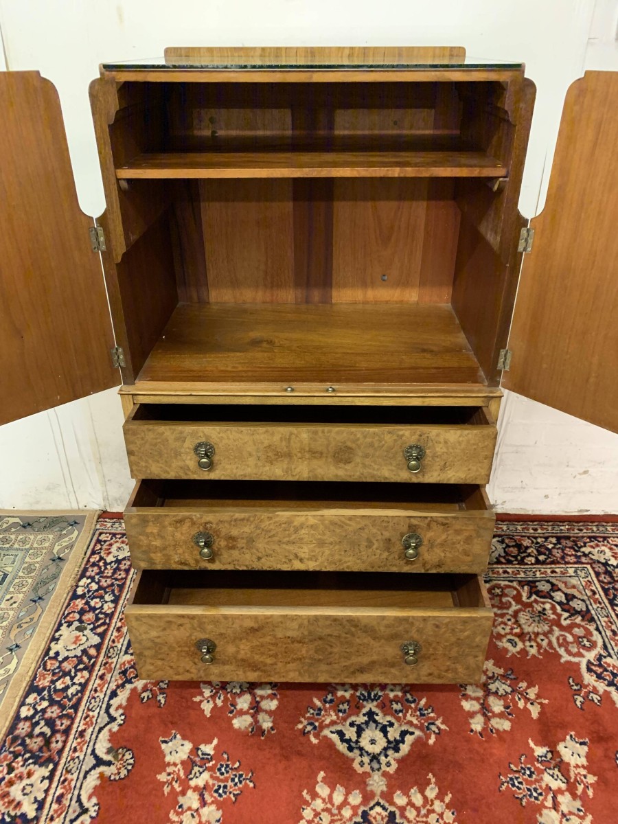 A beautiful item of furniture made in vibrant quality burr walnut. The top has a back rail and a glass protector. Below are a pair of cupboard doors which open to reveal a sliding shelf and offers ample storage. Below are three graduated drawers, each drawer having decorative brass handles. This beautiful item stands proud on four shaped cabriole legs.