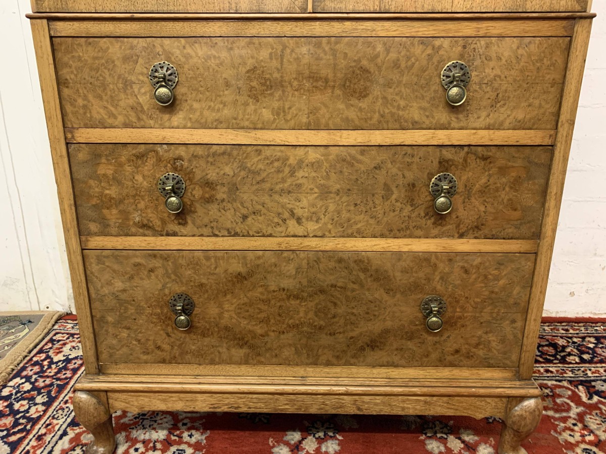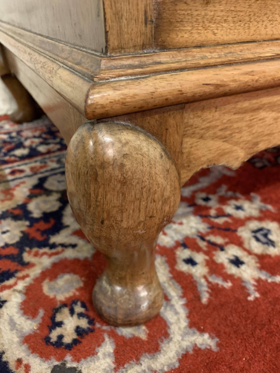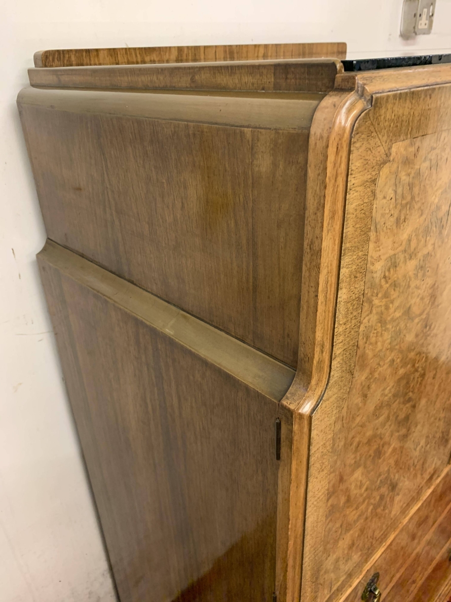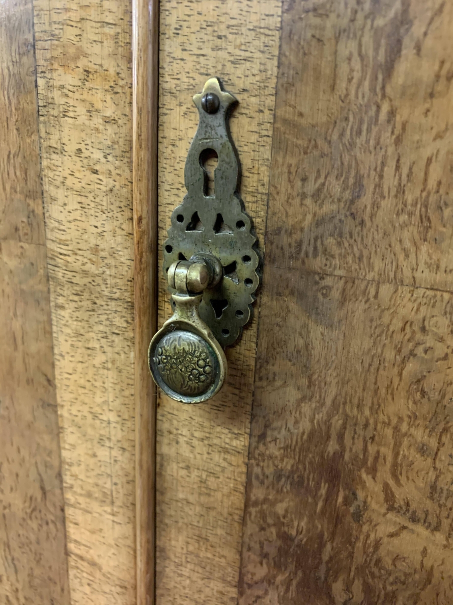 A beautiful item of furniture made in vibrant quality burr walnut. The top has a back rail and a glass protector. Below are a pair of cupboard doors which open to reveal a sliding shelf and offers ample storage. Below are three graduated drawers, each drawer having decorative brass handles. This beautiful item stands proud on four shaped cabriole legs.