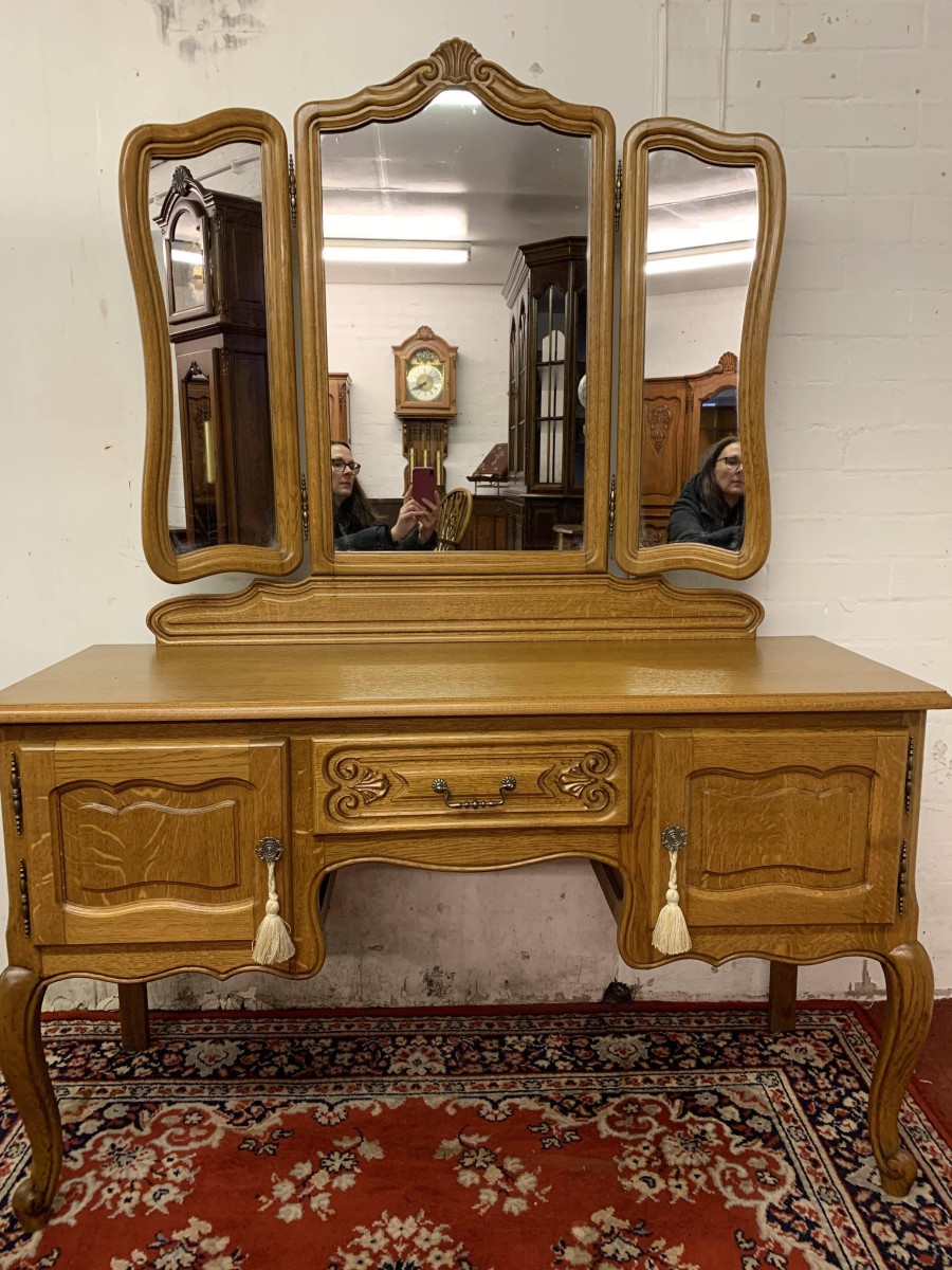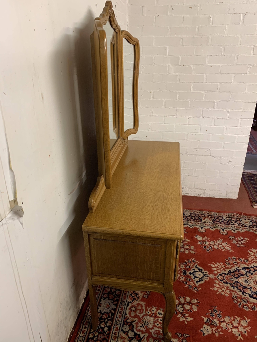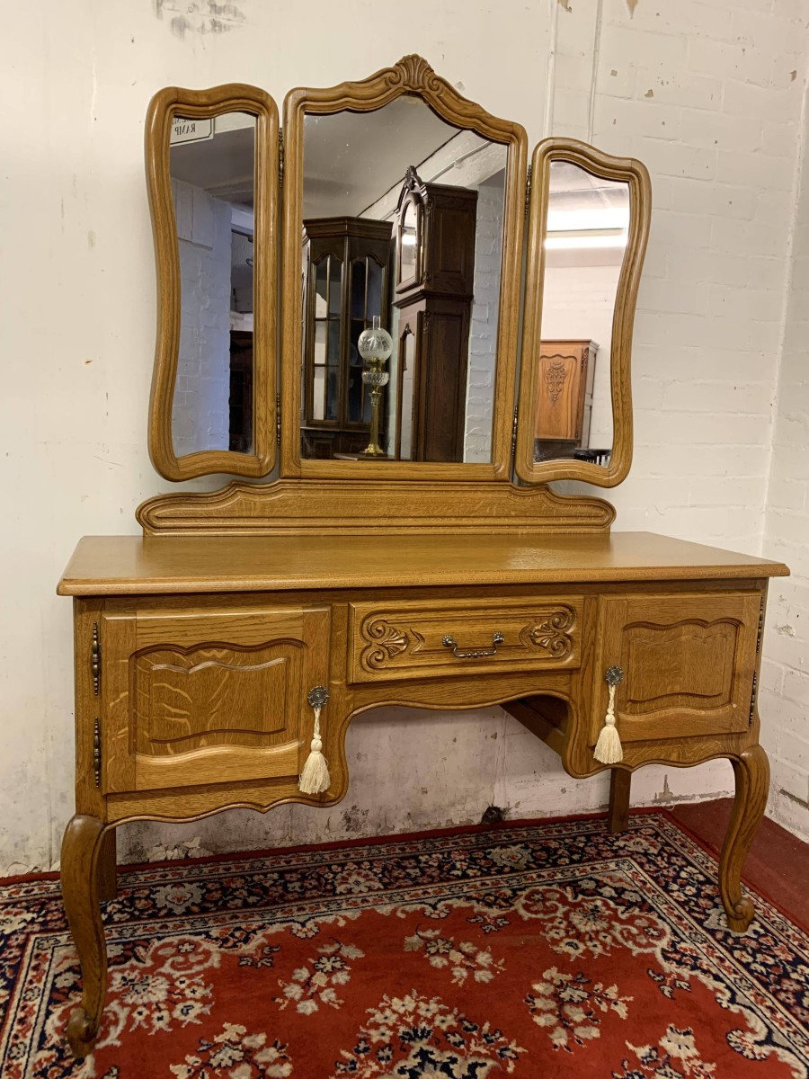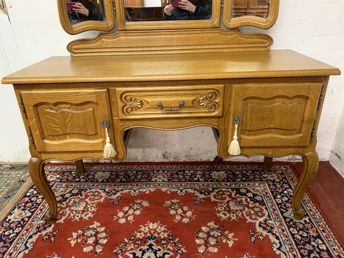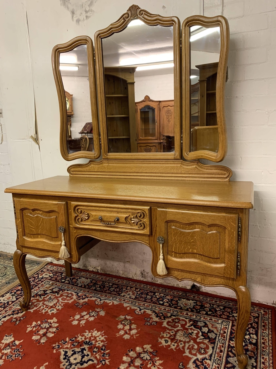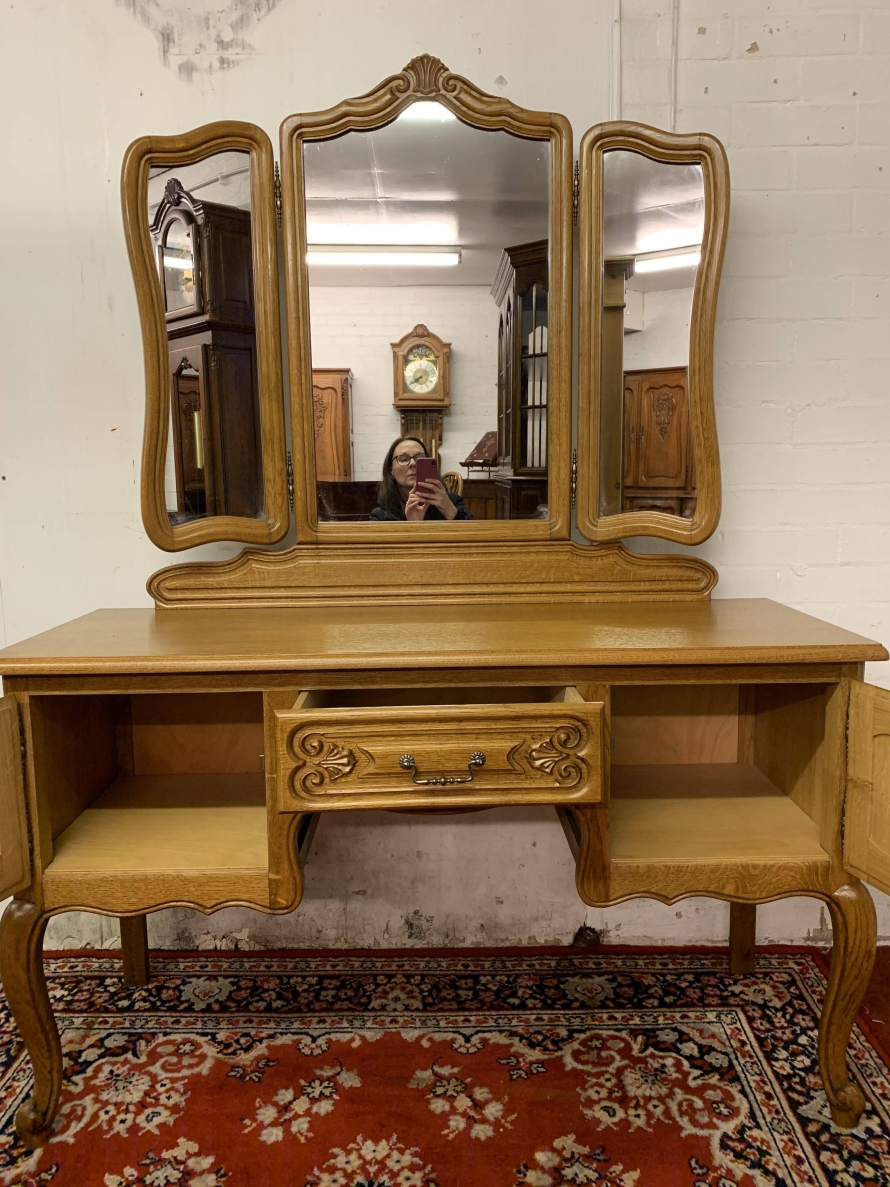 The removable back has a central fixed mirror with carved decoration to the top and flanked by a pair of adjustable shaped side mirrors. The base has an over sailing top with a carved central knee hole drawer, the drawer having brass drop handle handle. To the sides are a pair of recessed panelled cupboard doors, each door having brass hinges and ornate brass knob handle. Shaped skirt, this beautiful item sits on carved shaped cabriole legs to the front.
