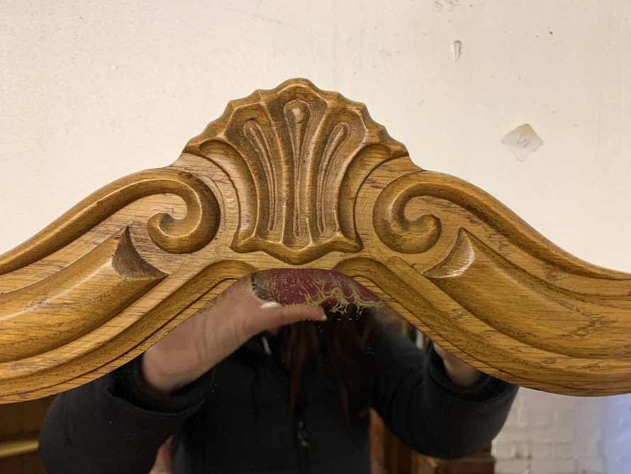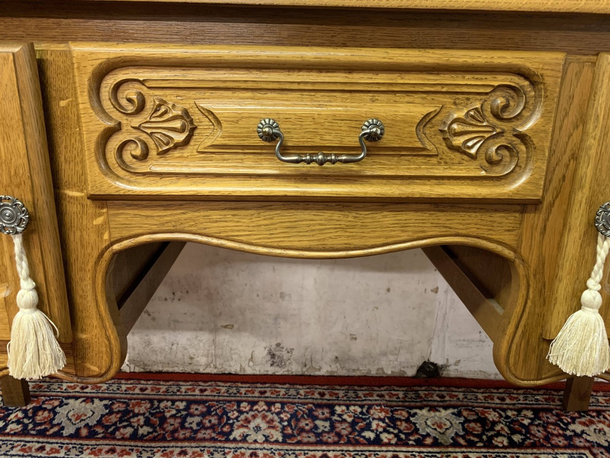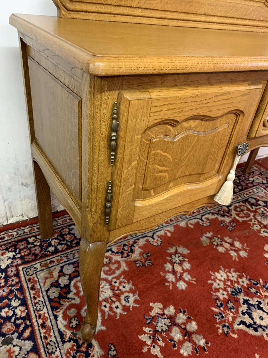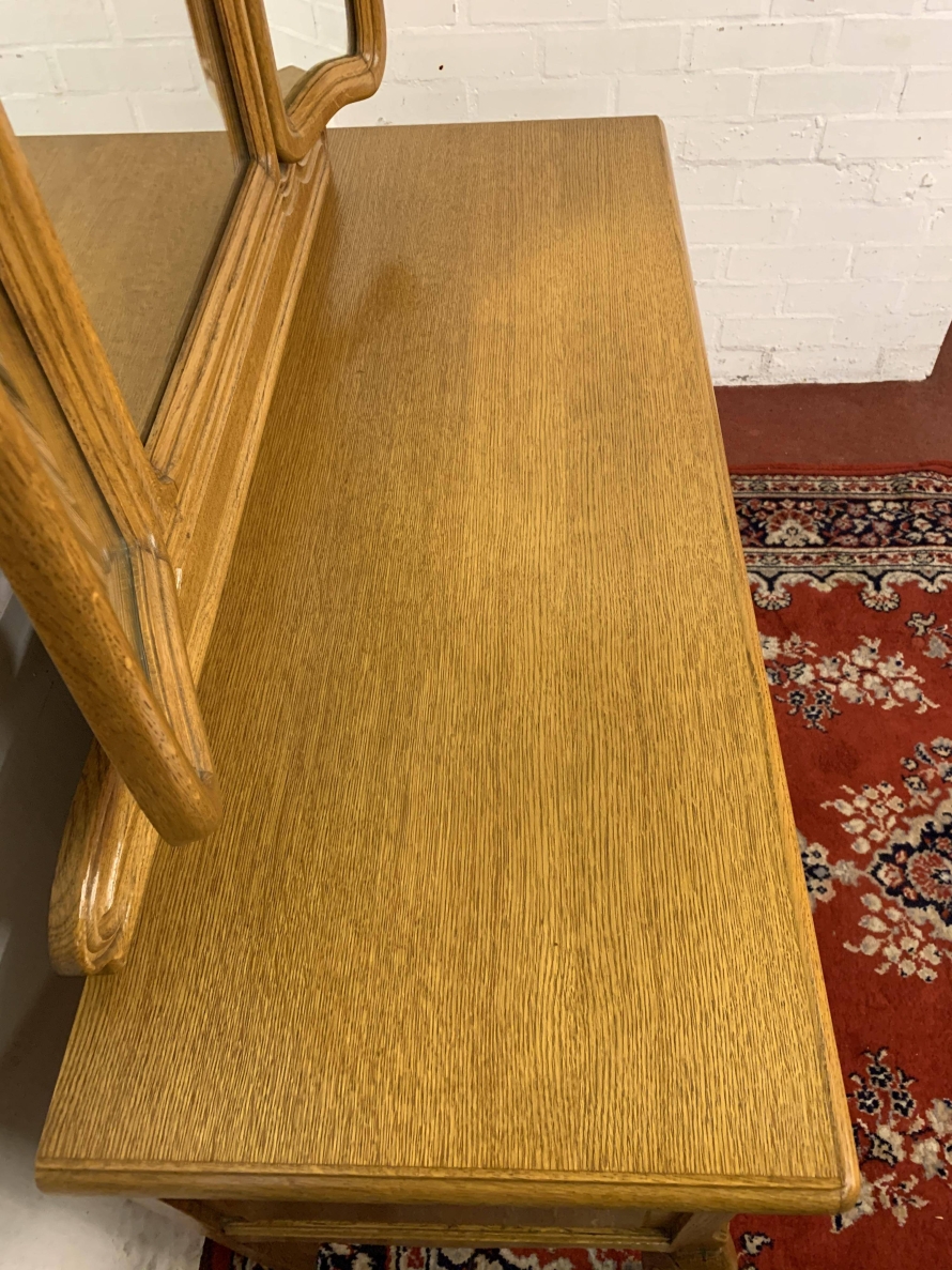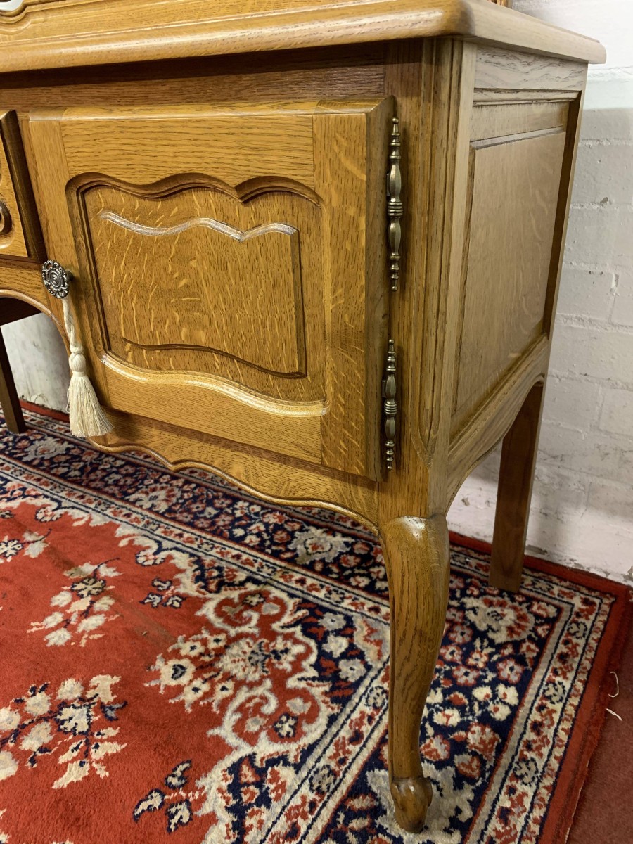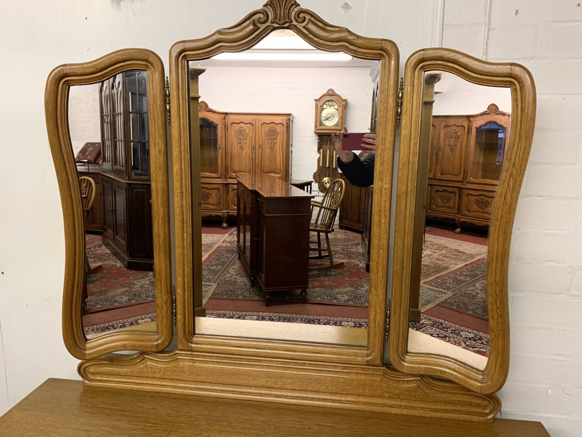 The removable back has a central fixed mirror with carved decoration to the top and flanked by a pair of adjustable shaped side mirrors. The base has an over sailing top with a carved central knee hole drawer, the drawer having brass drop handle handle. To the sides are a pair of recessed panelled cupboard doors, each door having brass hinges and ornate brass knob handle. Shaped skirt, this beautiful item sits on carved shaped cabriole legs to the front.