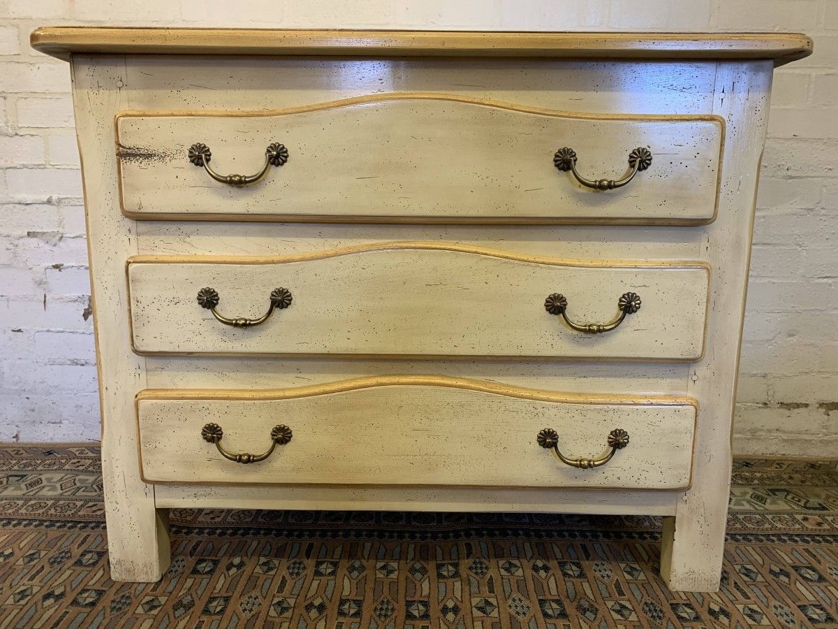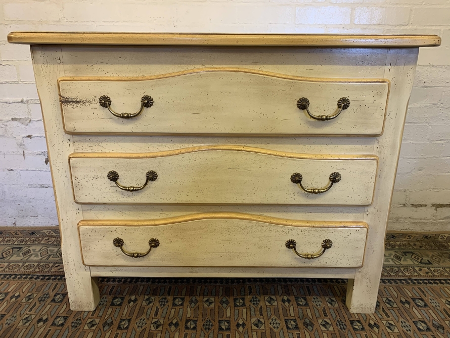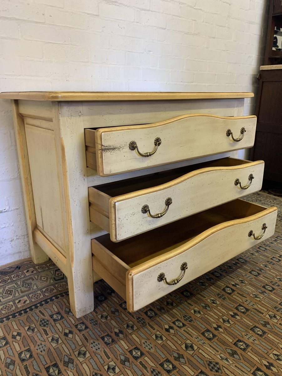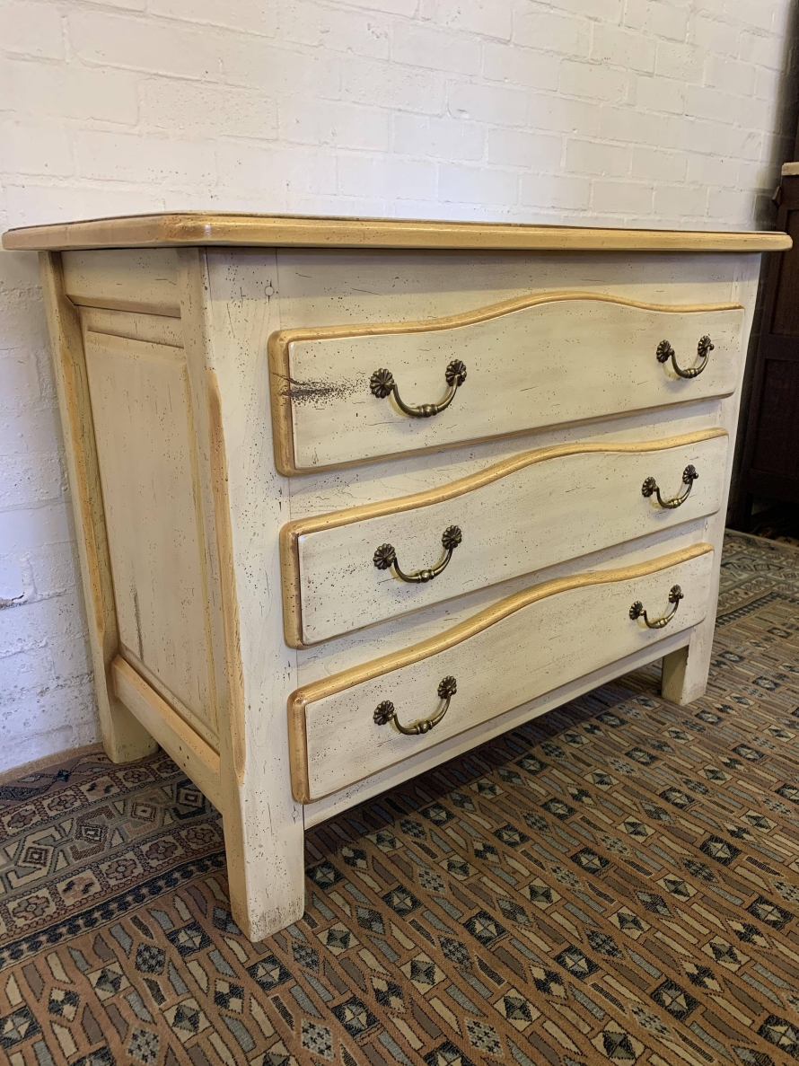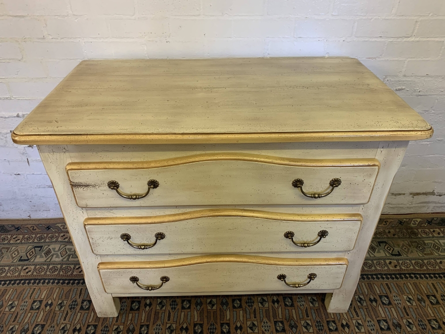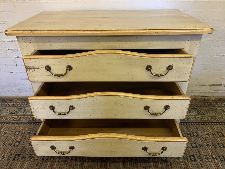 The over sailing top sits above three shaped drawers, each drawer having a pair of brass handles. Recessed panelled sides, this super chest stands on four traditional block feet.