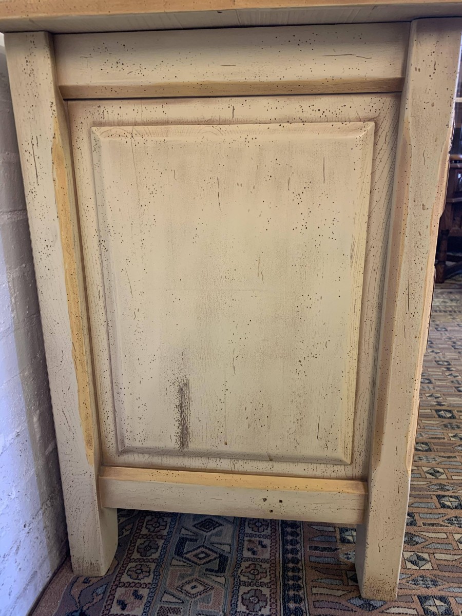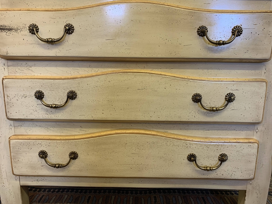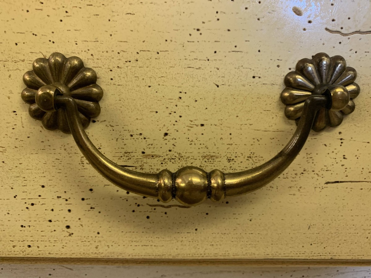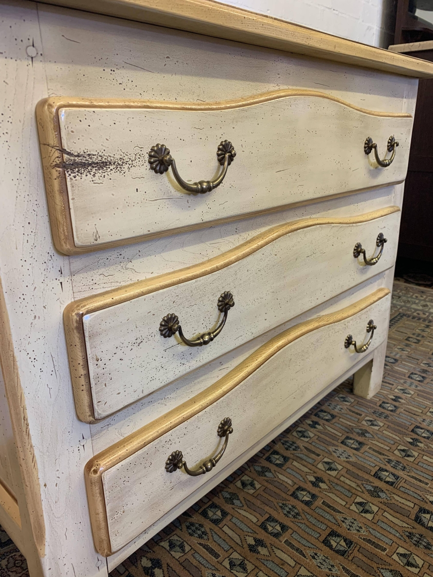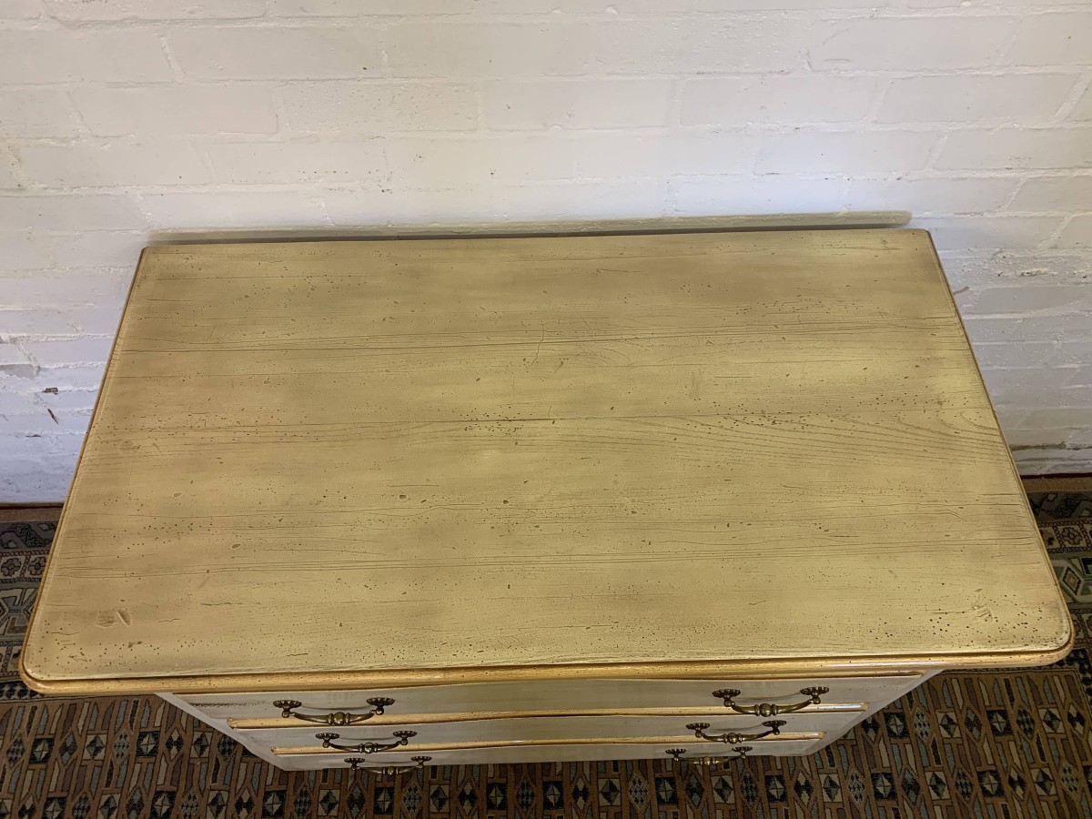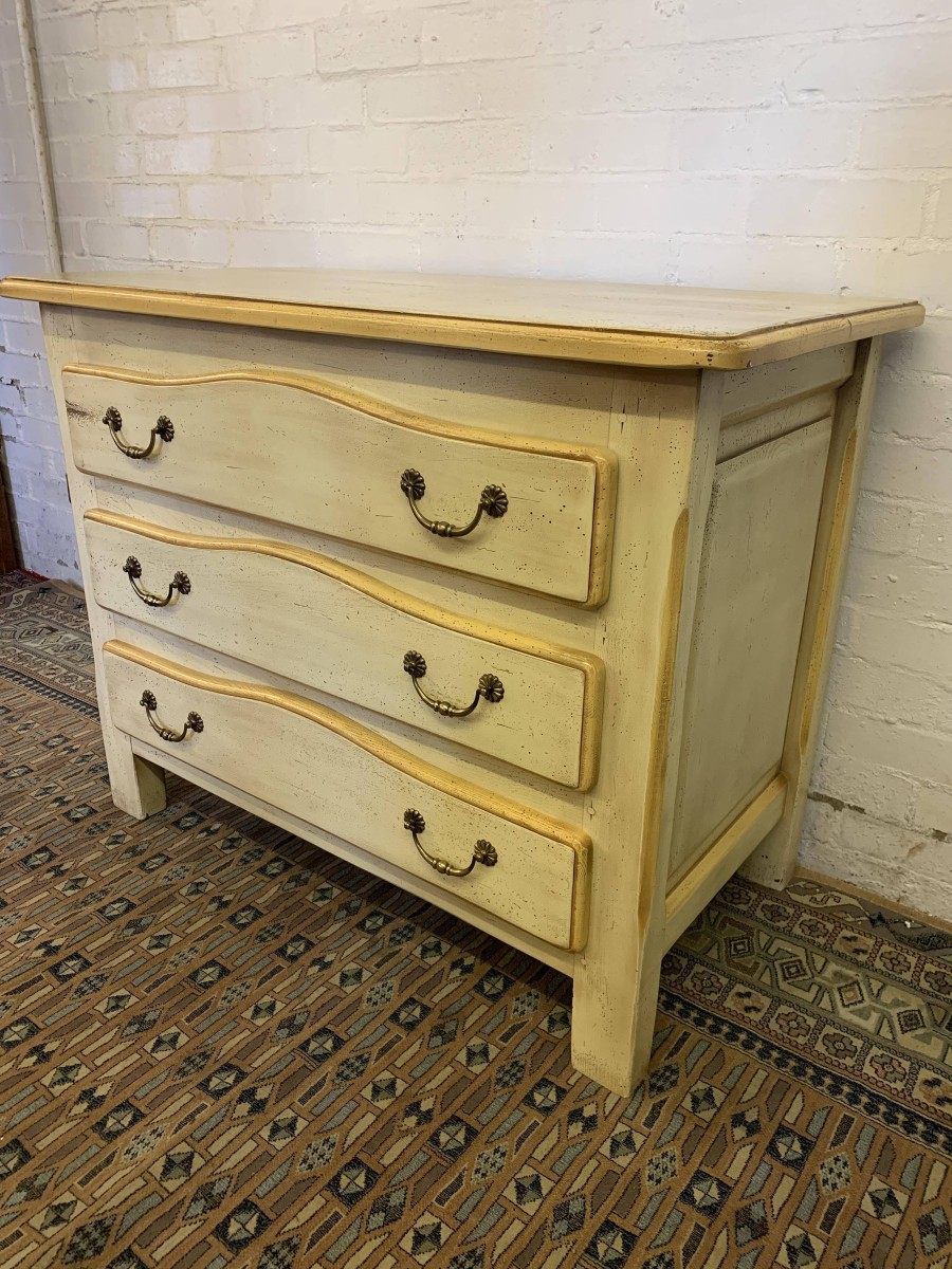 The over sailing top sits above three shaped drawers, each drawer having a pair of brass handles. Recessed panelled sides, this super chest stands on four traditional block feet.