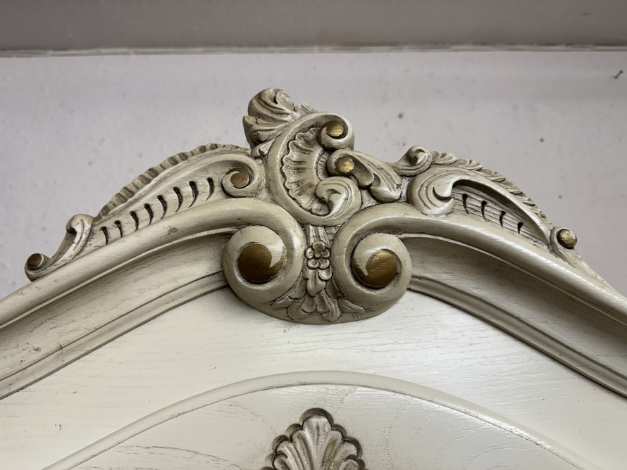 This fabulous display cabinet dates circa 1950. This antique white French display cabinet has gilt embellishment throughout. The oversailing top rises to a fabulous central carving, below is a full length glazed door, the door having decorative wood barring, fan carving to the top with brass hinges and ornate brass escutcheon and key. The door opens to reveal three glass shelves. Glazed sides, shaped skirt with central decorative carving this fabulous cabinet stands on two carved cabriole shaped legs to the front.