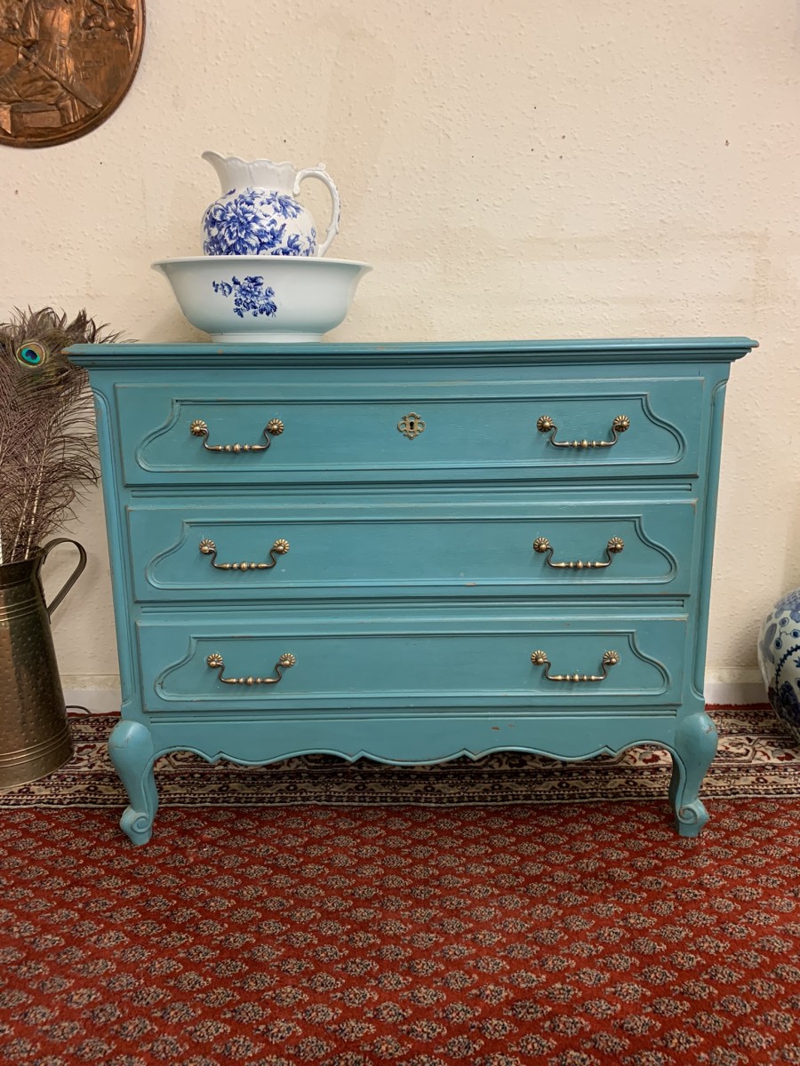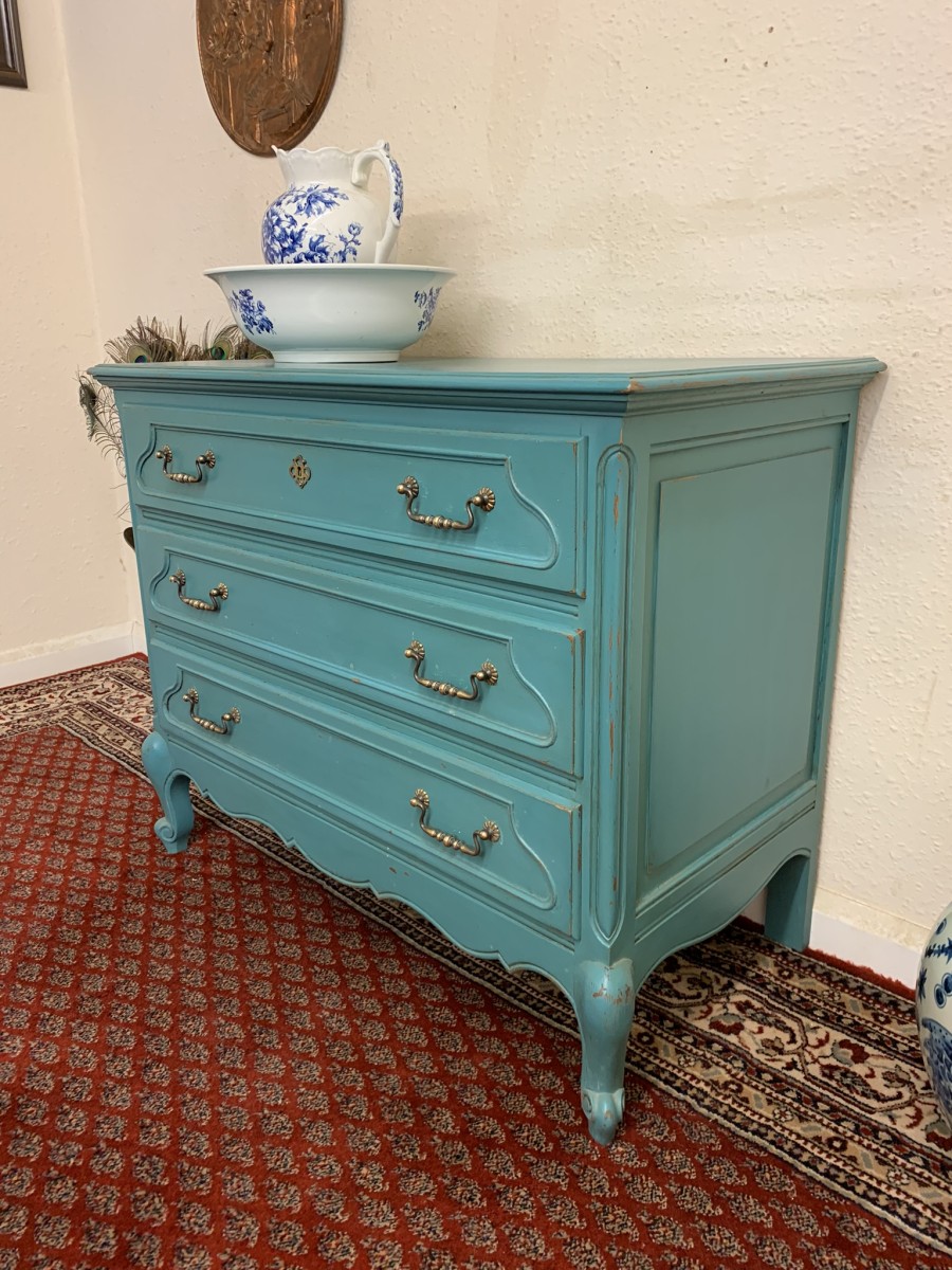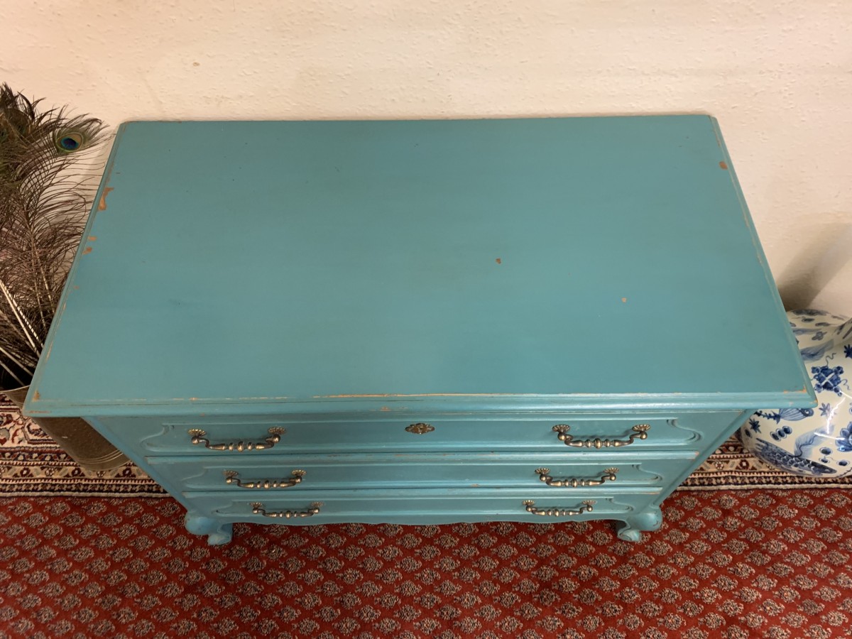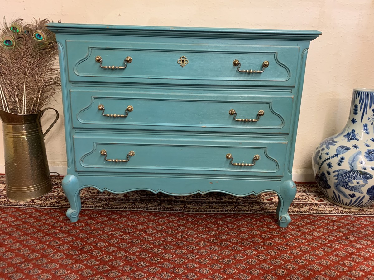 This elegant chest would grace any home. The chest has three deep drawers, each drawer having a pair of brass handles. Recessed panelled sides, shaped skirt this fabulous chest hand painted in a stunning turquoise colour stands on two carved cabriole shaped legs to the front.