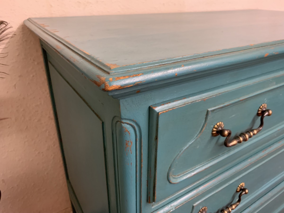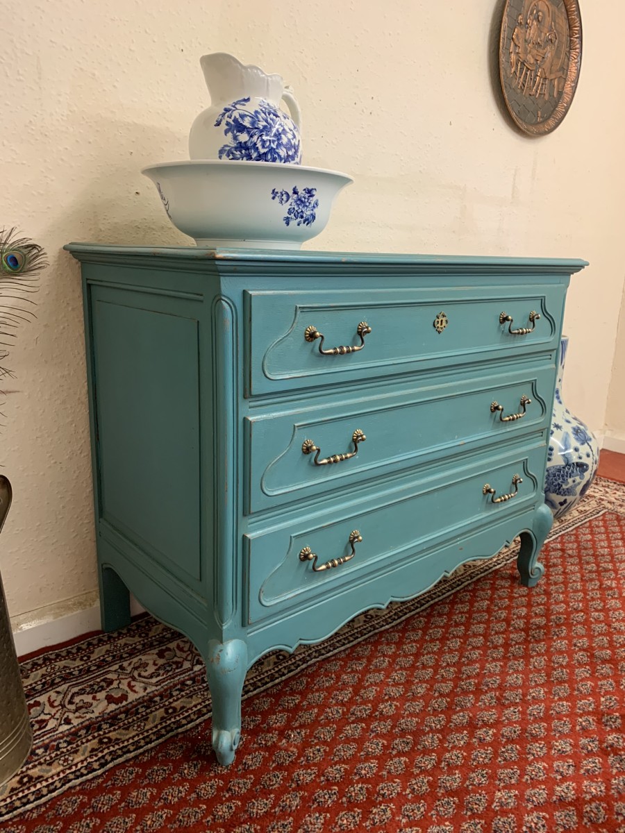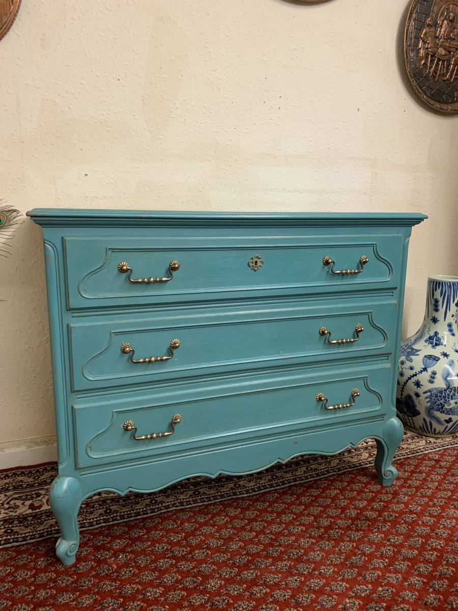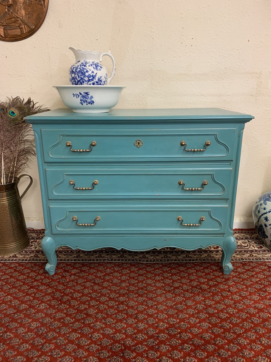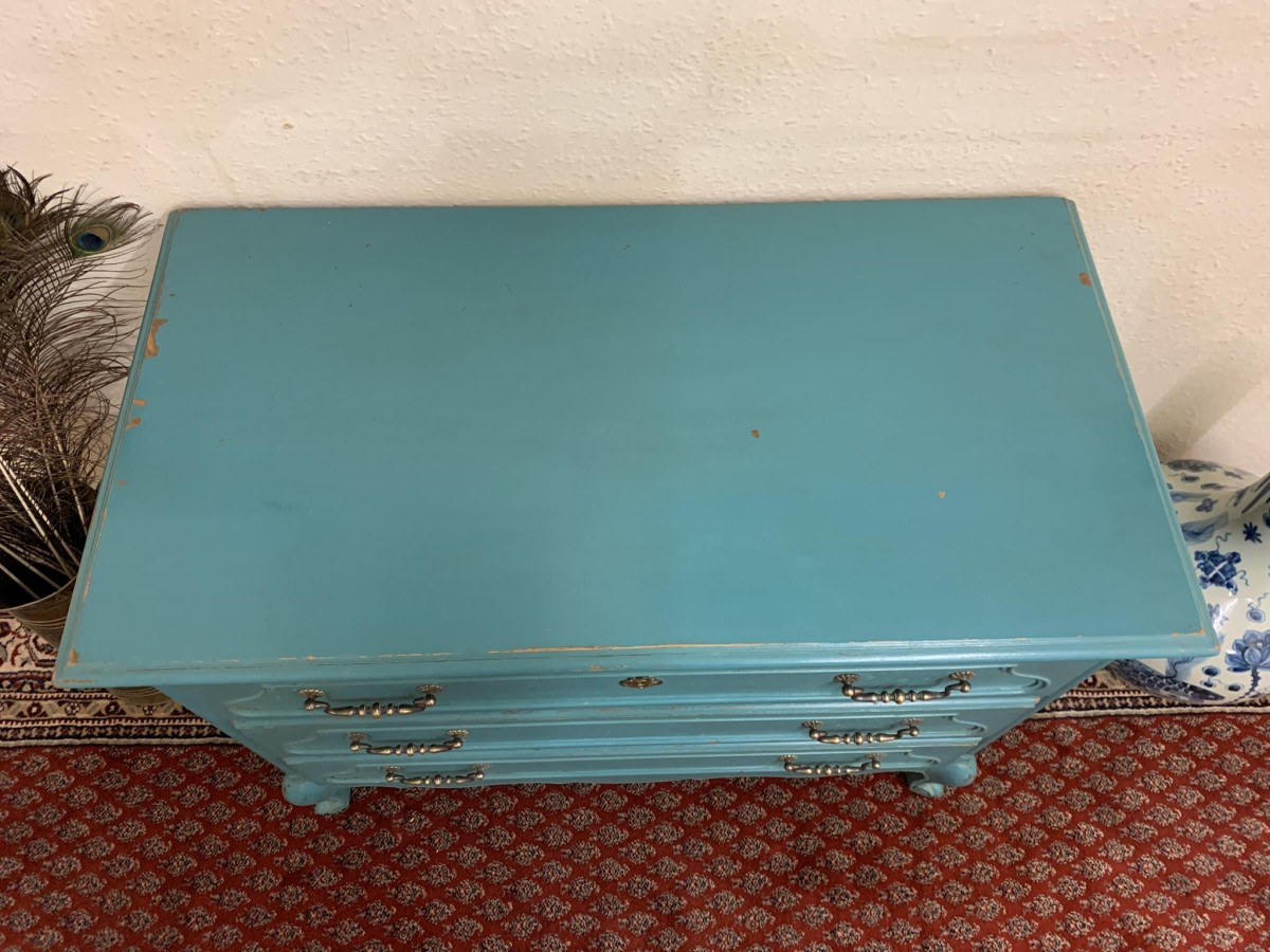 This elegant chest would grace any home. The chest has three deep drawers, each drawer having a pair of brass handles. Recessed panelled sides, shaped skirt this fabulous chest hand painted in a stunning turquoise colour stands on two carved cabriole shaped legs to the front.