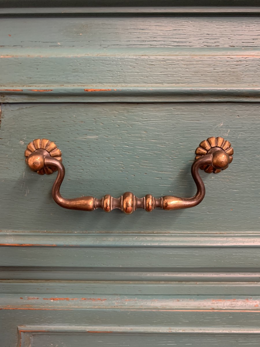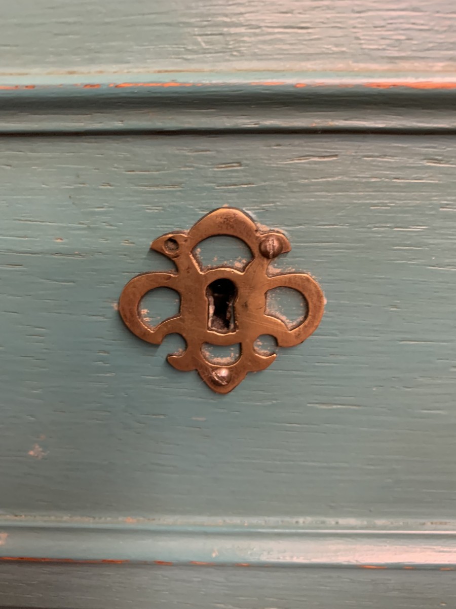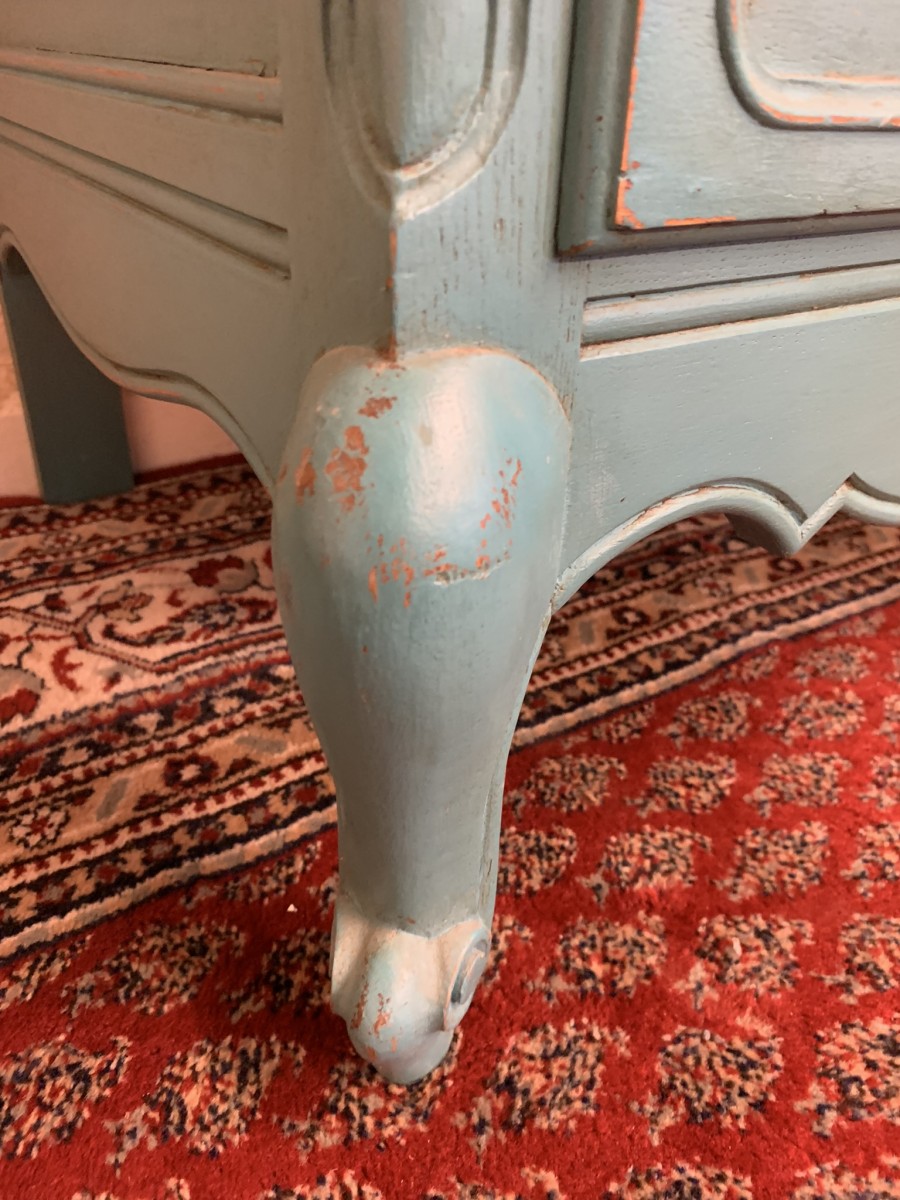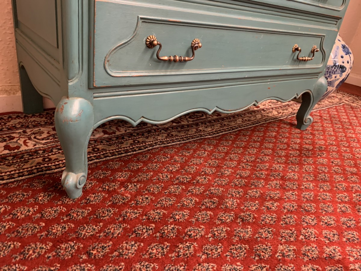 This elegant chest would grace any home. The chest has three deep drawers, each drawer having a pair of brass handles. Recessed panelled sides, shaped skirt this fabulous chest hand painted in a stunning turquoise colour stands on two carved cabriole shaped legs to the front.