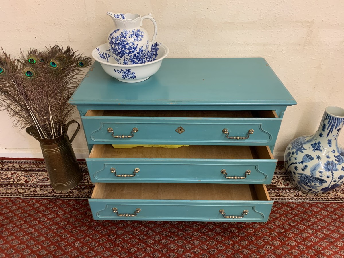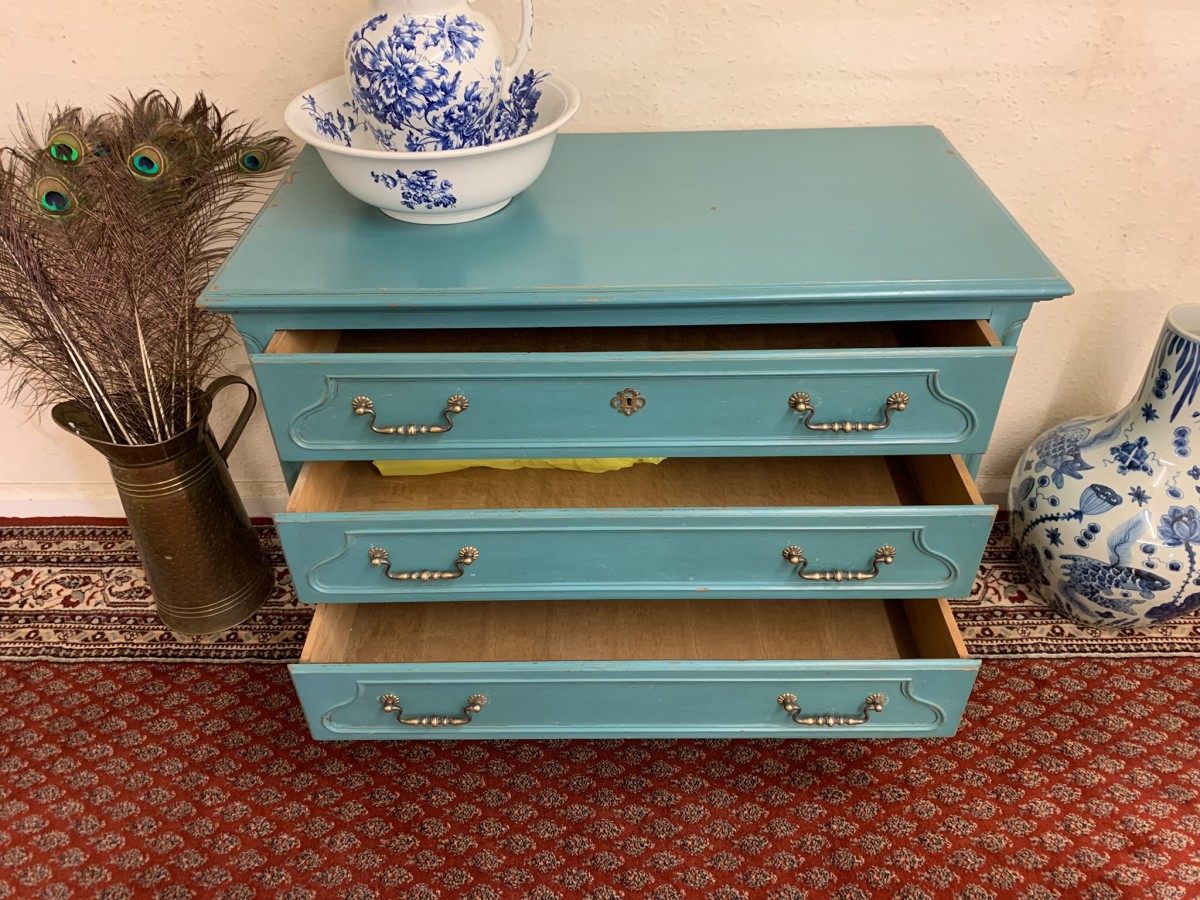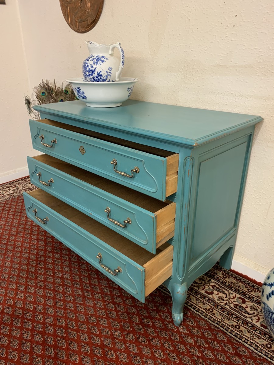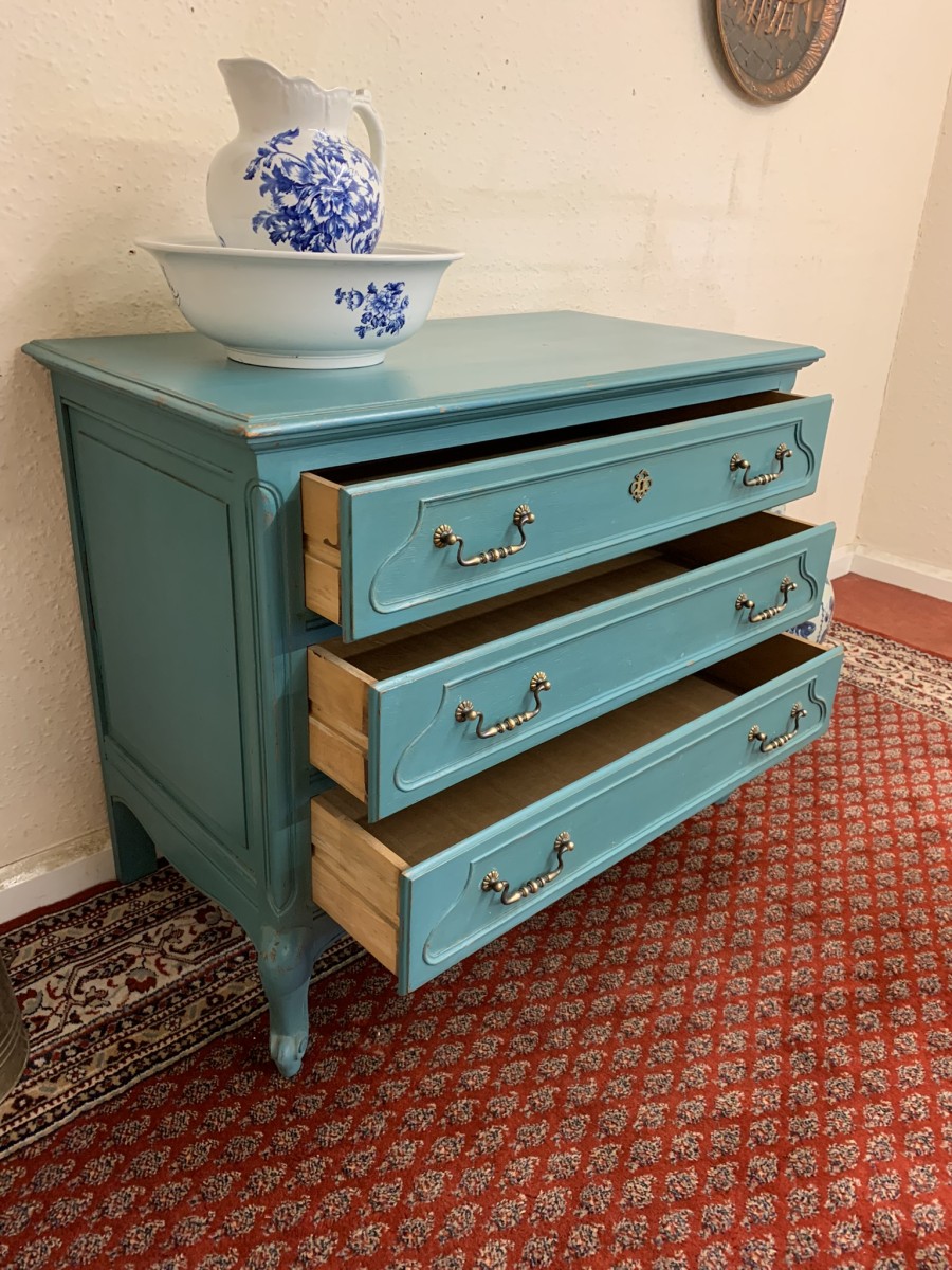 - Stylish French Oak Painted Turquoise Chest Of Three Drawers Circa 1950