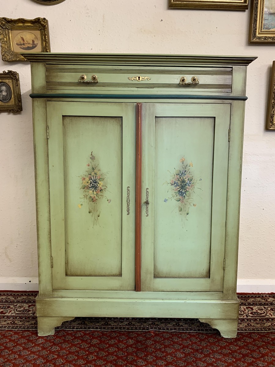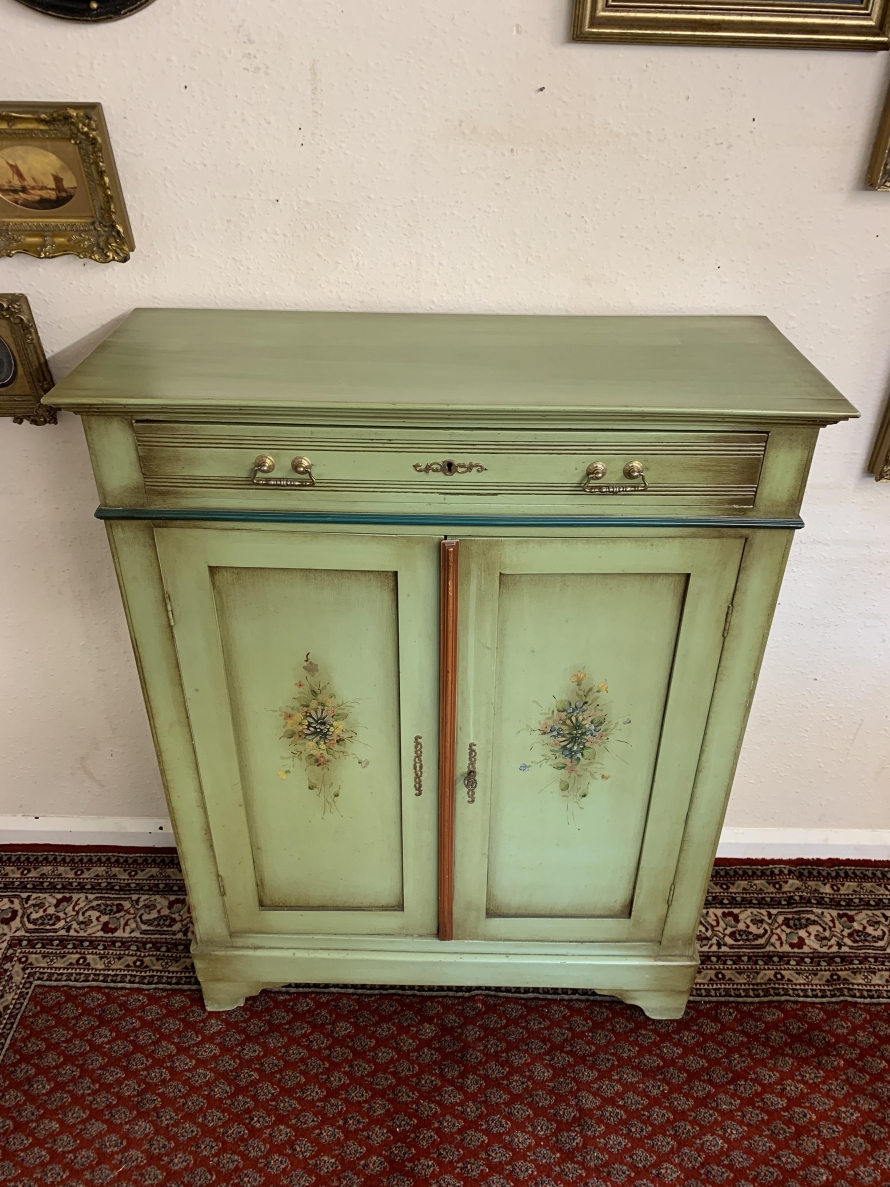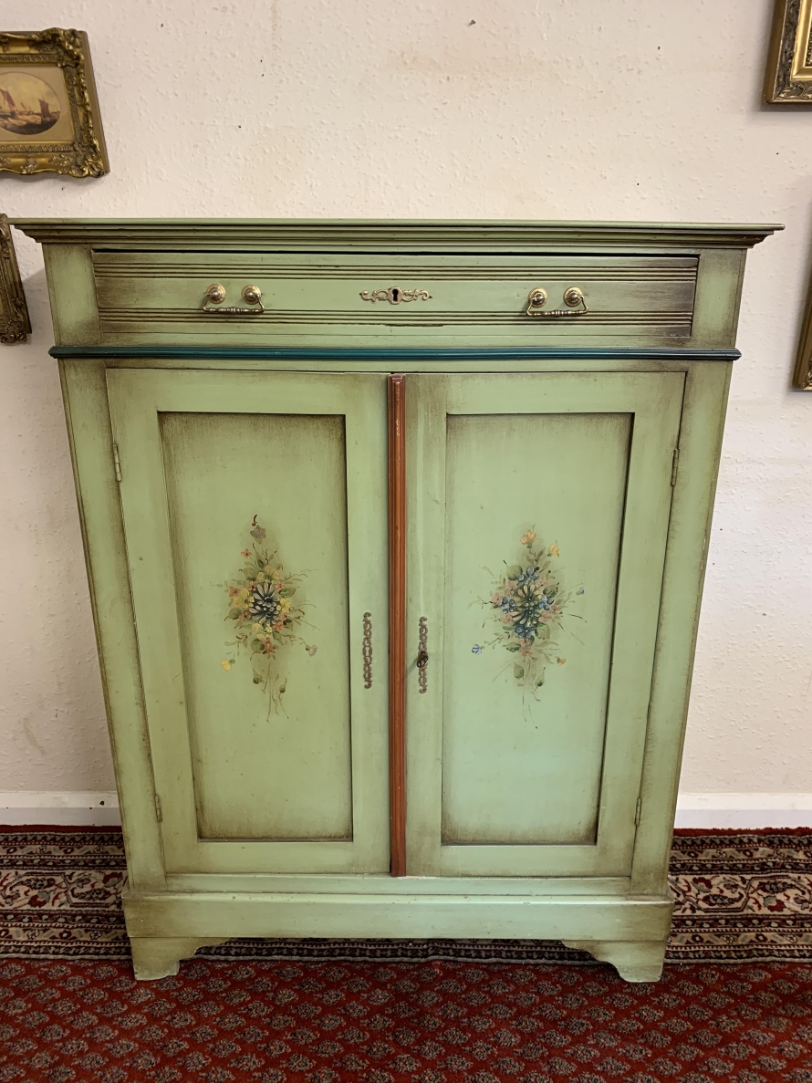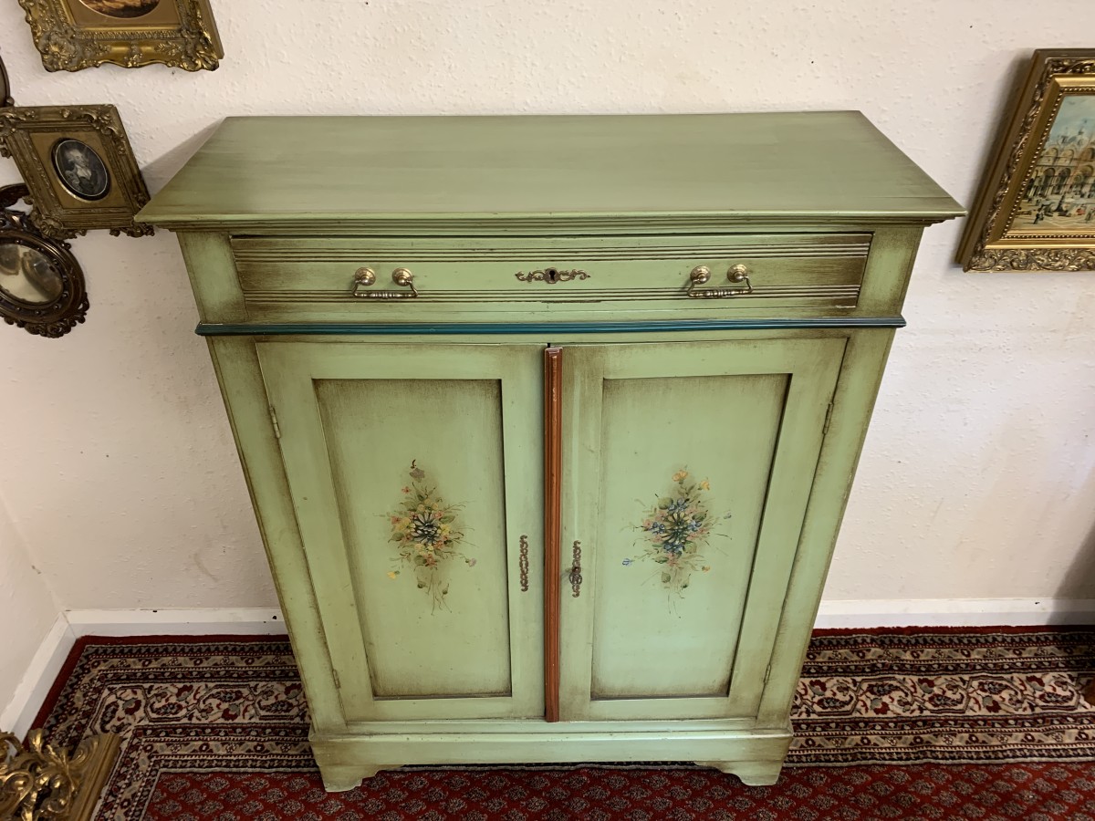 The oversailing top sits above a drawer, the drawer having a pair of brass handles. Below are a pair of lockable doors, each door having a flower painted recessed panelled. The doors open to reveal two shelves. The cupboard stands on bracket feet.