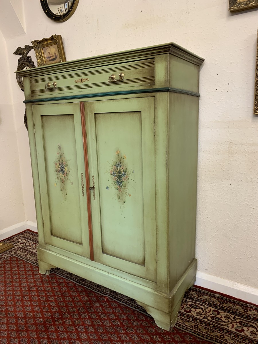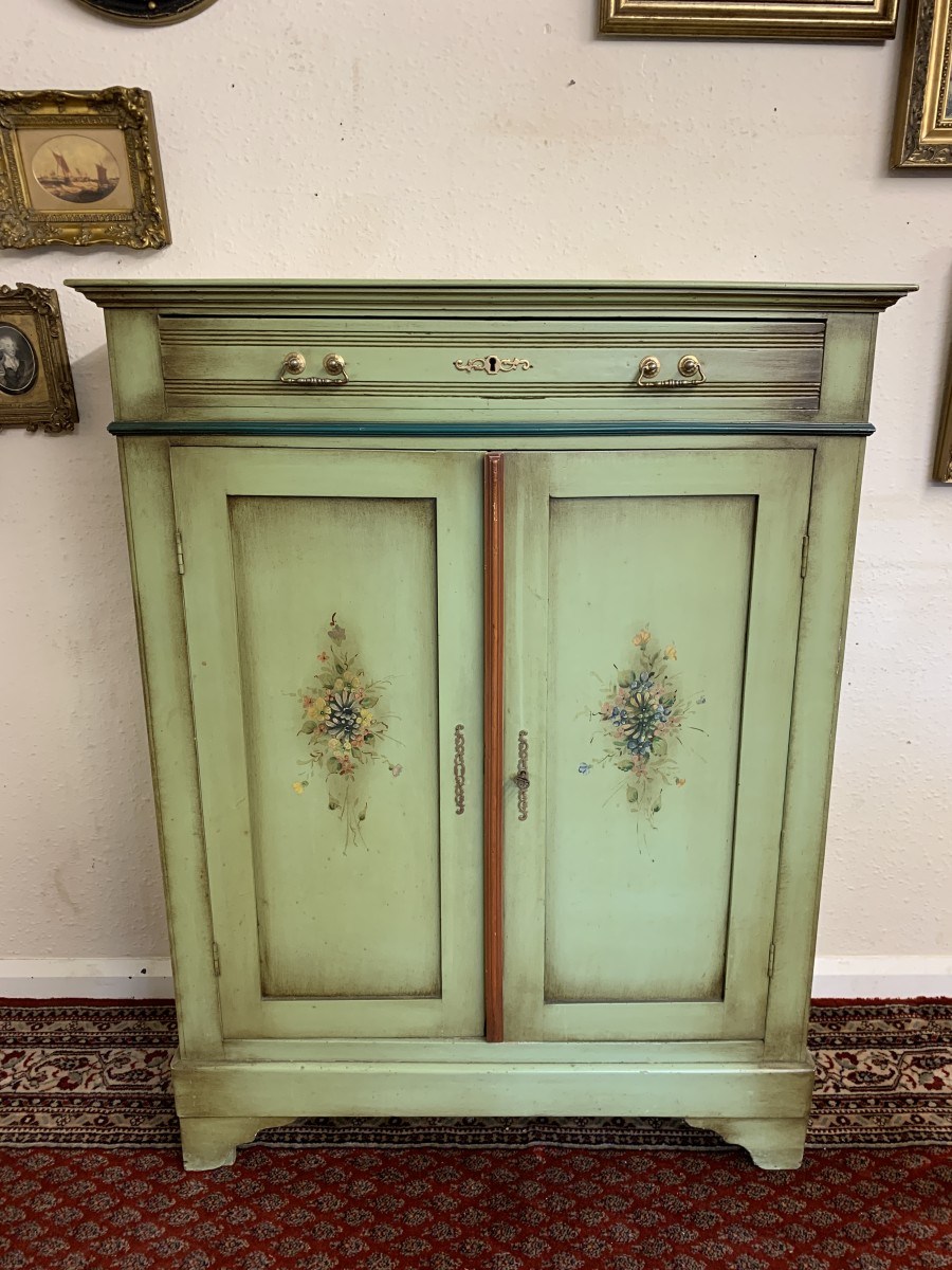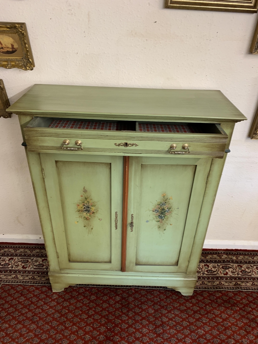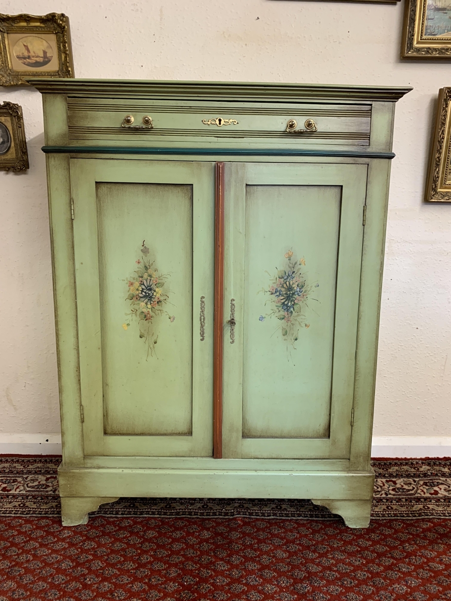 The oversailing top sits above a drawer, the drawer having a pair of brass handles. Below are a pair of lockable doors, each door having a flower painted recessed panelled. The doors open to reveal two shelves. The cupboard stands on bracket feet.