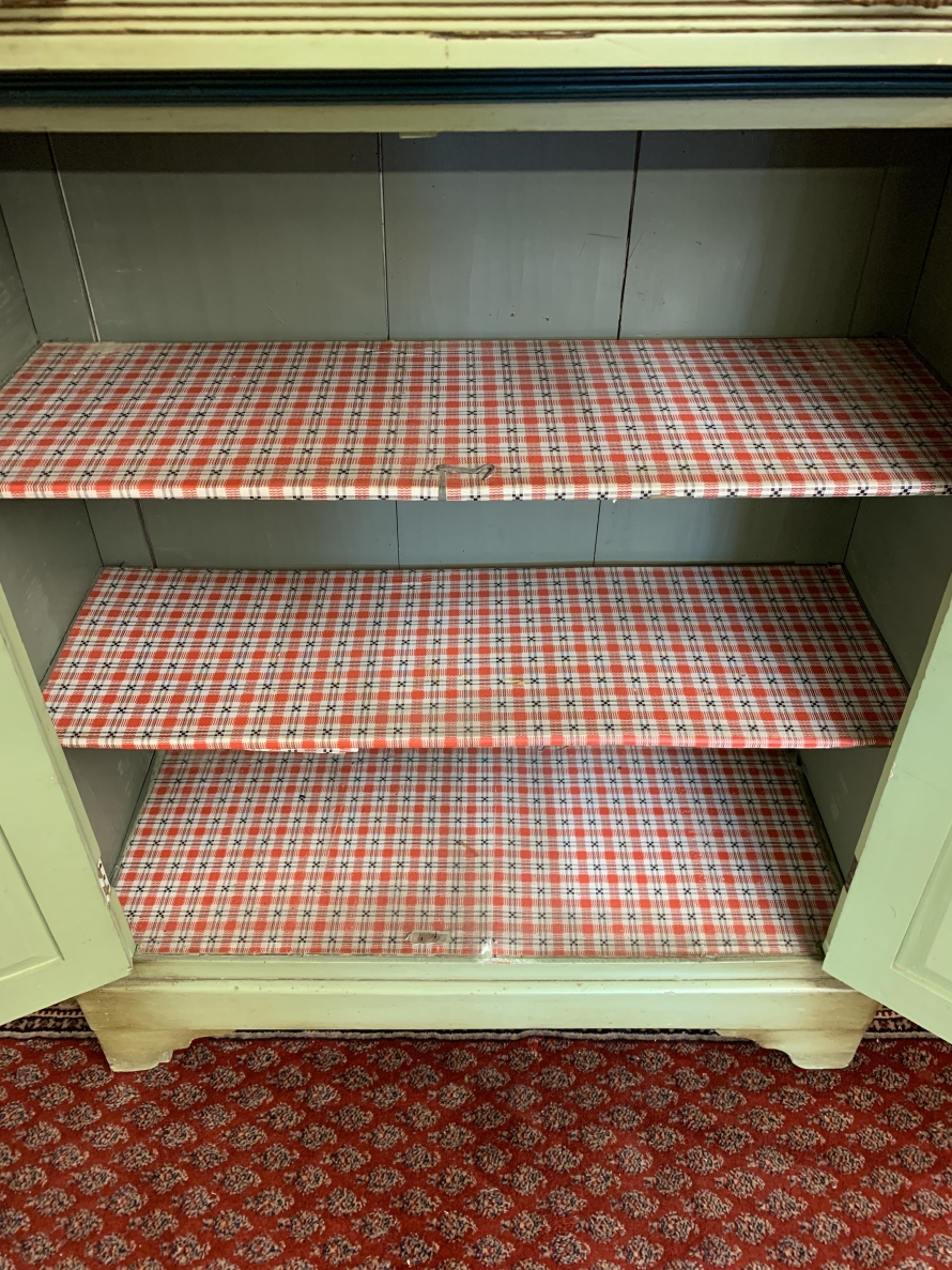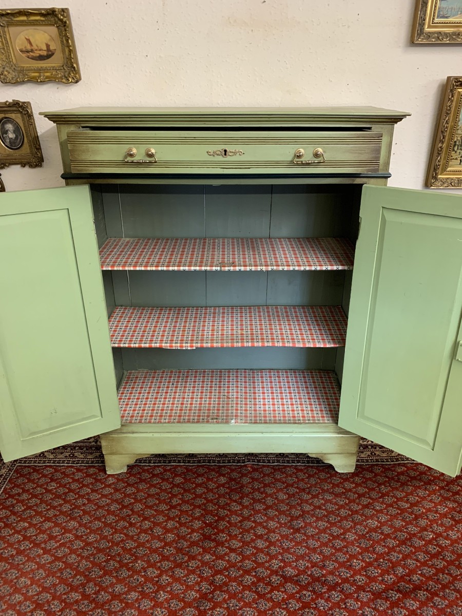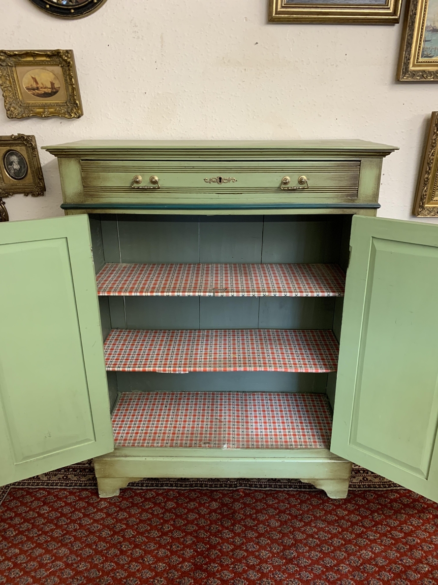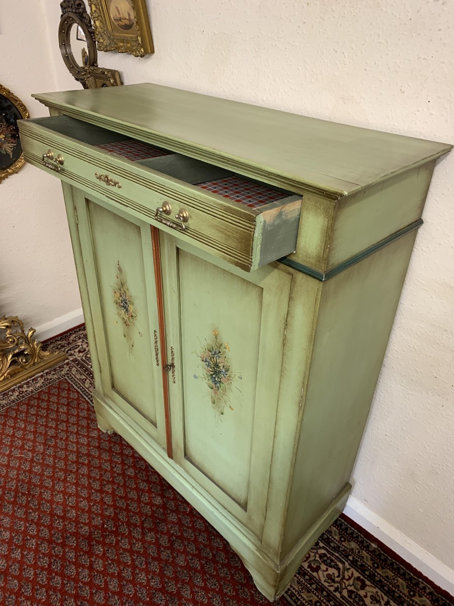 The oversailing top sits above a drawer, the drawer having a pair of brass handles. Below are a pair of lockable doors, each door having a flower painted recessed panelled. The doors open to reveal two shelves. The cupboard stands on bracket feet.