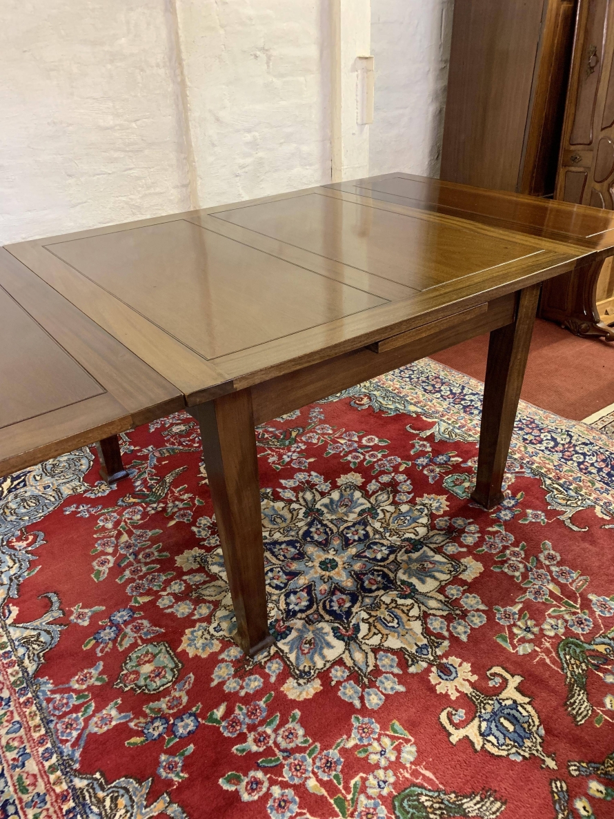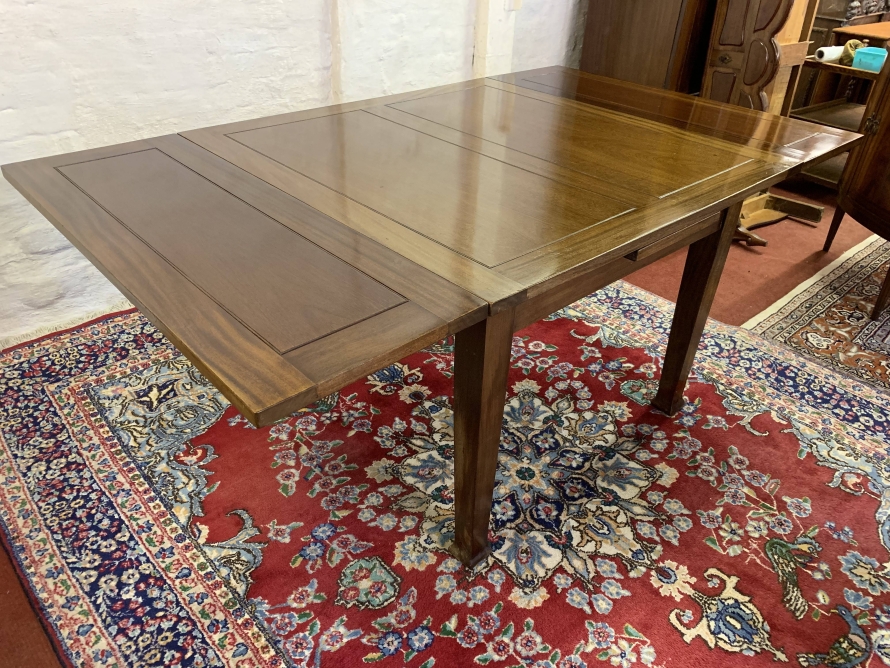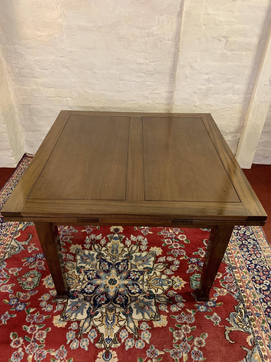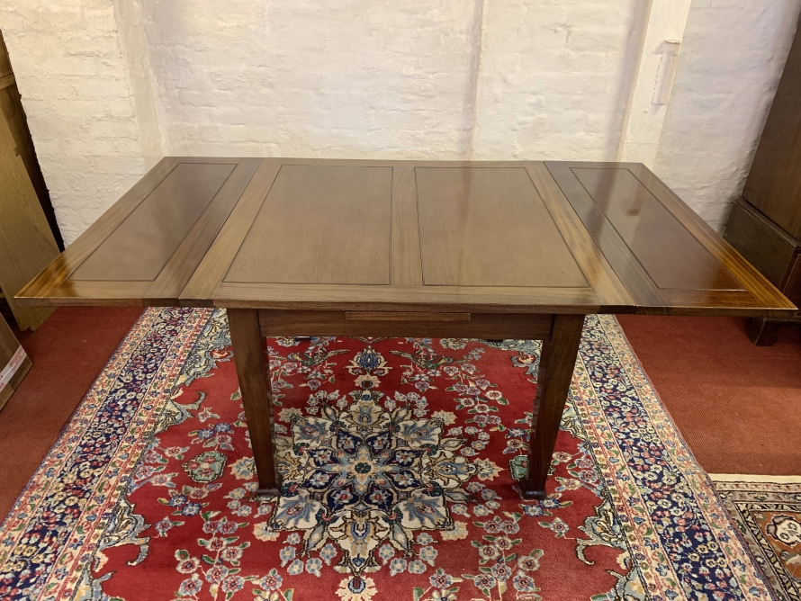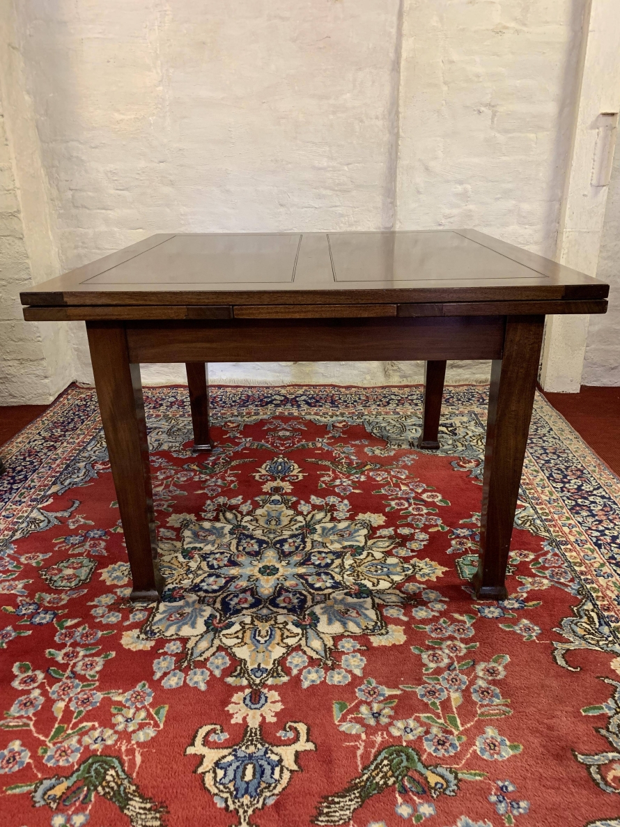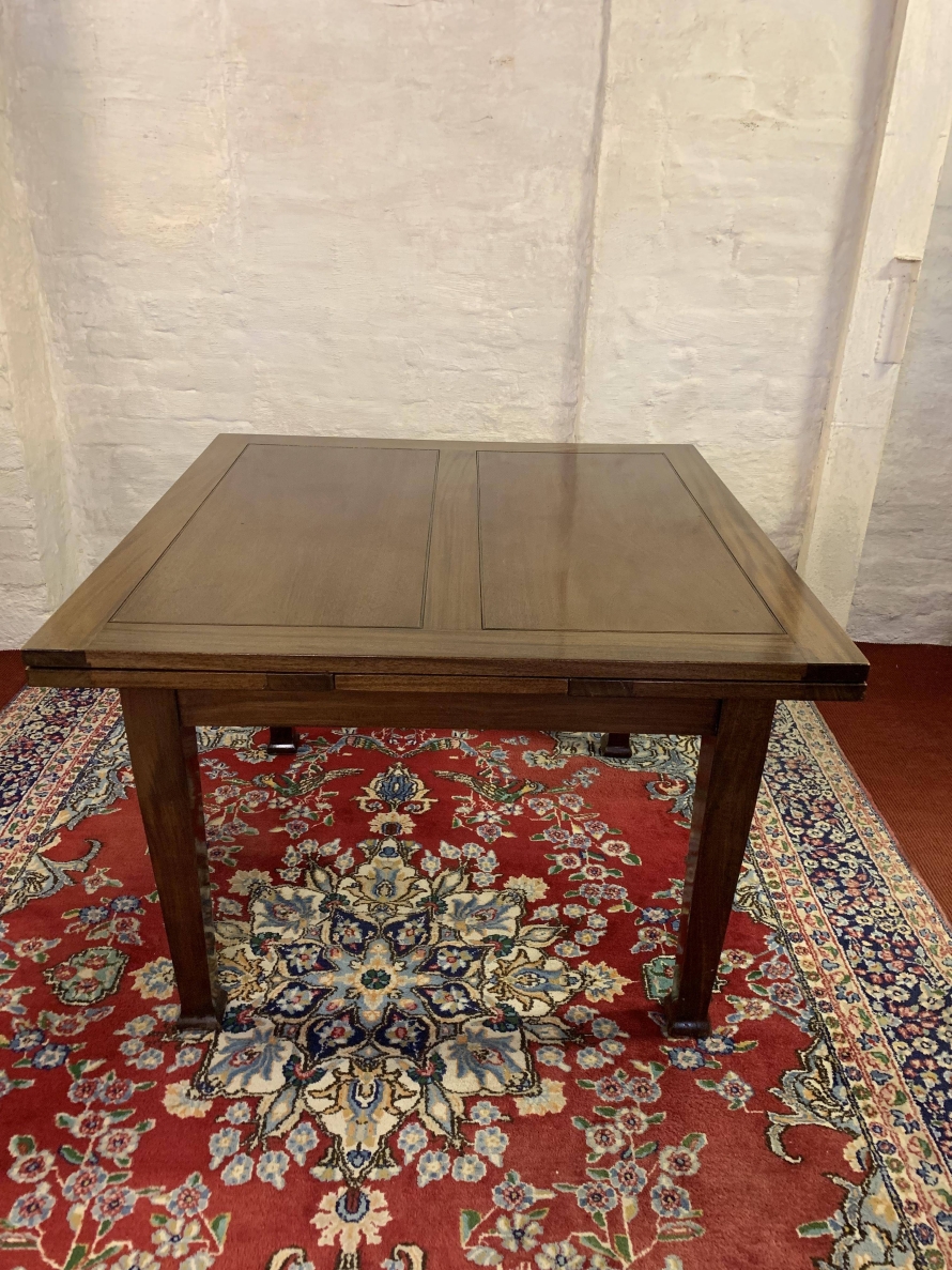 We are delighted to offer this simple yet stylish arts and crafts extending table. The table sits square when closed, it has two additional leaves which slide out from each side, when closed the leaves sit flush concealed under the table top. The table extends into a great size. The table sits solid on four tapered legs.