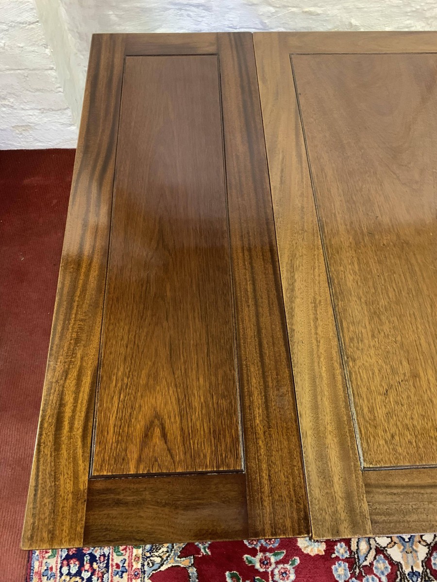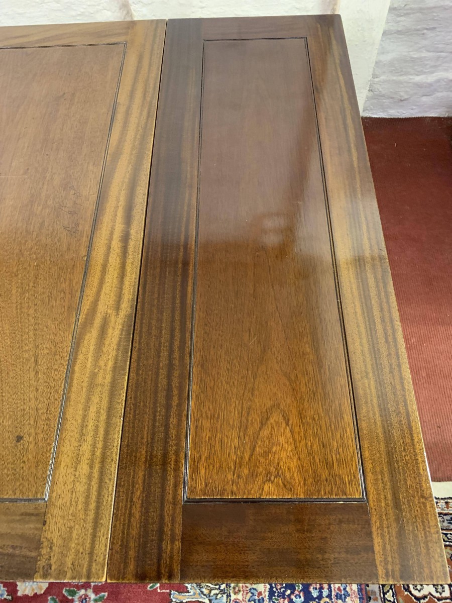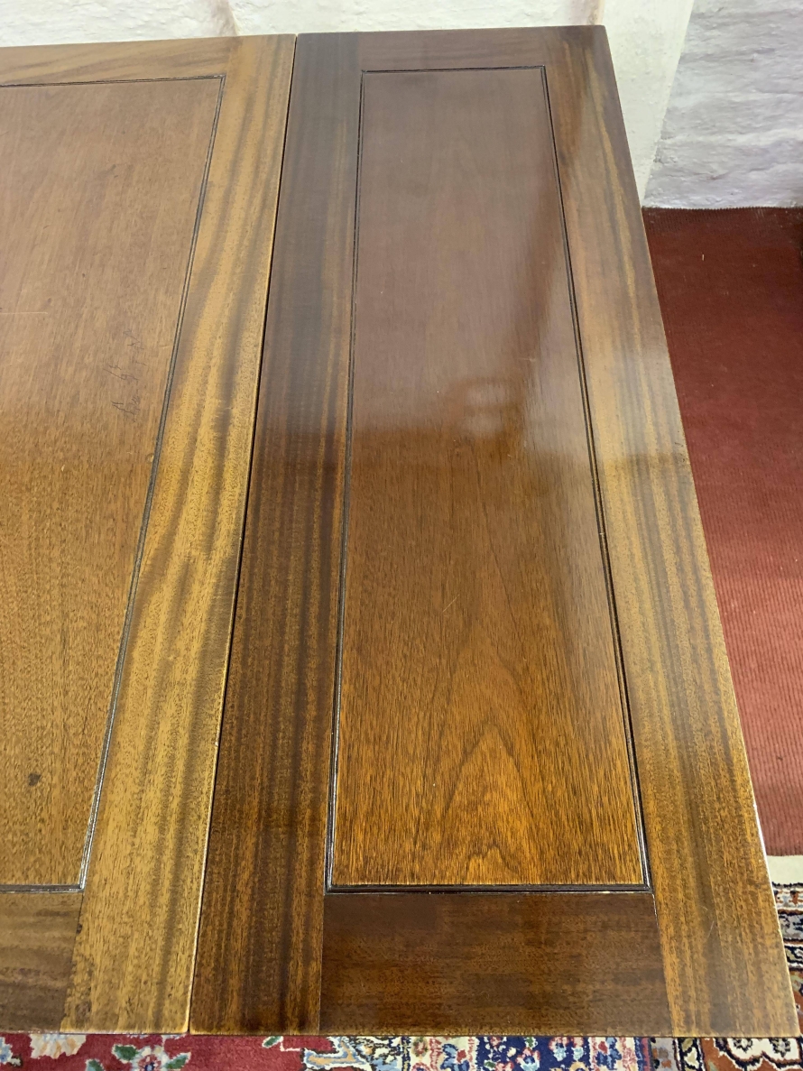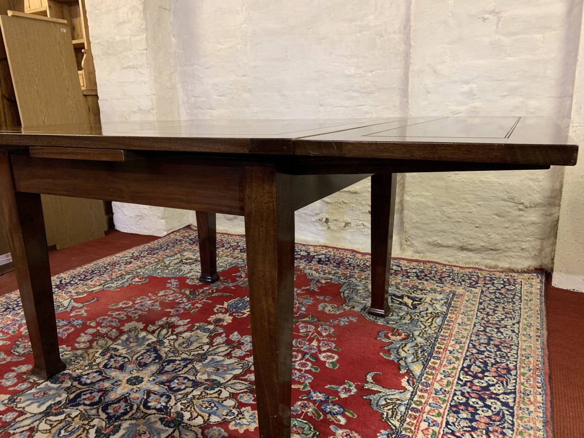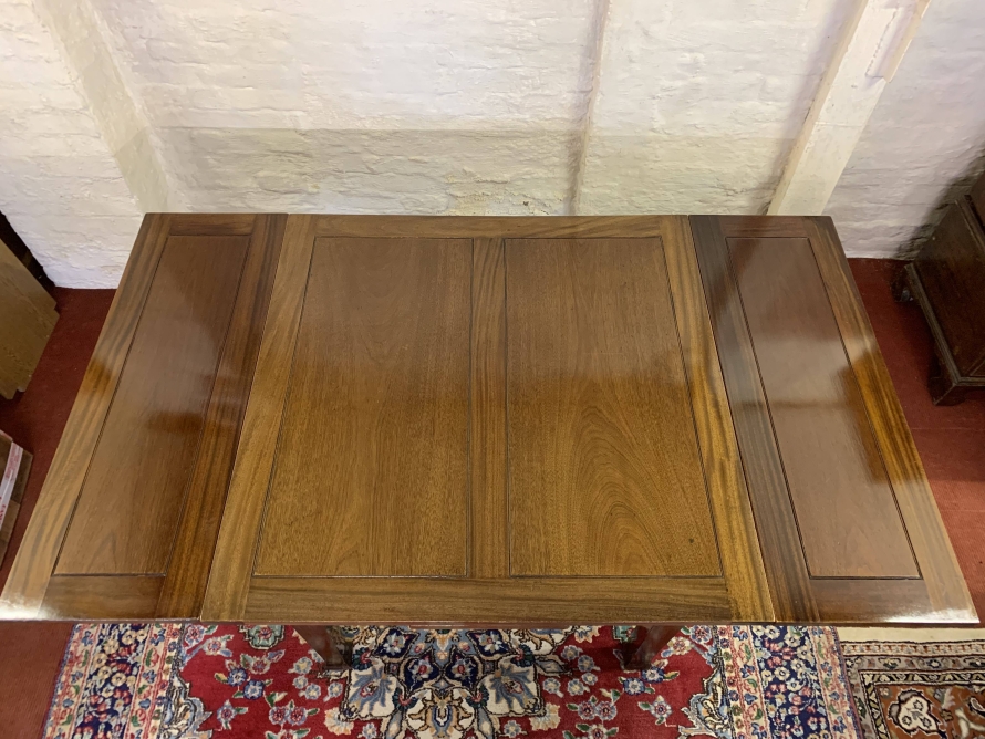 We are delighted to offer this simple yet stylish arts and crafts extending table. The table sits square when closed, it has two additional leaves which slide out from each side, when closed the leaves sit flush concealed under the table top. The table extends into a great size. The table sits solid on four tapered legs.