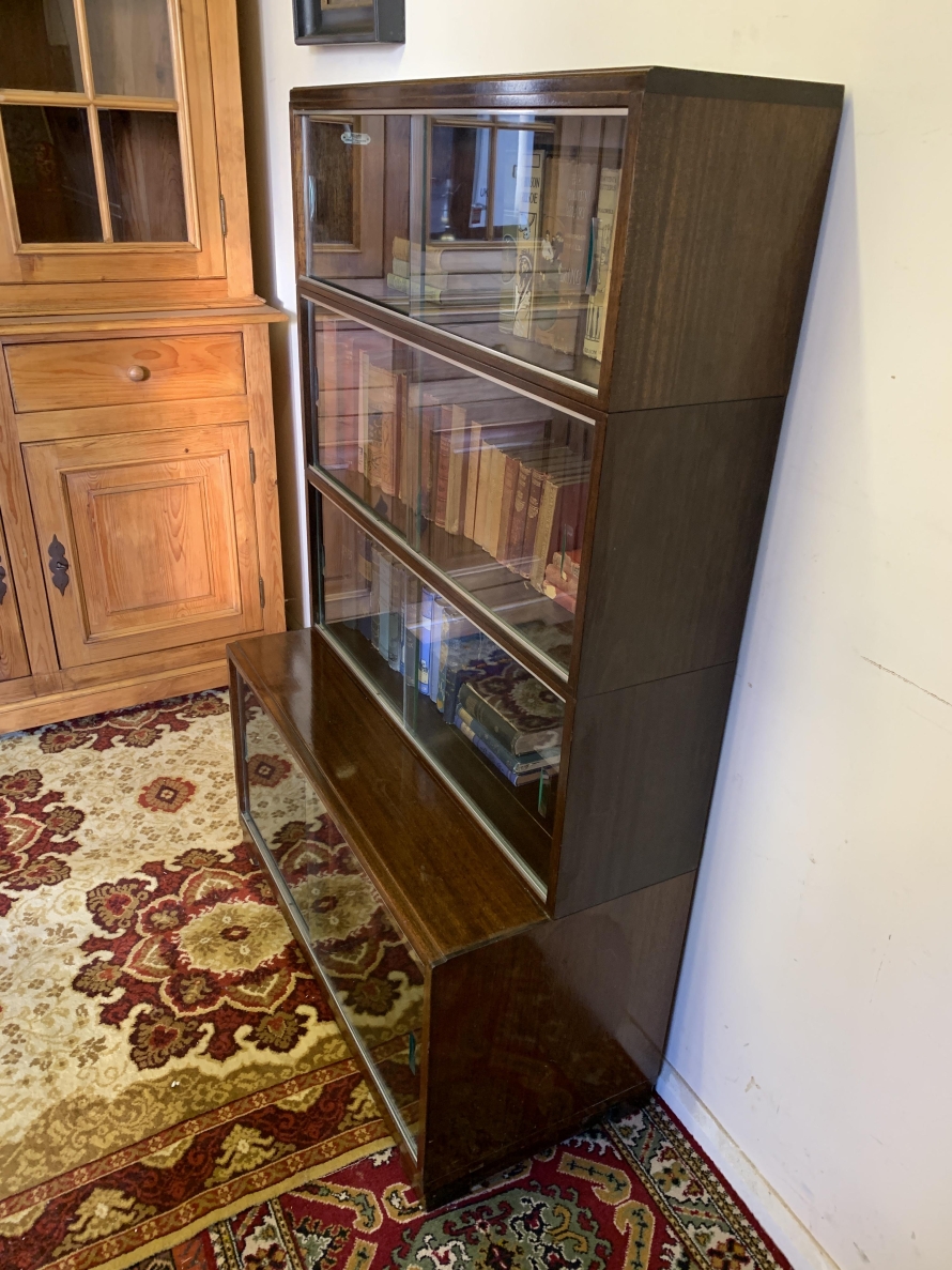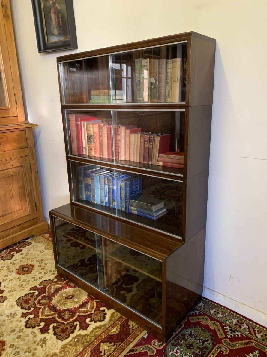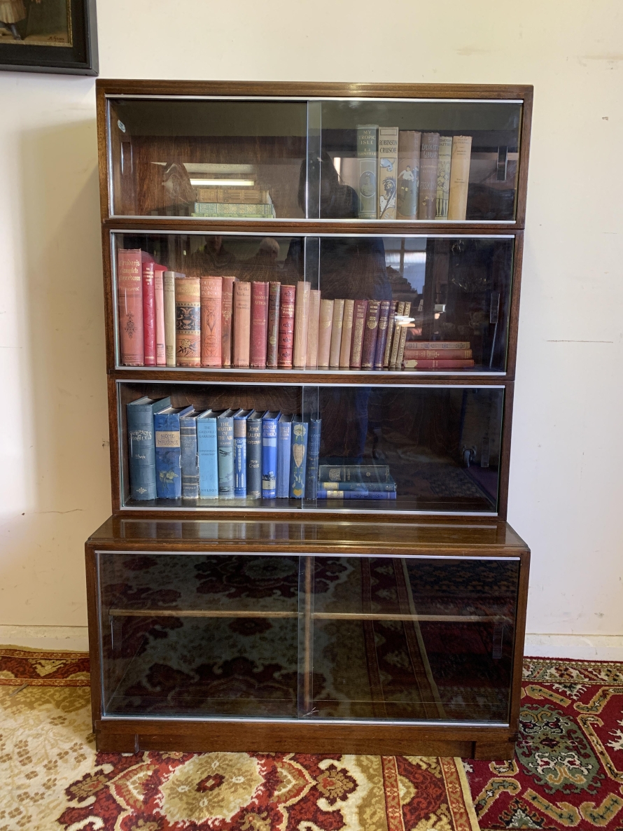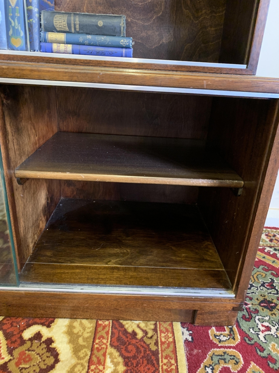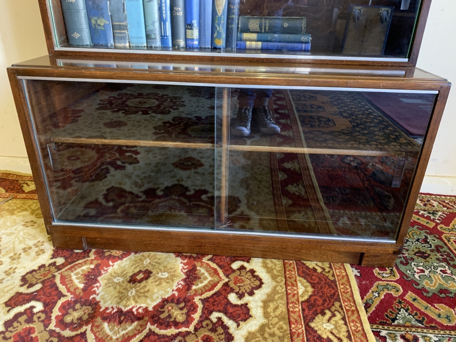 This “Miny” stacking bookcase is in fab condition. Each of the four tiers having a pair of sliding glass doors which sit in a chrome frame. The large bottom tier having a removable wooden shelf.