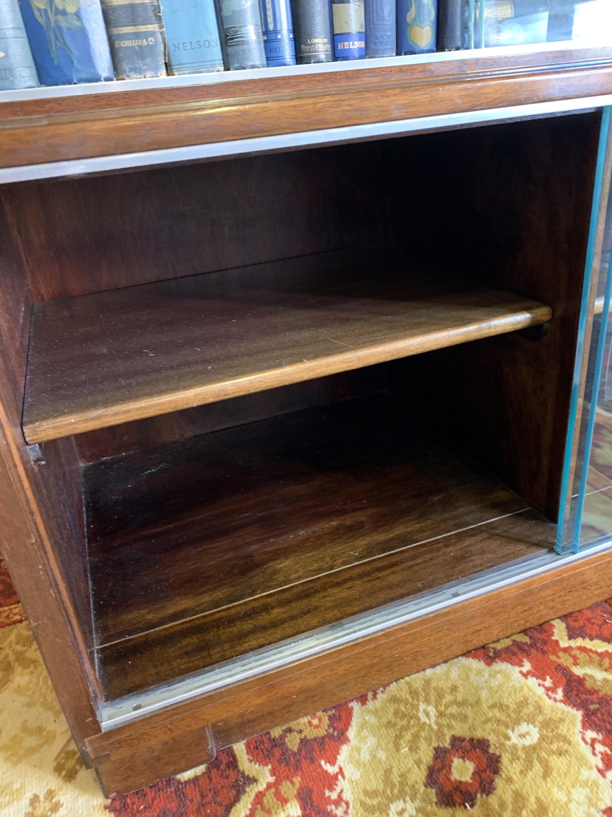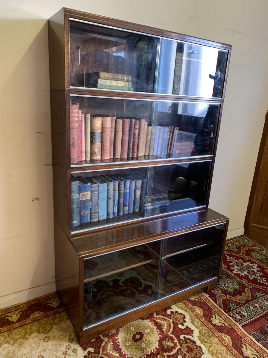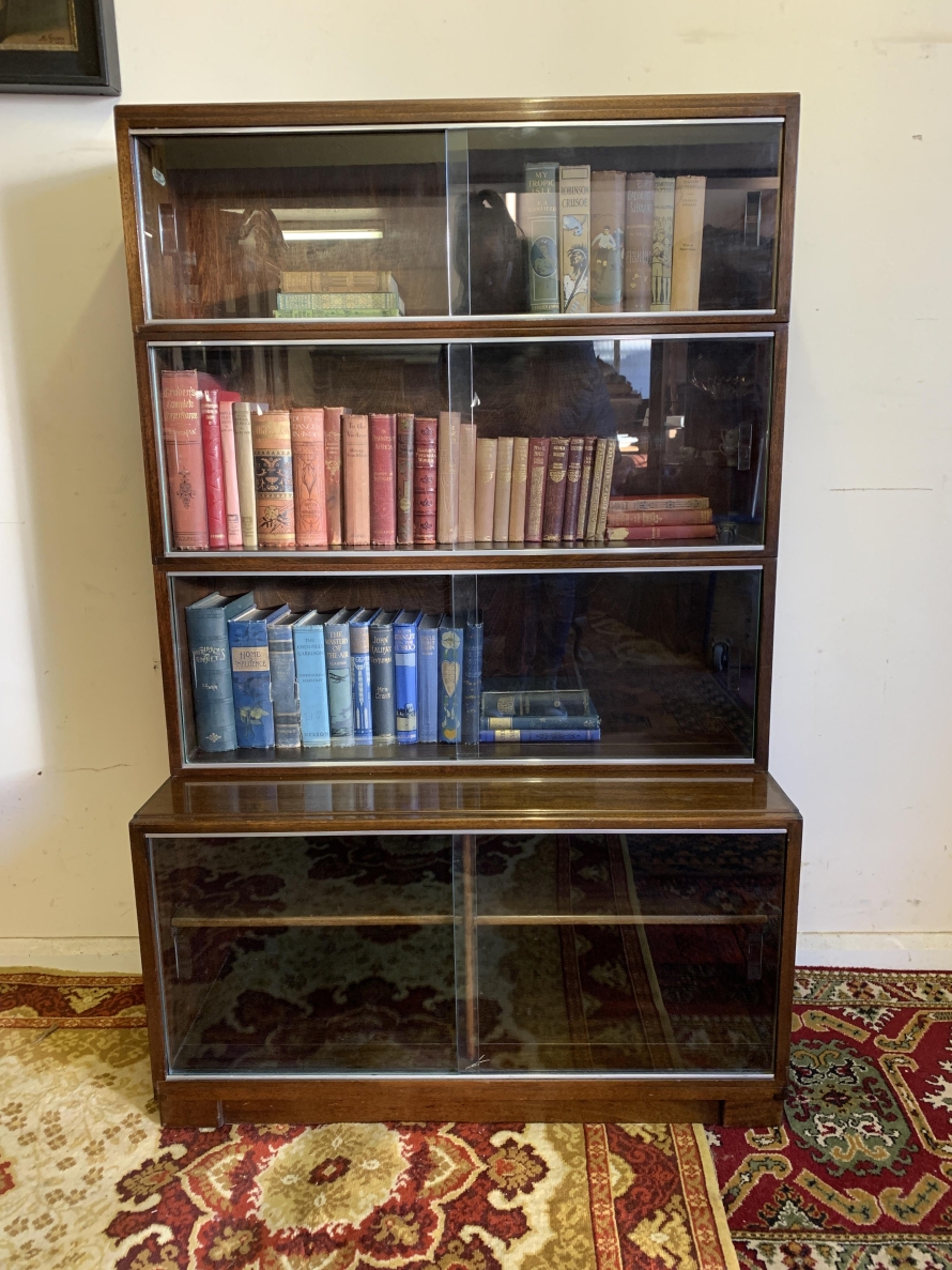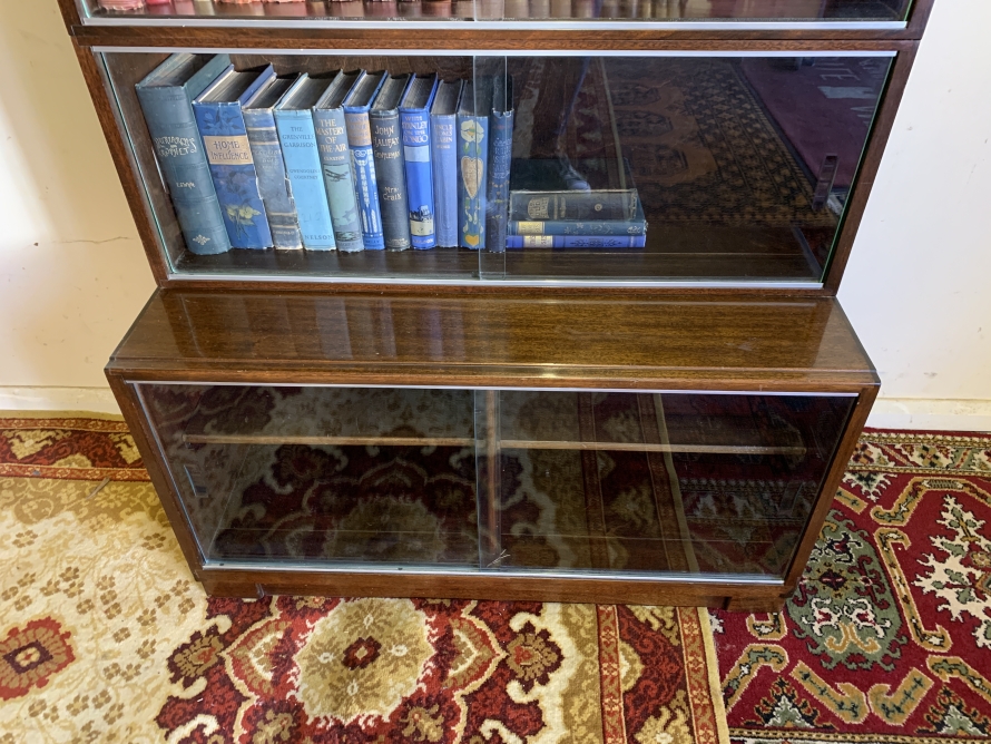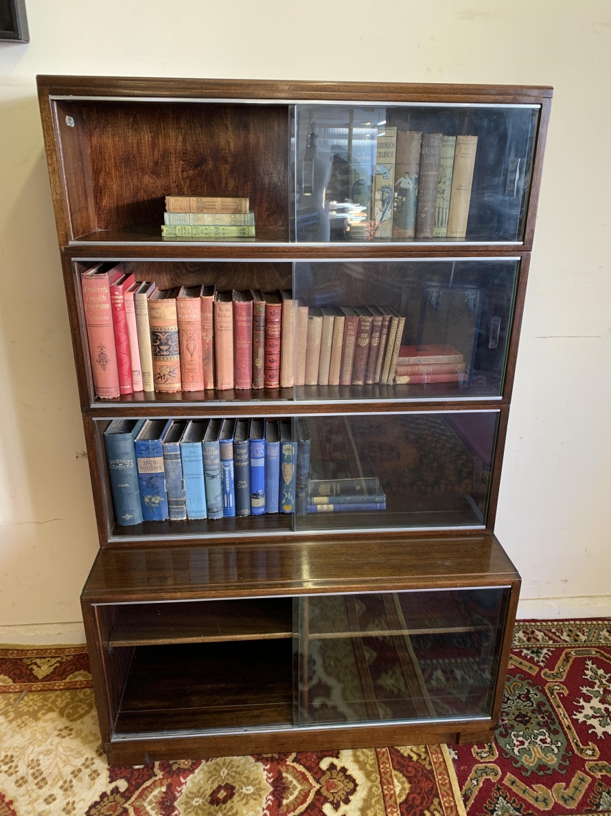 This “Miny” stacking bookcase is in fab condition. Each of the four tiers having a pair of sliding glass doors which sit in a chrome frame. The large bottom tier having a removable wooden shelf.