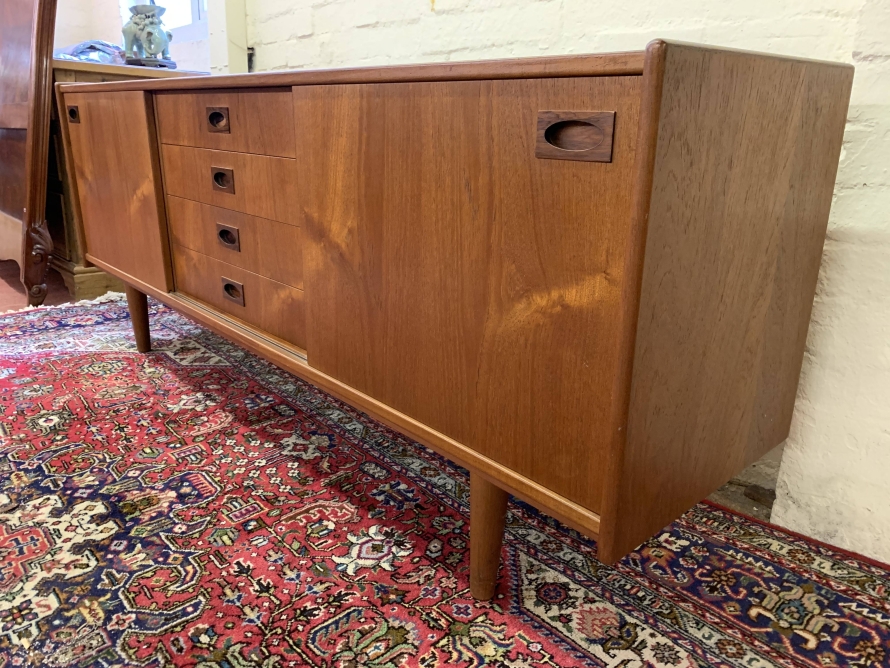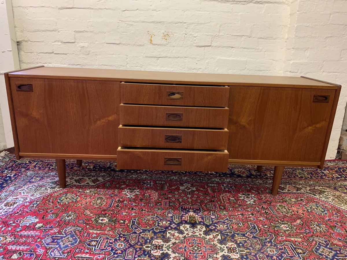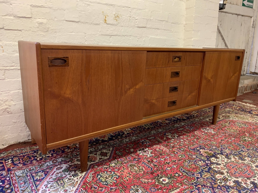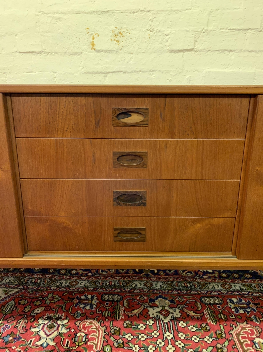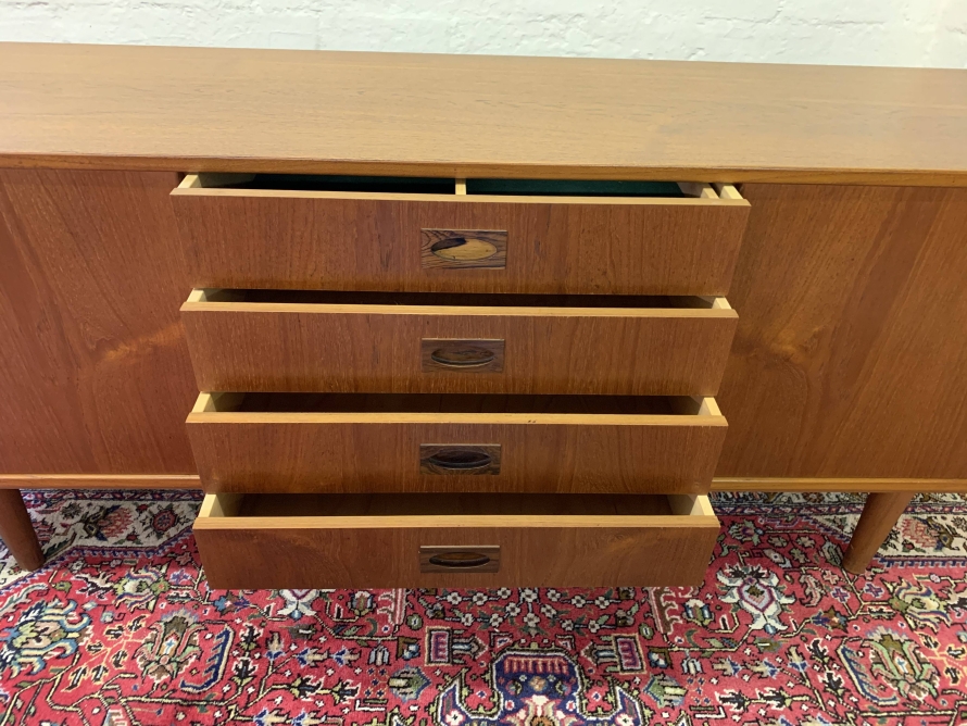This beautifully designed teak sideboard was manufactured in Denmark by Morgen Kohl MK. The sideboard is in excellent condition, the grain of the teak is exceptional. The four easy sliding central drawers each have a stylish teak finger handle. To the sides are a pair of sliding cupboard doors, each door slides open to reveal a removable shelf. This retro sideboard stands on four turned legs.