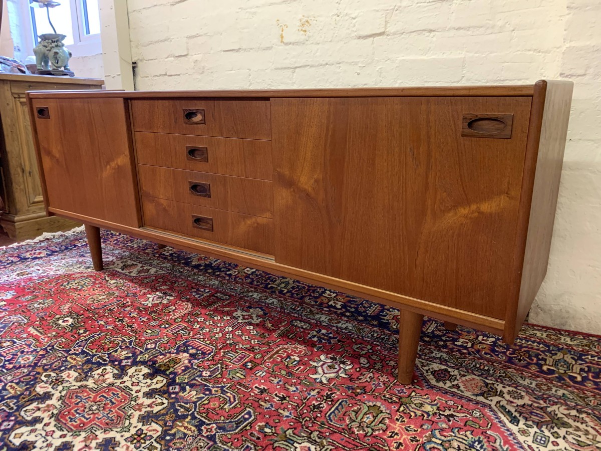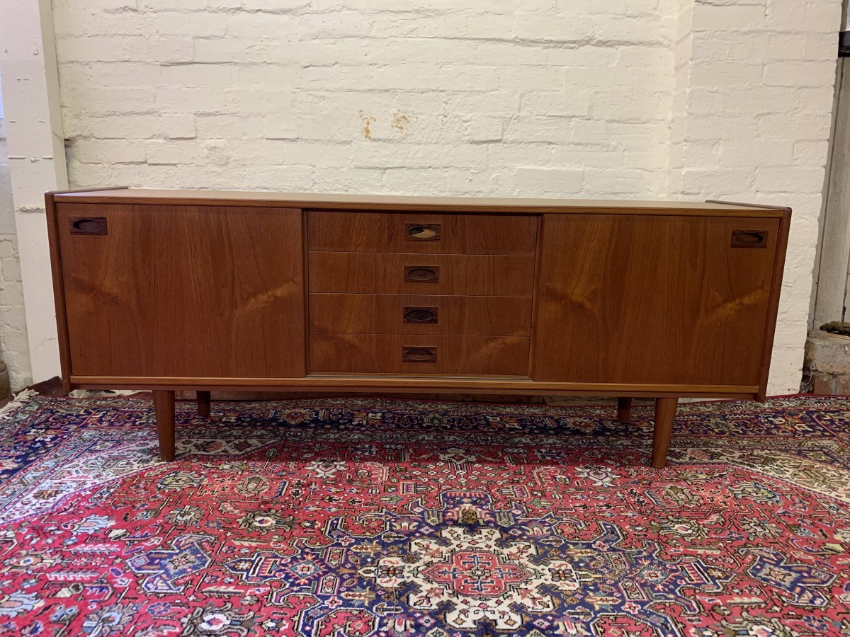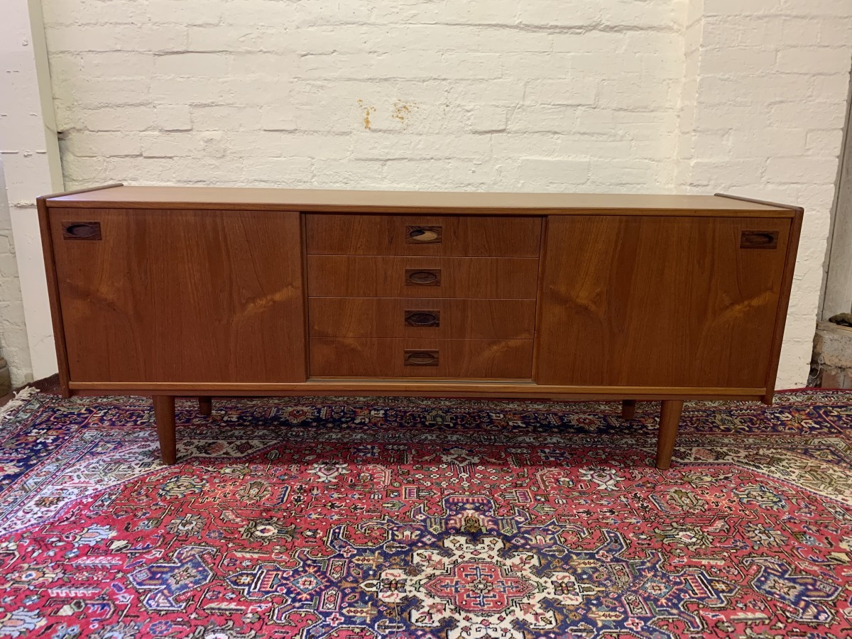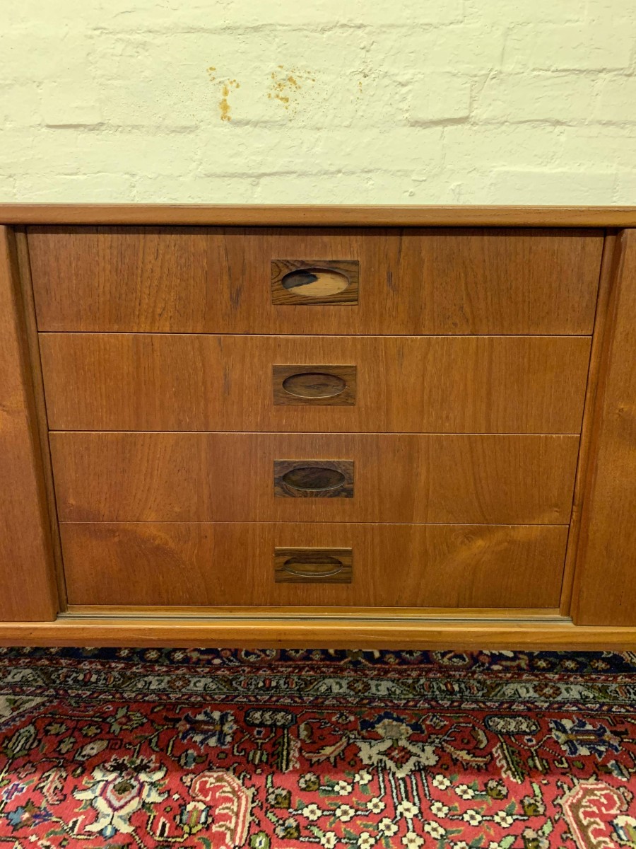 This beautifully designed teak sideboard was manufactured in Denmark by Morgen Kohl MK. The sideboard is in excellent condition, the grain of the teak is exceptional. The four easy sliding central drawers each have a stylish teak finger handle. To the sides are a pair of sliding cupboard doors, each door slides open to reveal a removable shelf. This retro sideboard stands on four turned legs.